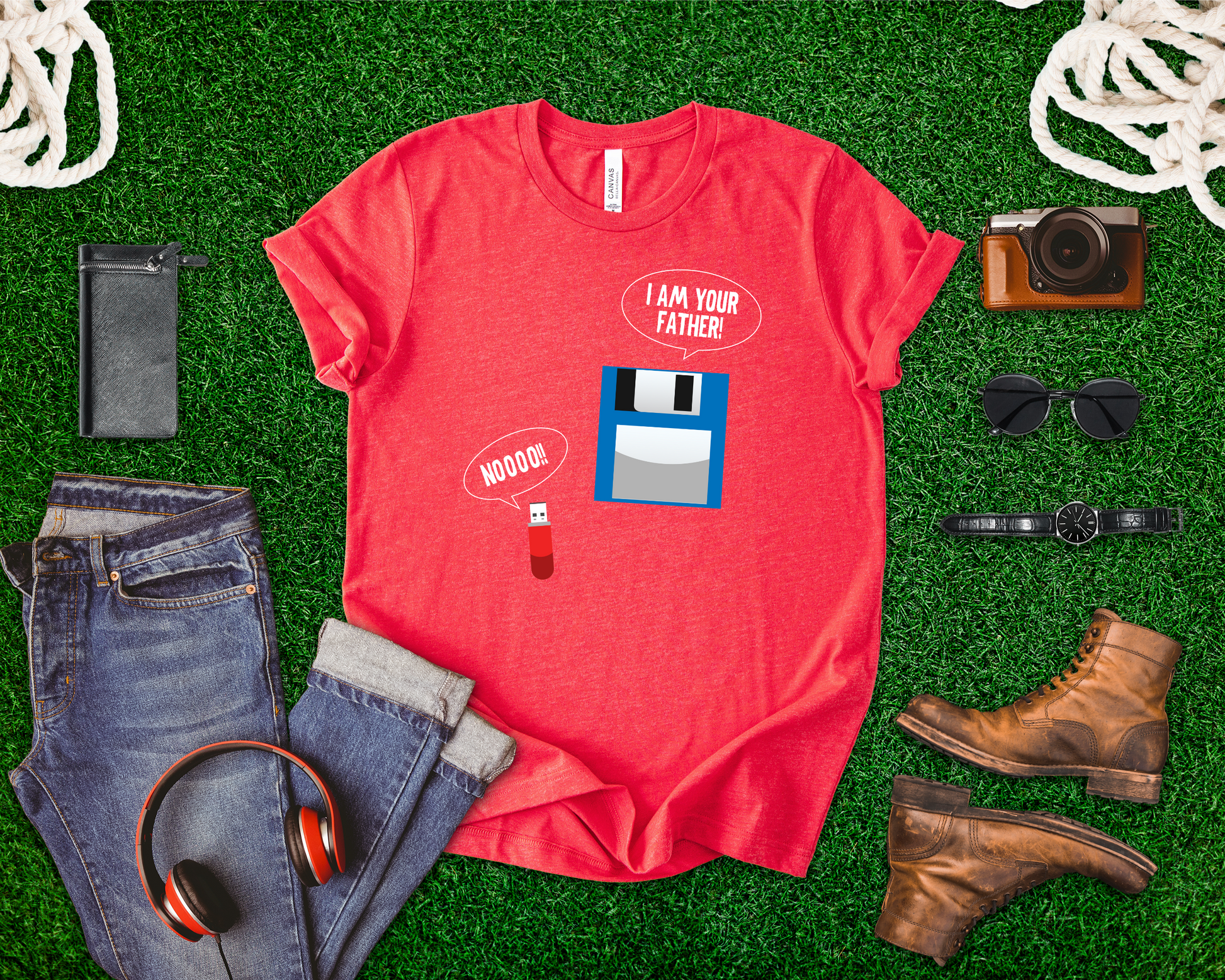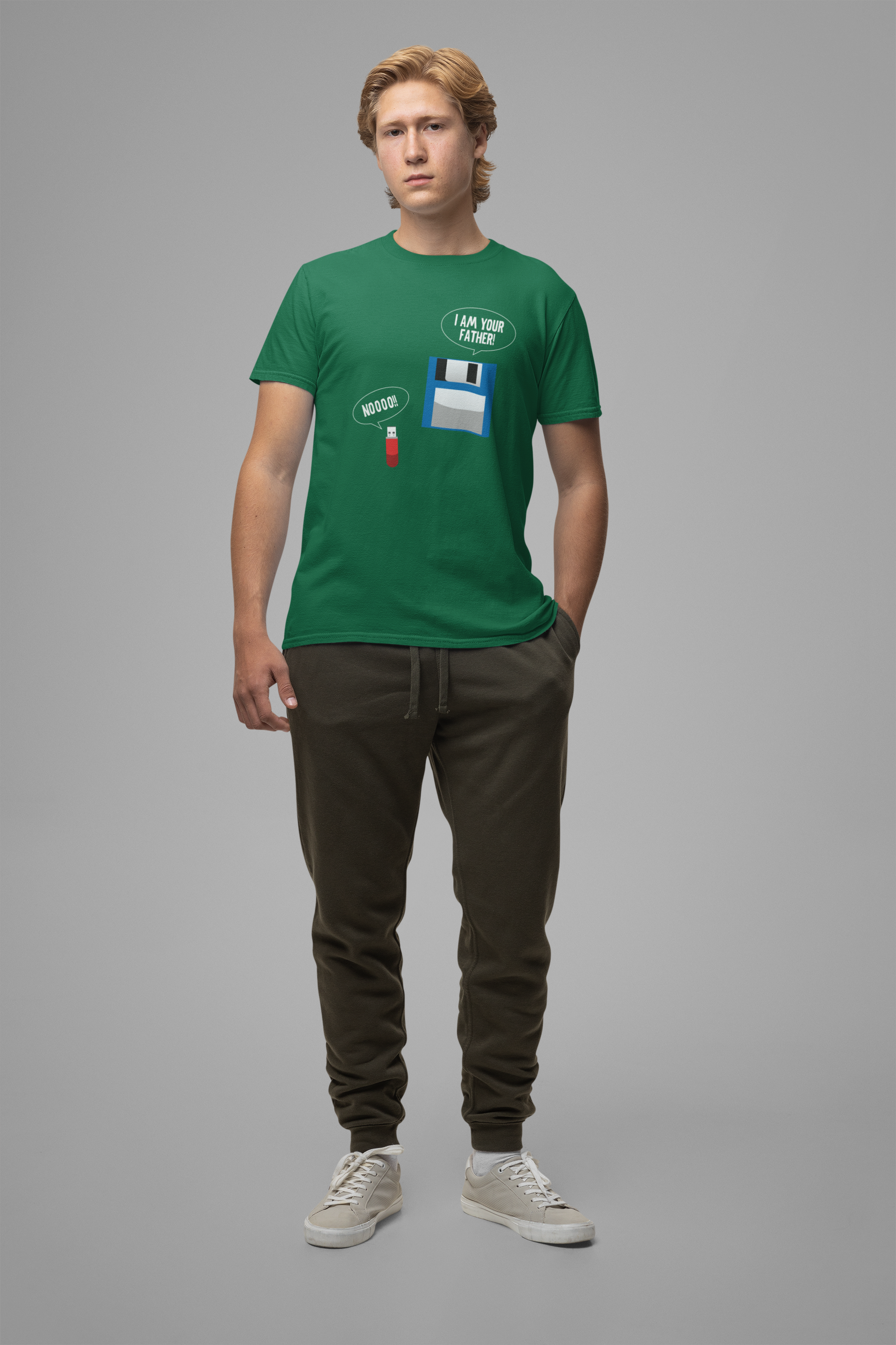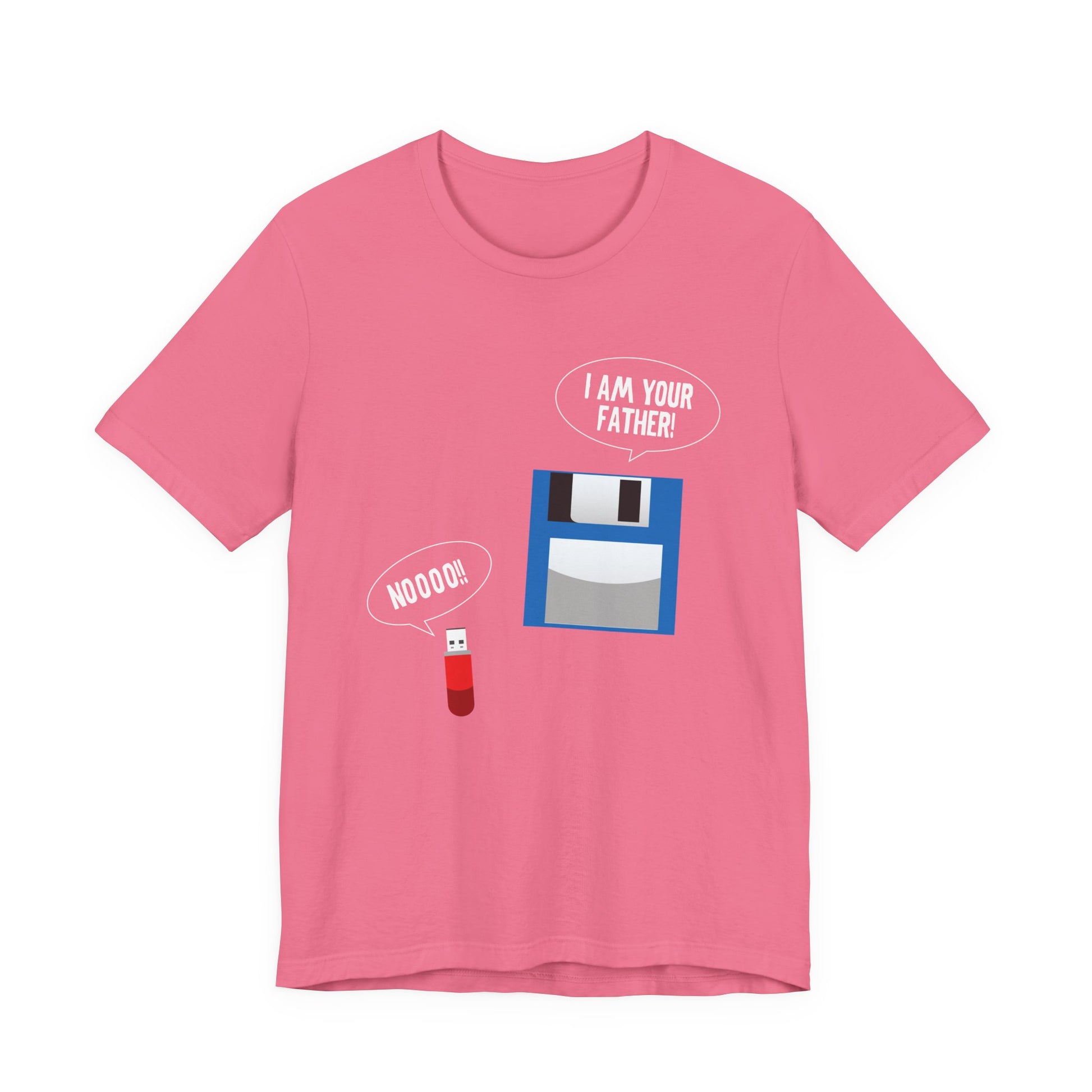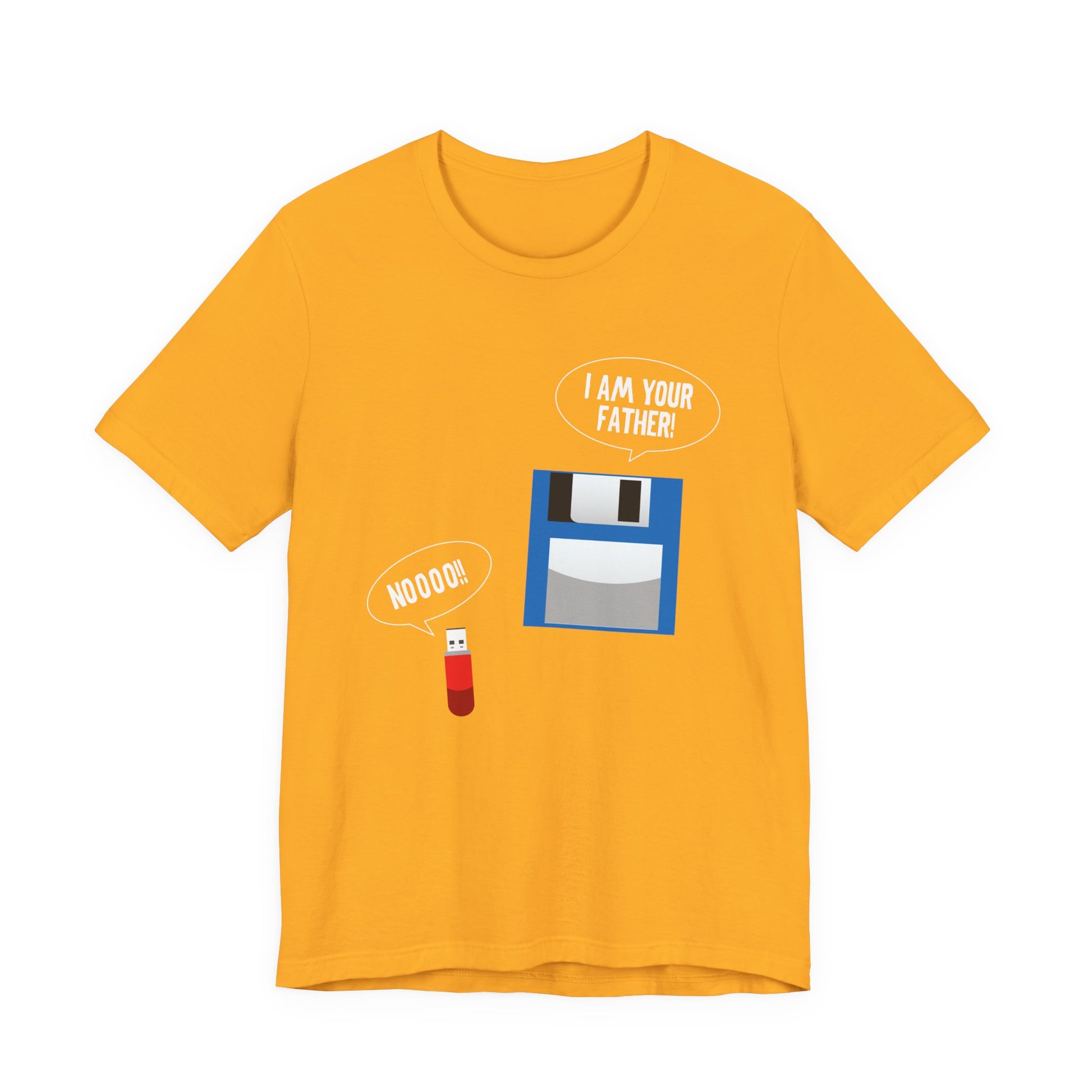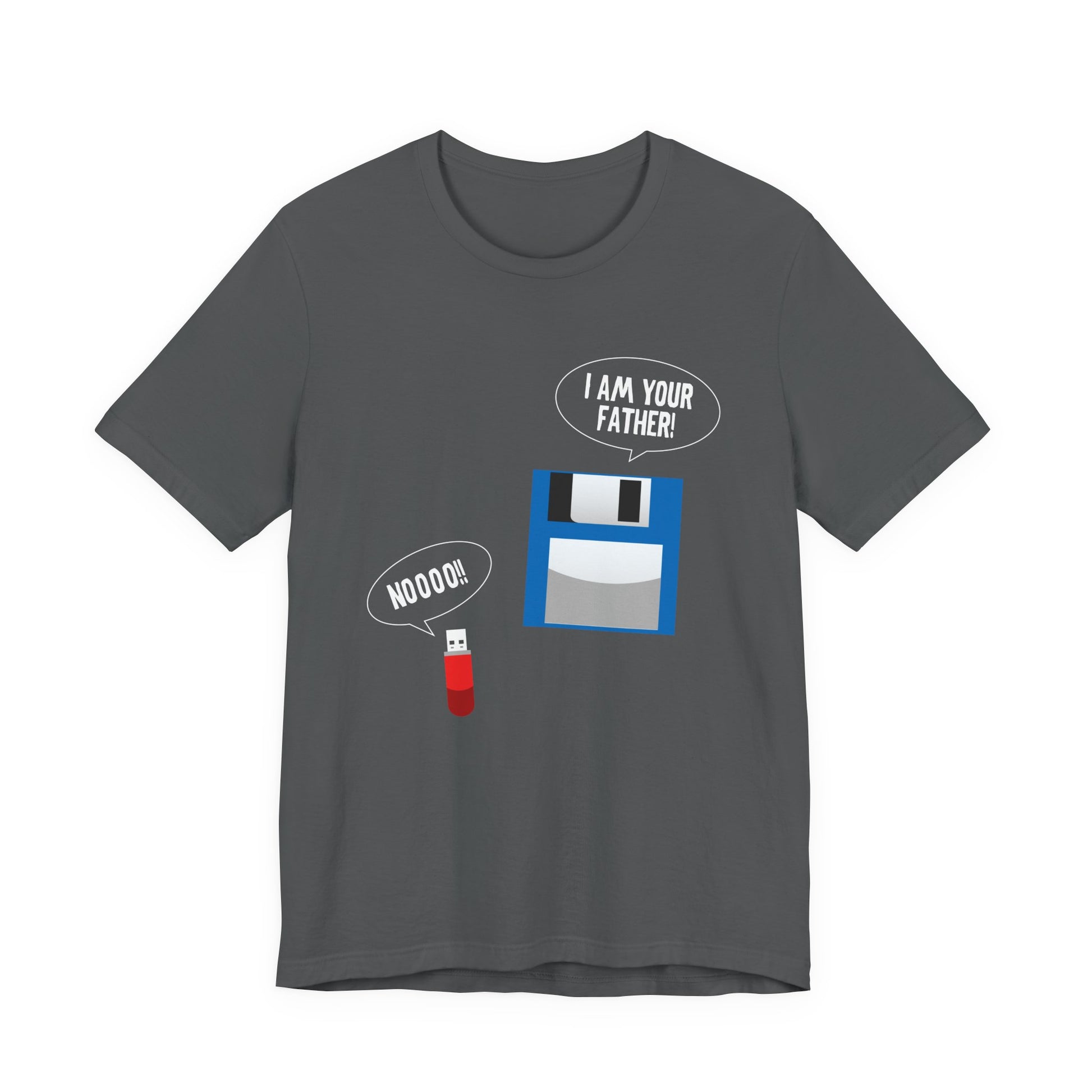 Bring some geeky nostalgia to your wardrobe with this hilarious retro tech parody tee. Featuring a floppy disk declaring "I’m your Father" to a modern USB thumb drive replying "No," this design is perfect for tech lovers, IT professionals, computer nerds, and anyone who remembers the floppy disk era. A fun and clever gift for birthdays, office humor, or everyday wear.