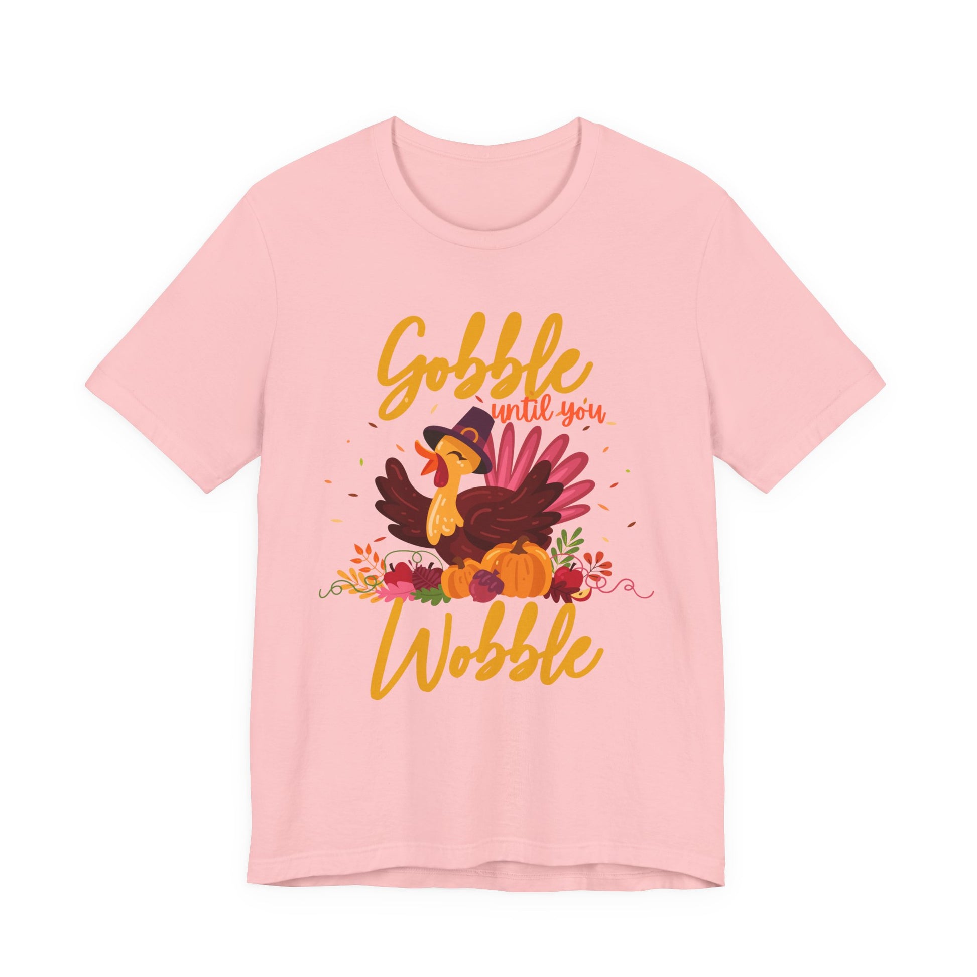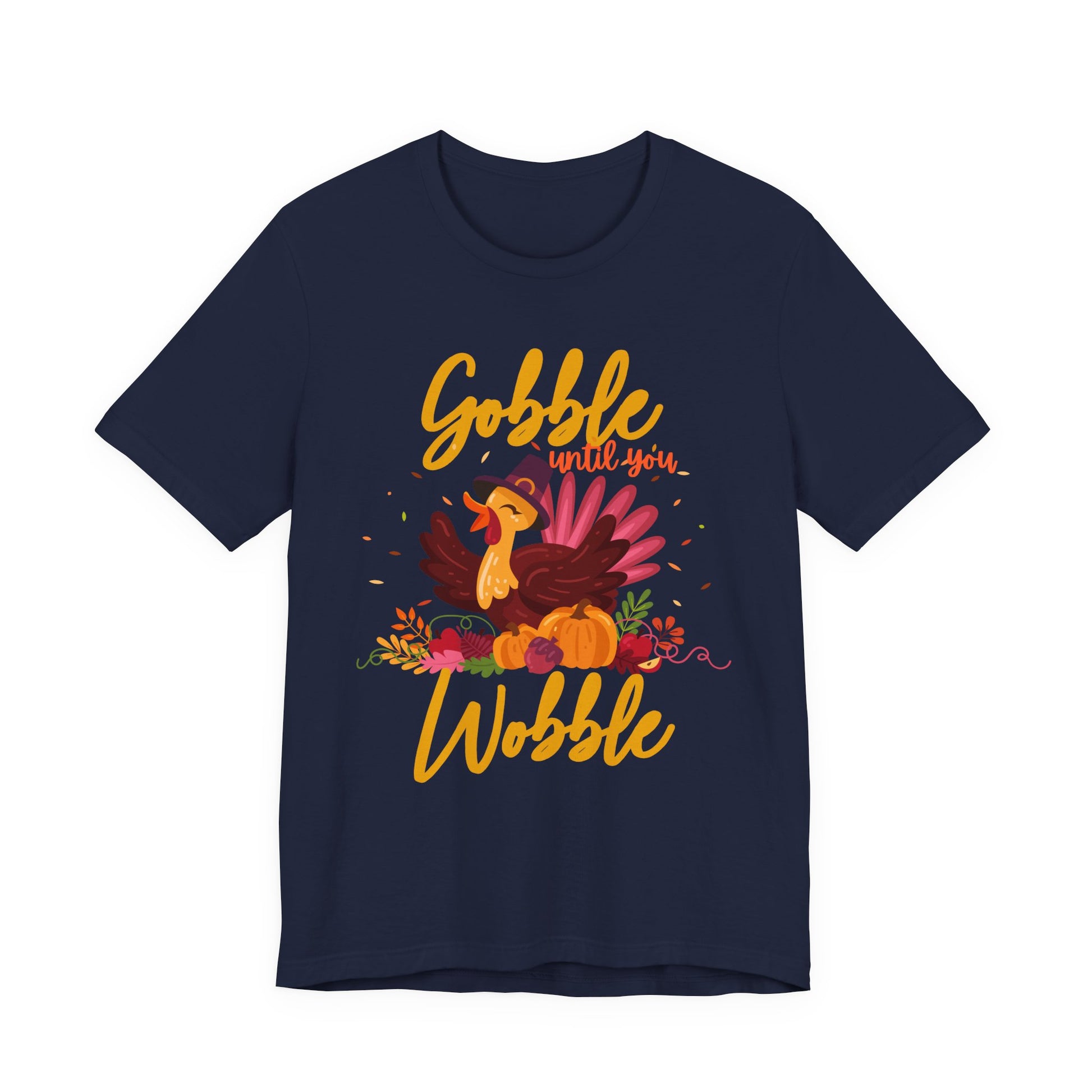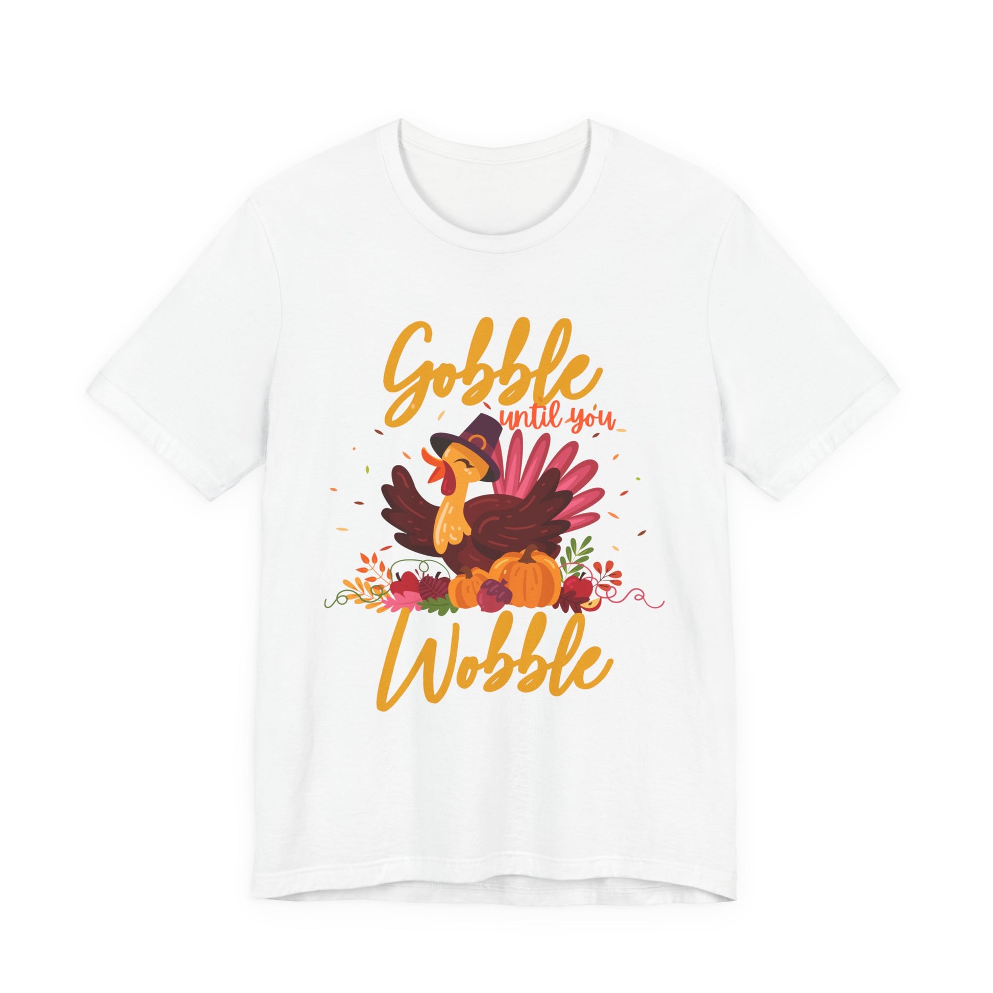 Celebrate Thanksgiving in style with this fun and festive “Gobble Until You Wobble” t-shirt featuring a big turkey wearing a hat, spreading its feathers, and surrounded by fruits and pumpkins. This playful design captures the joyful spirit of the holiday—perfect for family dinners, Friendsgiving parties, or anyone who loves a good feast and laughter. Crafted from soft, comfortable fabric, it’s a great choice for both casual and celebratory wear.