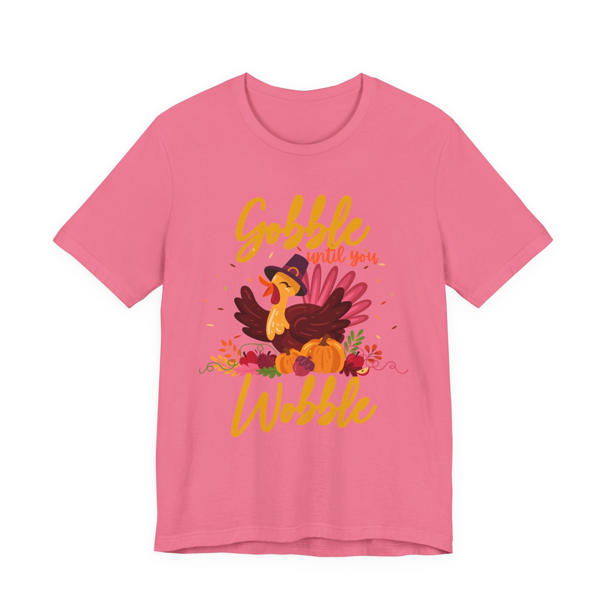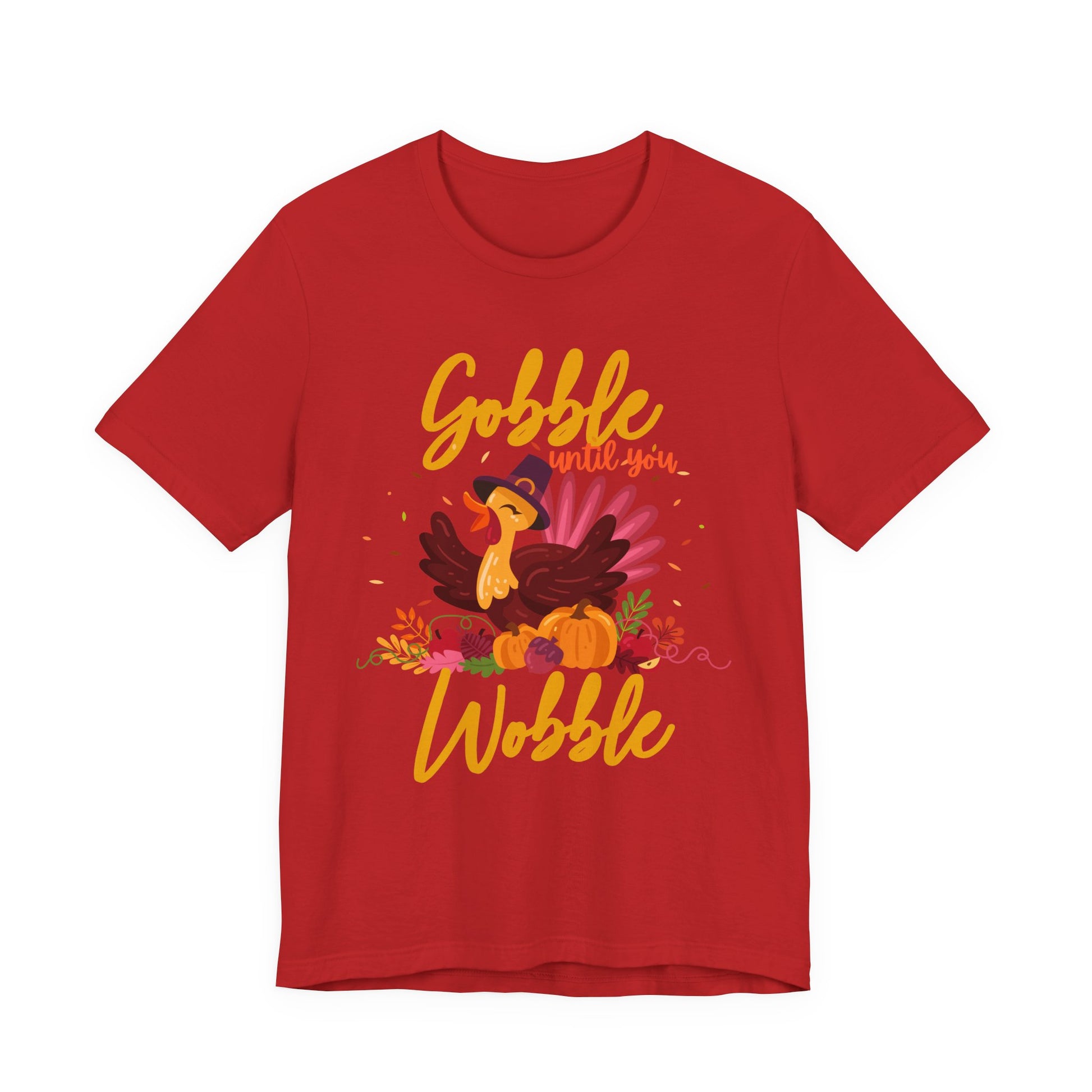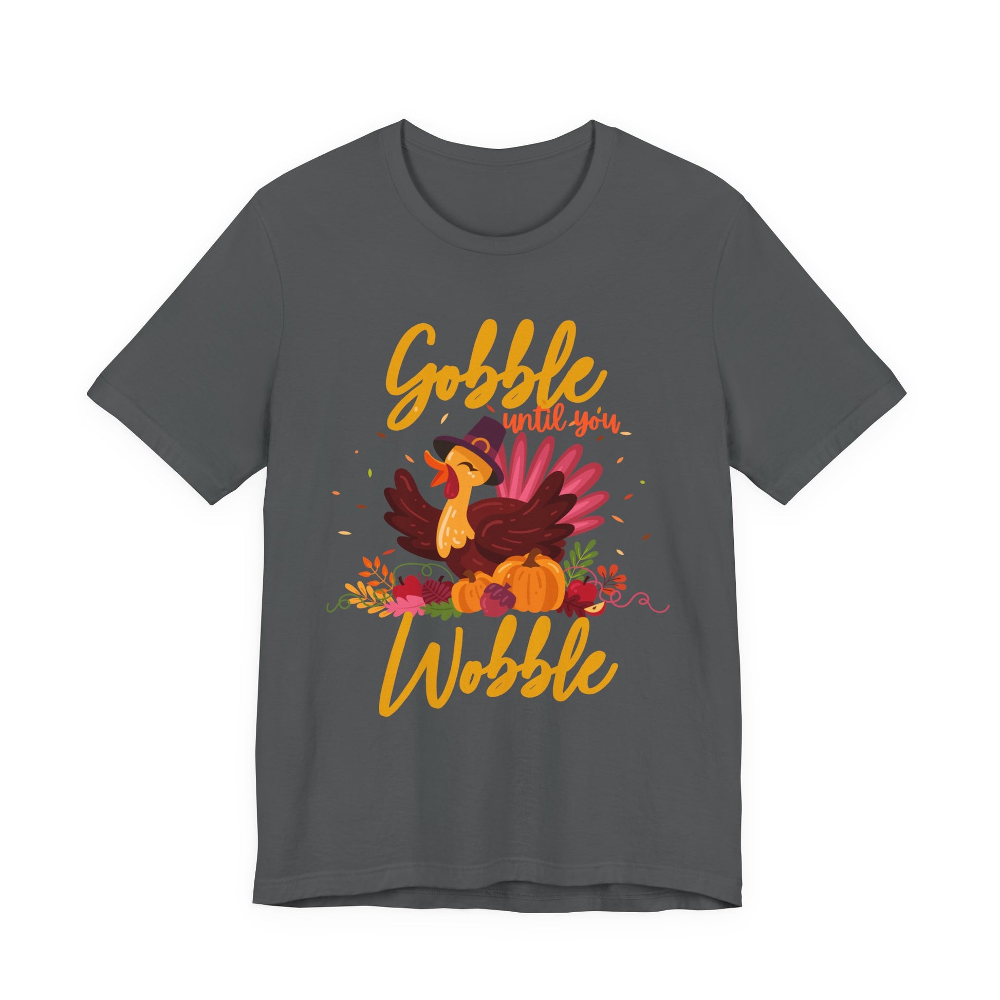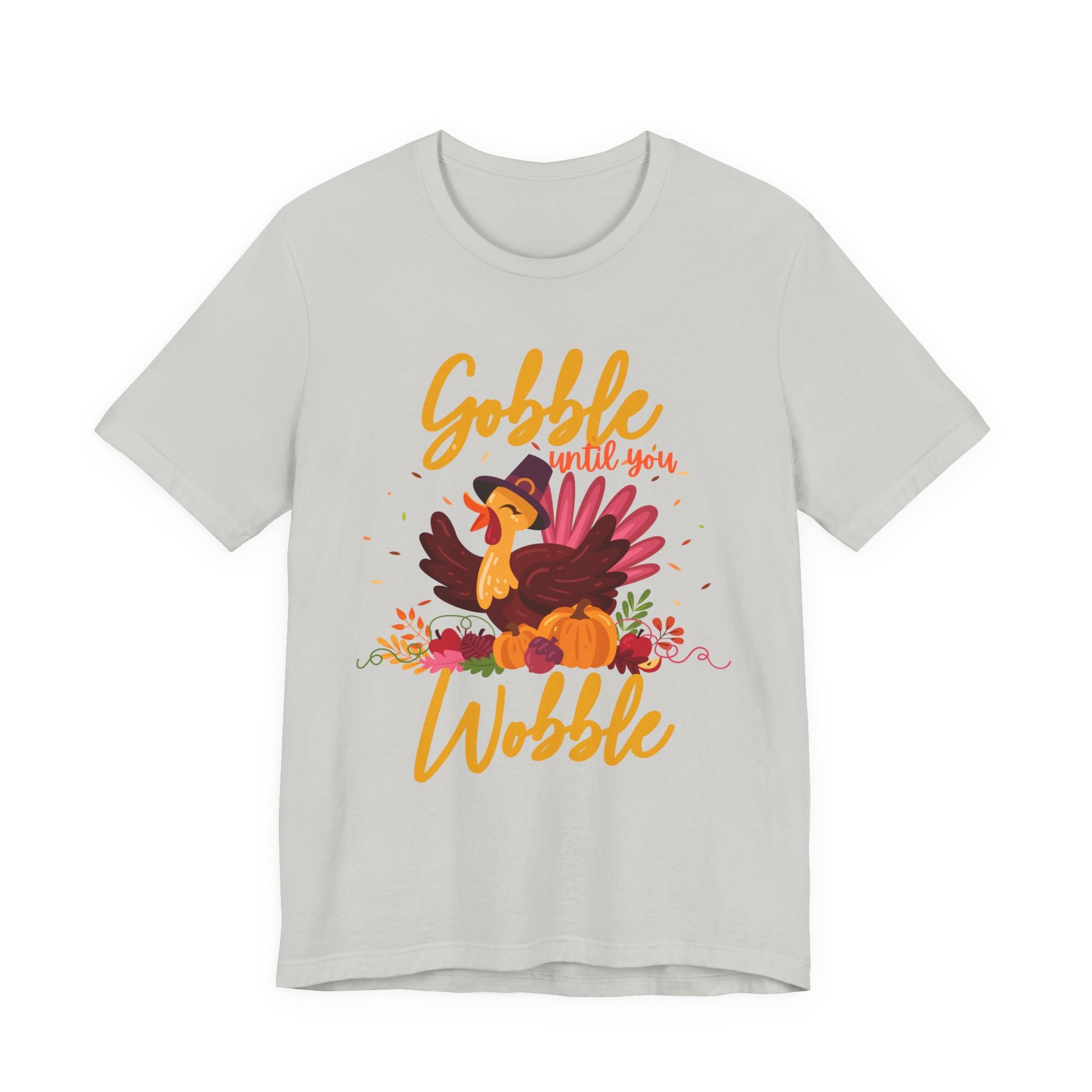 Celebrate Thanksgiving in style with this fun and festive “Gobble Until You Wobble” t-shirt featuring a big turkey wearing a hat, spreading its feathers, and surrounded by fruits and pumpkins. This playful design captures the joyful spirit of the holiday—perfect for family dinners, Friendsgiving parties, or anyone who loves a good feast and laughter. Crafted from soft, comfortable fabric, it’s a great choice for both casual and celebratory wear.