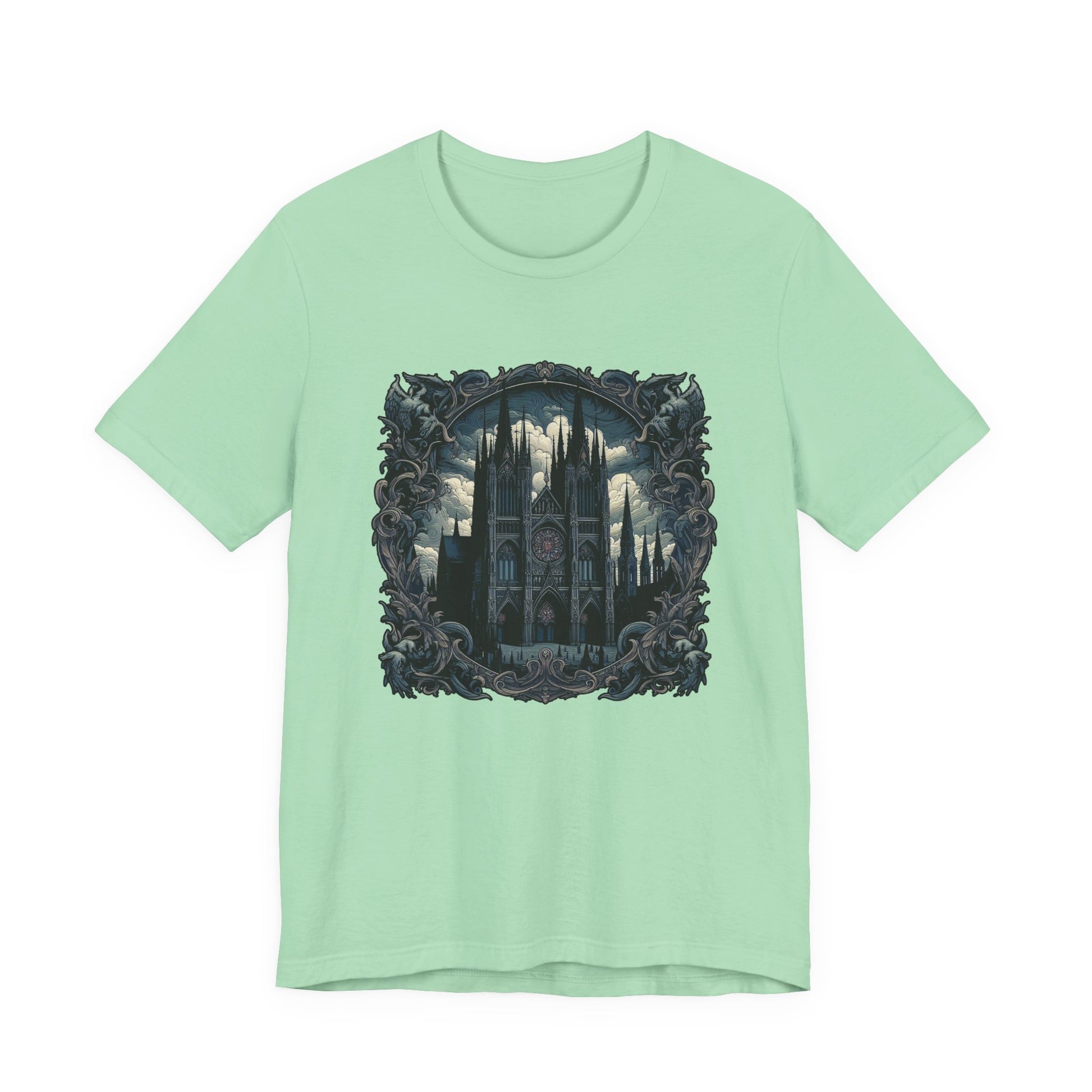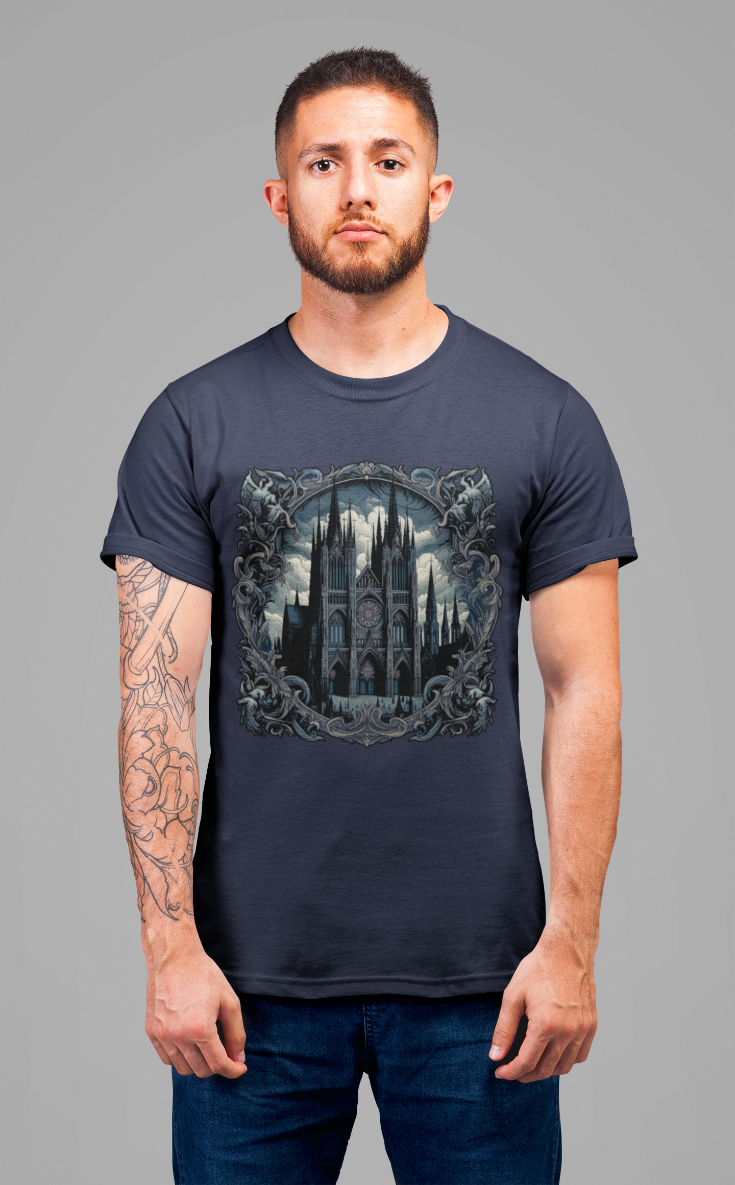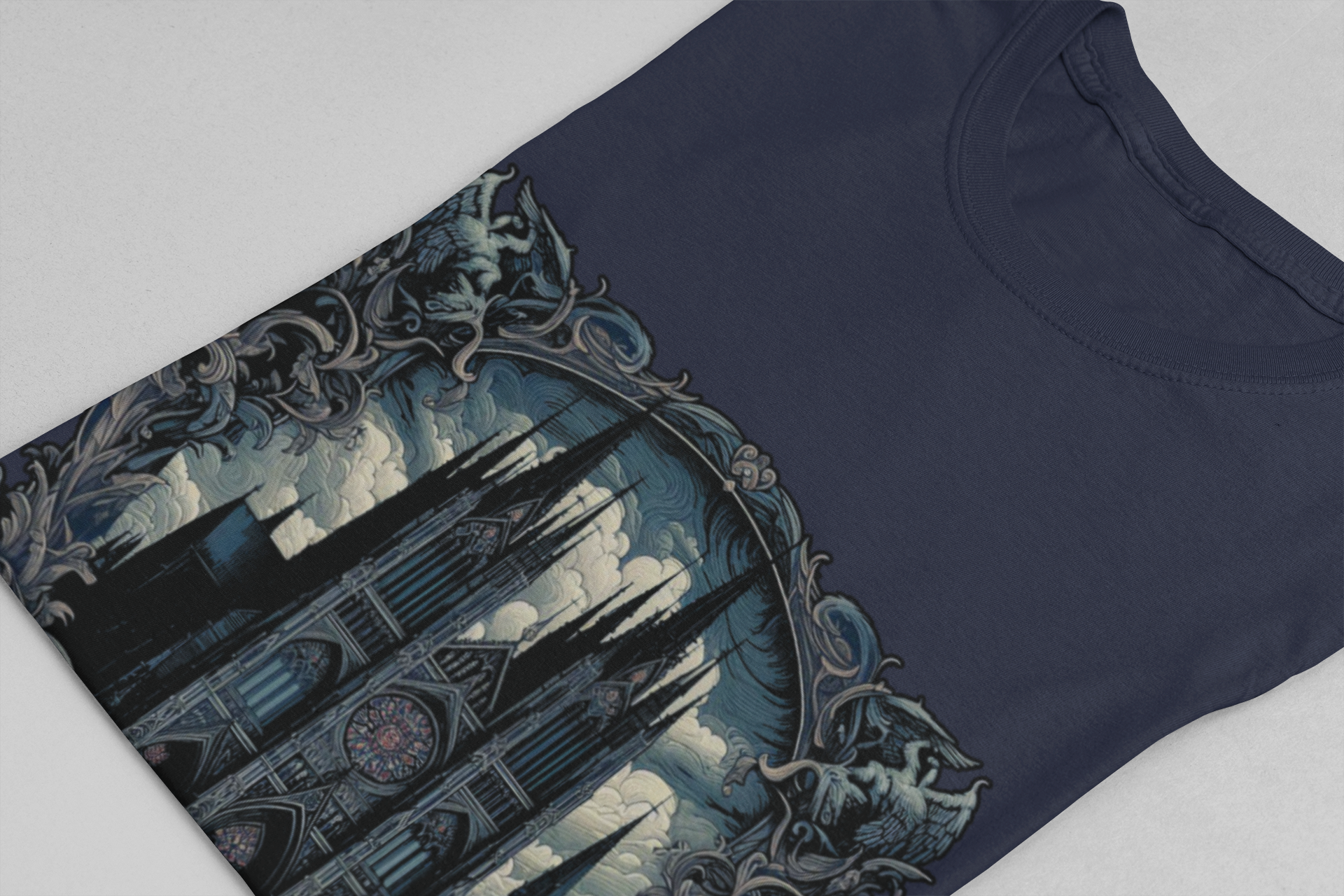 Step into the grandeur of history with this "Gothic Art Revival" tshirt, featuring a mesmerizing graphic of an ancient castle viewed through a mirror-like object. The mirror’s frame echoes the ornate, intricate designs and rich colors that define Gothic style, creating a seamless connection between past and present. This design celebrates the revival of Gothic art and architecture, known for its pointed arches, elaborate detailing, and dramatic, castle-like forms. Perfect for lovers of history, architecture, and classic art, this tshirt is a tribute to the enduring elegance and emotional depth of the Gothic tradition.
