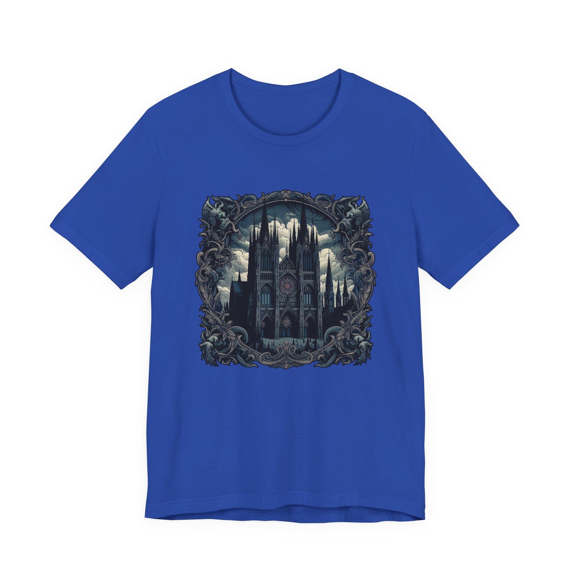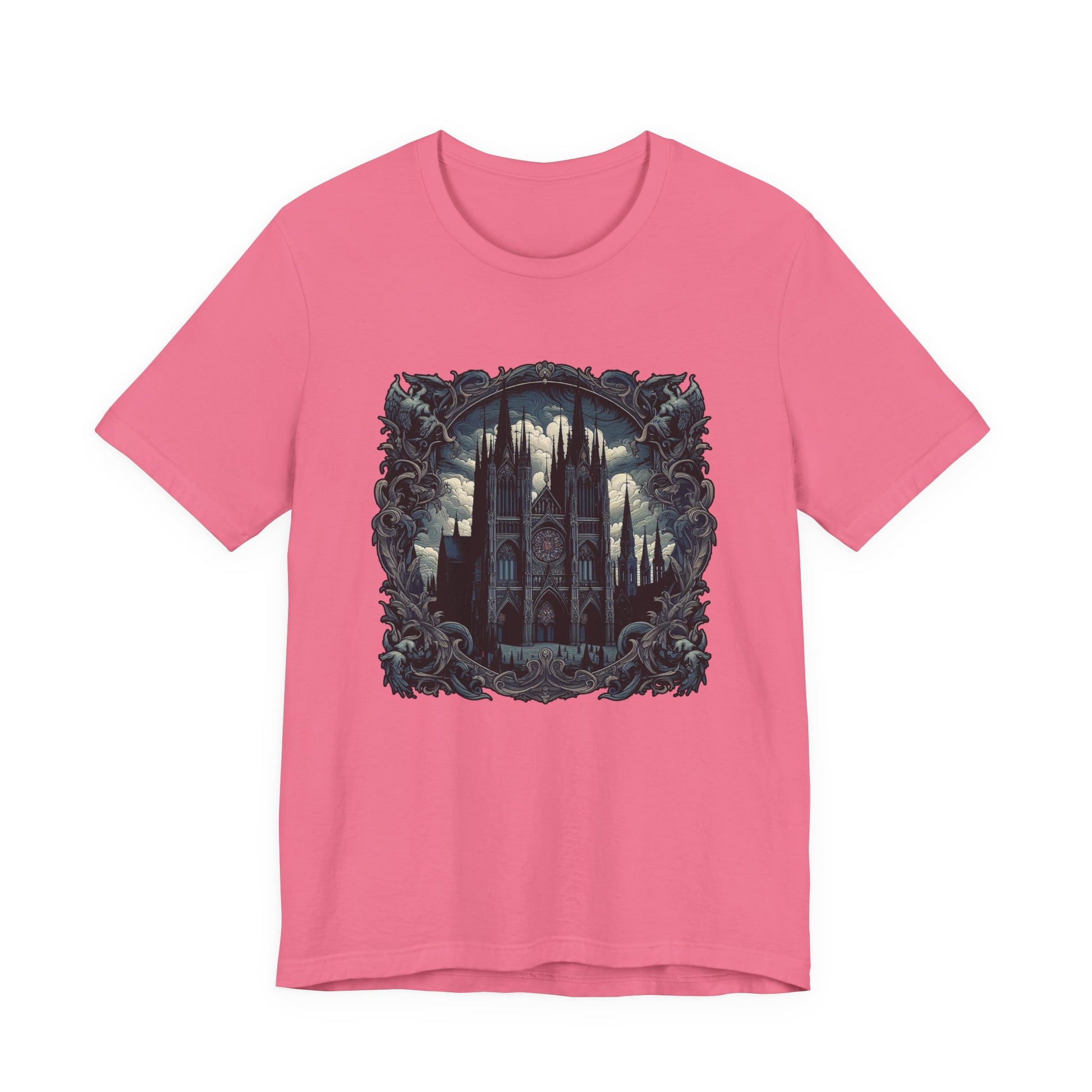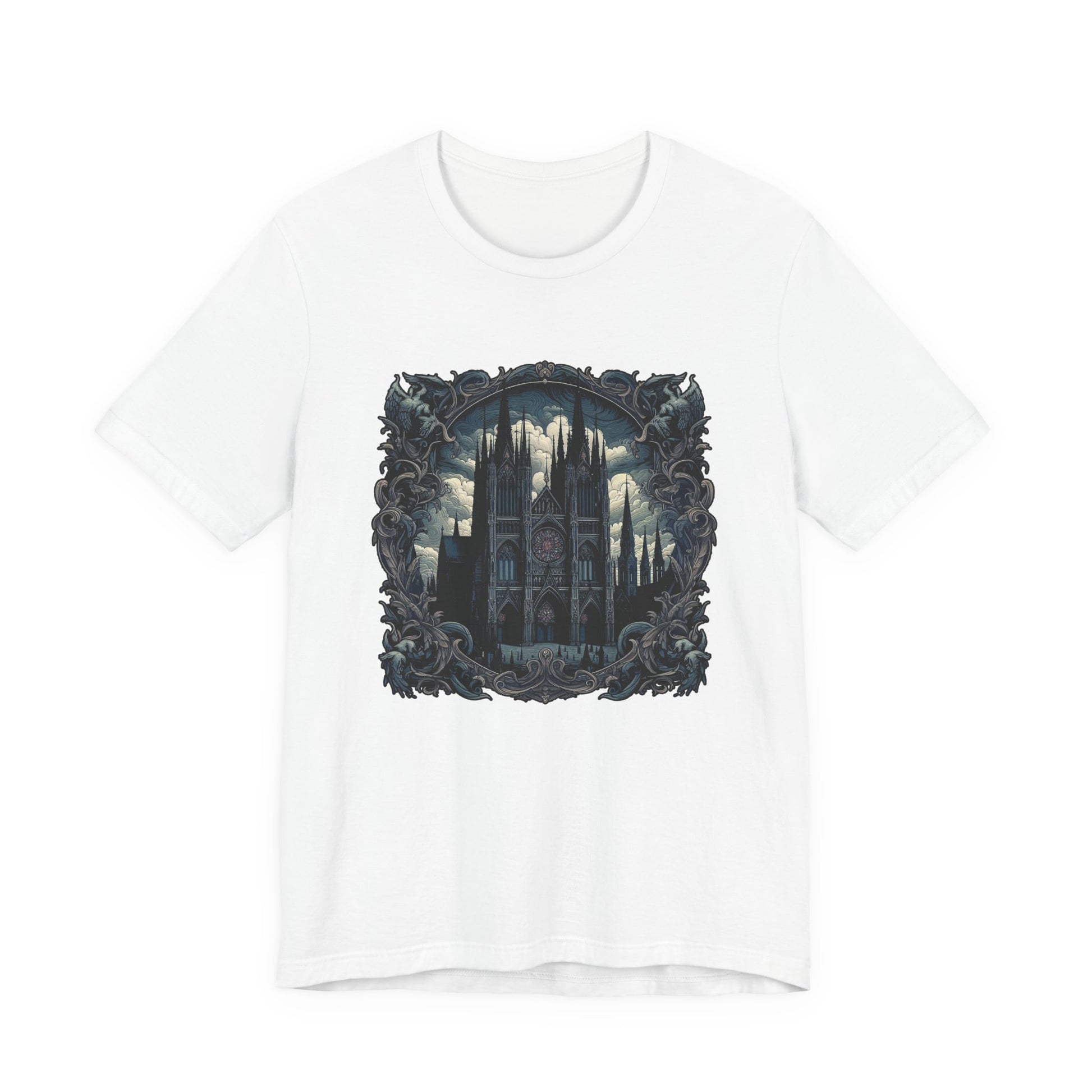 Step into the grandeur of history with this "Gothic Art Revival" tshirt, featuring a mesmerizing graphic of an ancient castle viewed through a mirror-like object. The mirror’s frame echoes the ornate, intricate designs and rich colors that define Gothic style, creating a seamless connection between past and present. This design celebrates the revival of Gothic art and architecture, known for its pointed arches, elaborate detailing, and dramatic, castle-like forms. Perfect for lovers of history, architecture, and classic art, this tshirt is a tribute to the enduring elegance and emotional depth of the Gothic tradition.