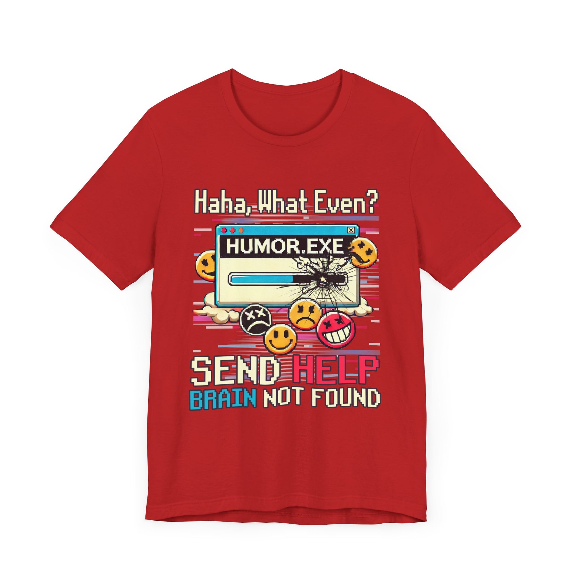 Bring tech humor to life with this "haha what even? send help BRAIN not found" t-shirt, featuring a playful graphic of a failed "humor.exe" installation bar. This design taps into the popular "exe has stopped working" meme culture, where computer error messages are used to express relatable, everyday glitches in a funny way. The failed installation bar adds a visual punchline, making it perfect for programmers, tech enthusiasts, and anyone who appreciates a good digital-age joke. Crafted from soft, comfortable fabric, this tee is ideal for casual wear or as a quirky gift for friends who love internet and computer humor.