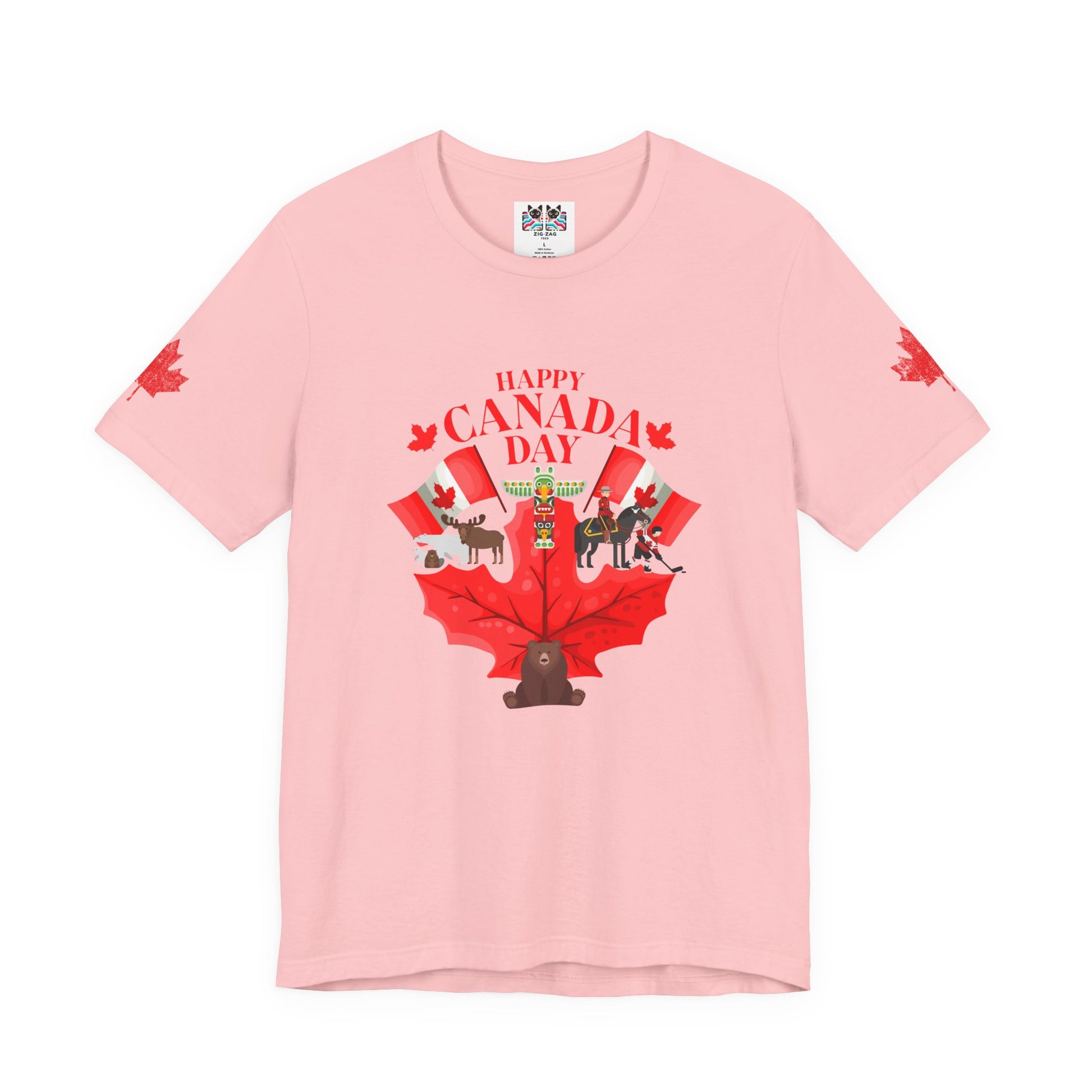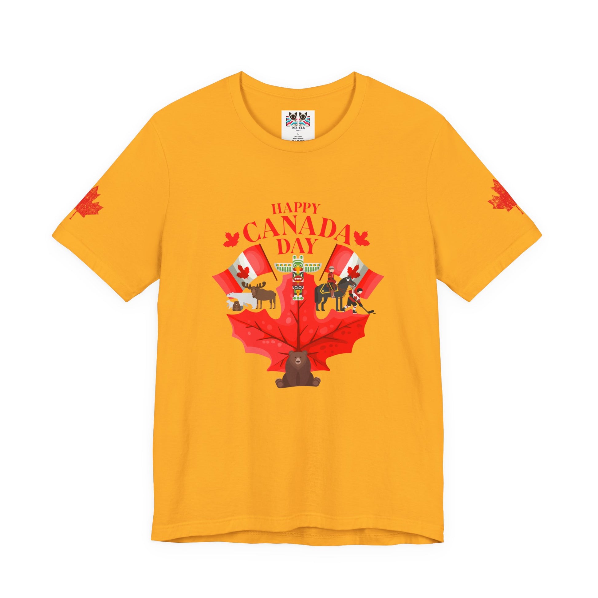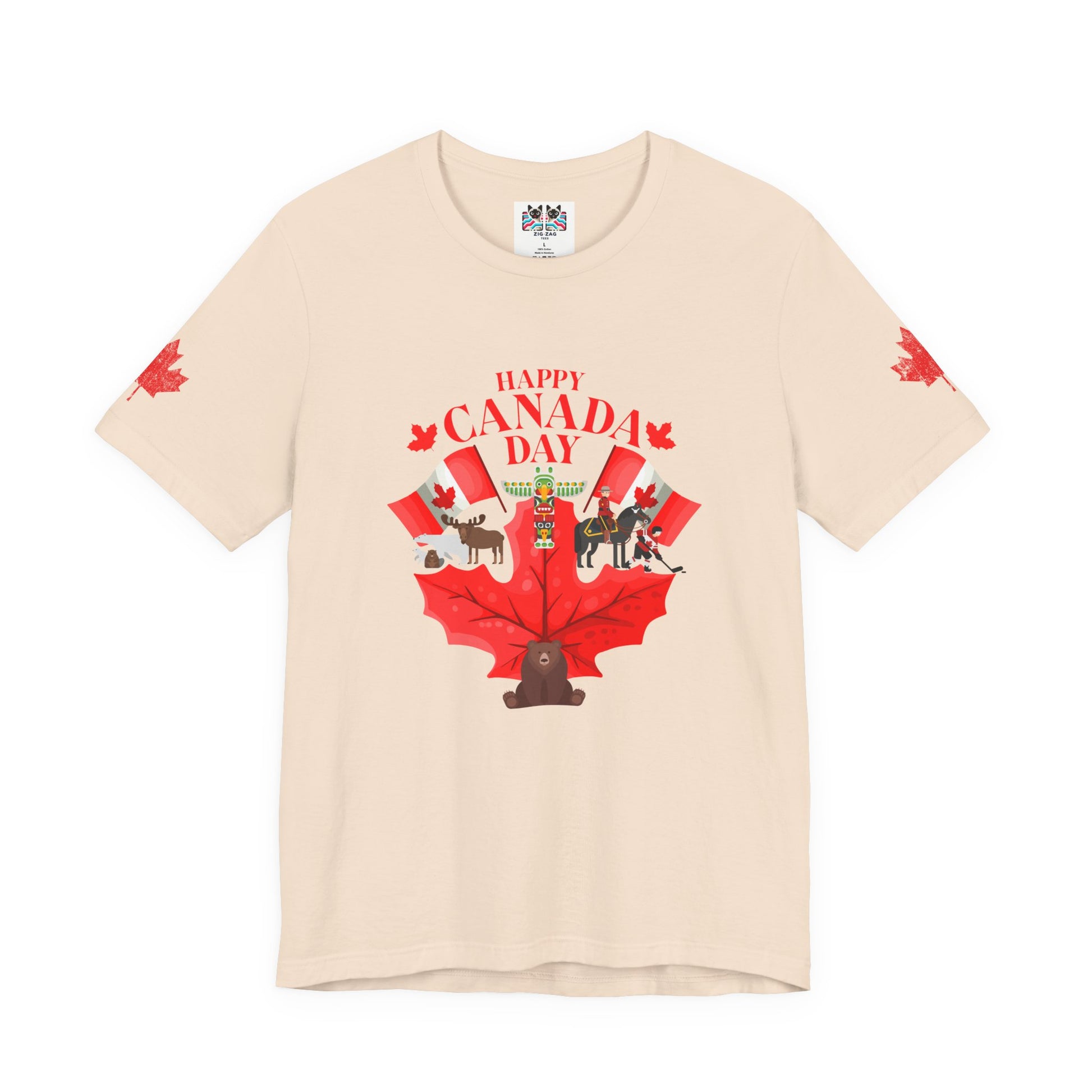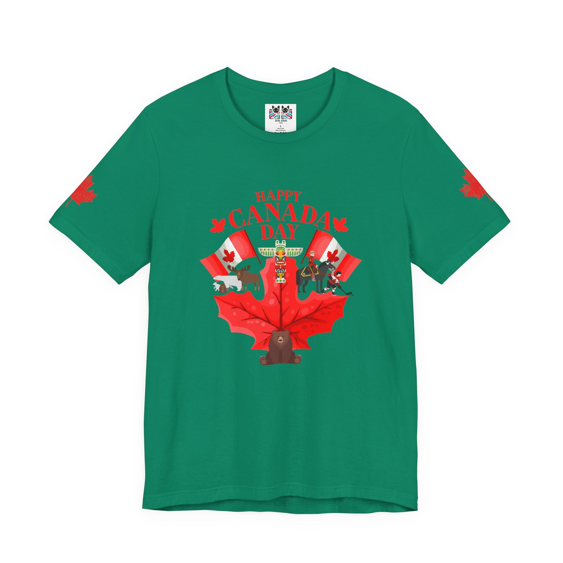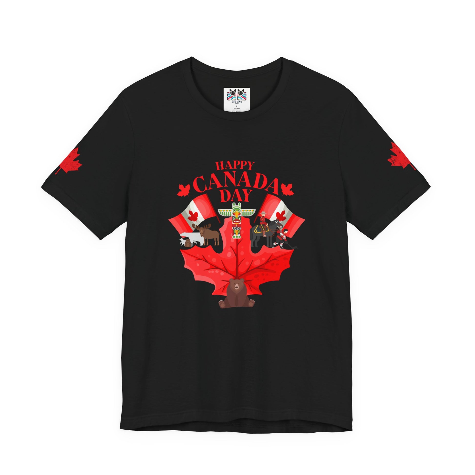 Celebrate Canada Day in vibrant style with this playful t-shirt featuring a large red maple leaf at the center, surrounded by festive Canadian icons. The graphic showcases fun designs, including patriotic animals (bear, moose), hockey, Mountie, maple flags, and Canada-themed balloons. "Happy Canada Day" is boldly printed at the top, creating a cheerful and spirited look. Maple leaf accents appear on both sleeves, making this tee perfect for family gatherings, parades, and anyone proud to show off their Canadian roots.