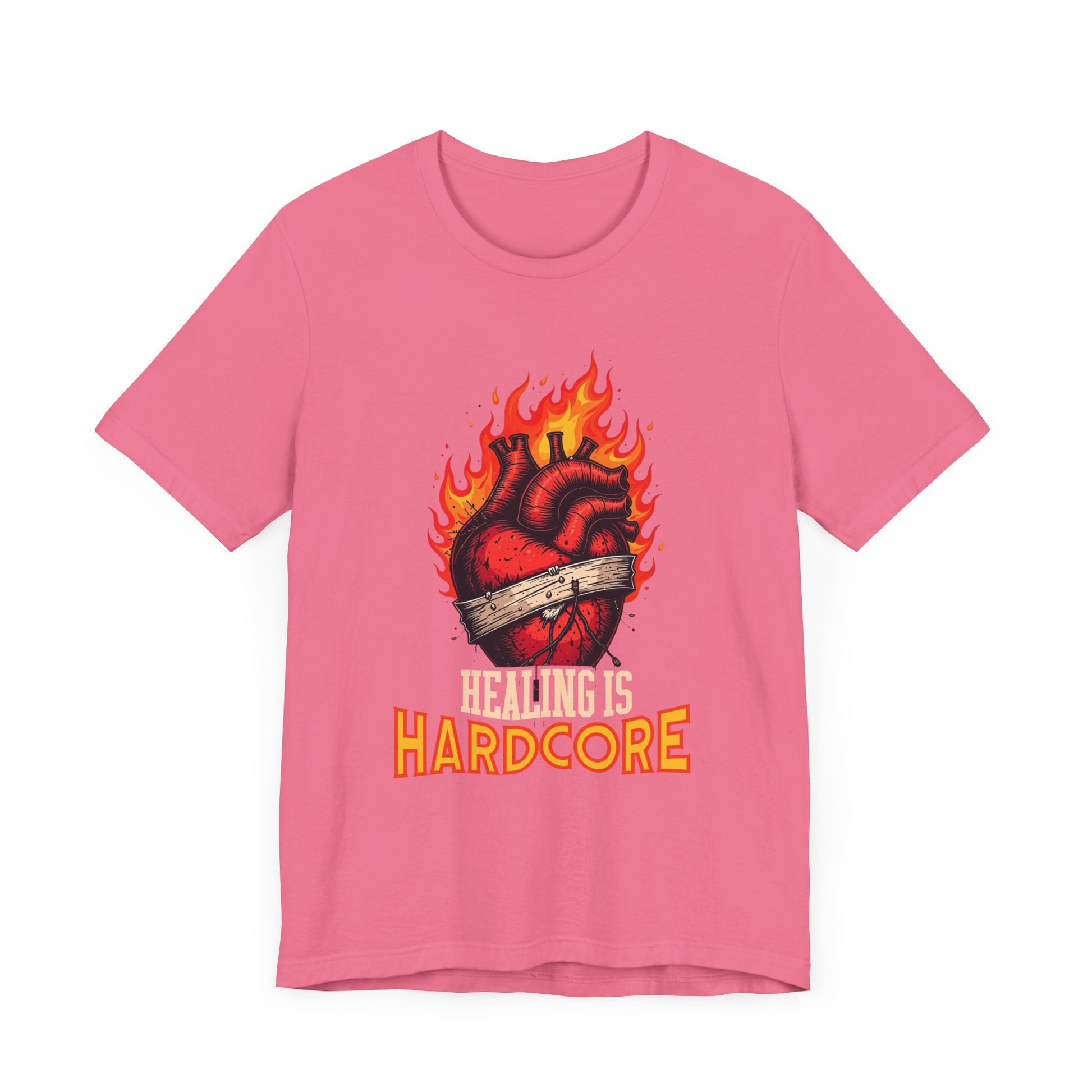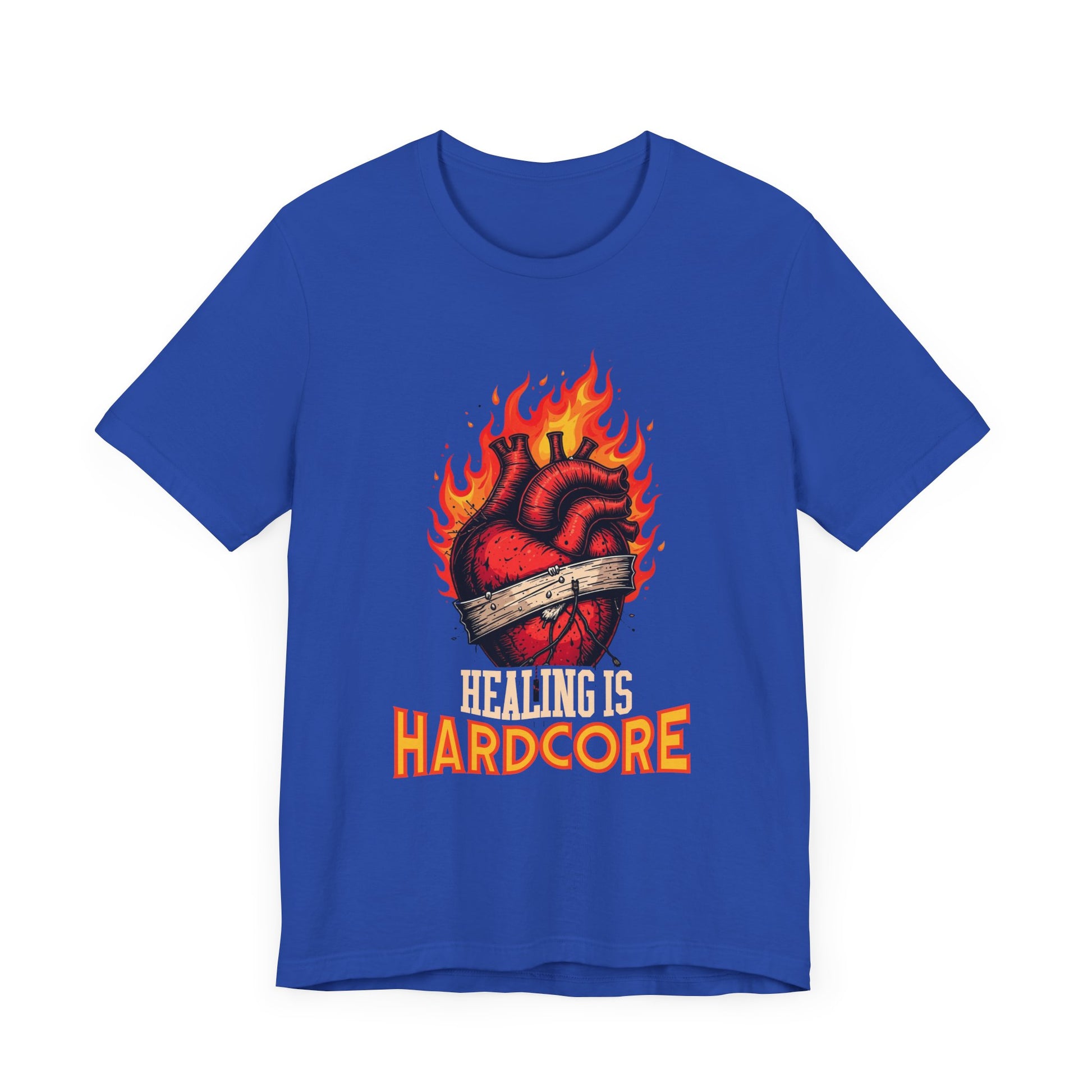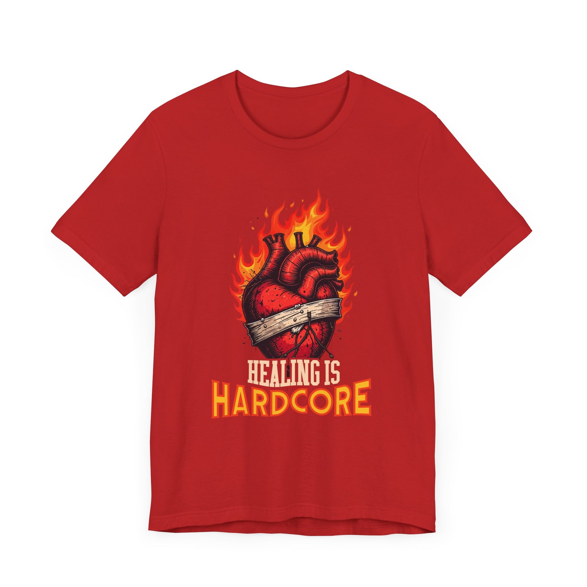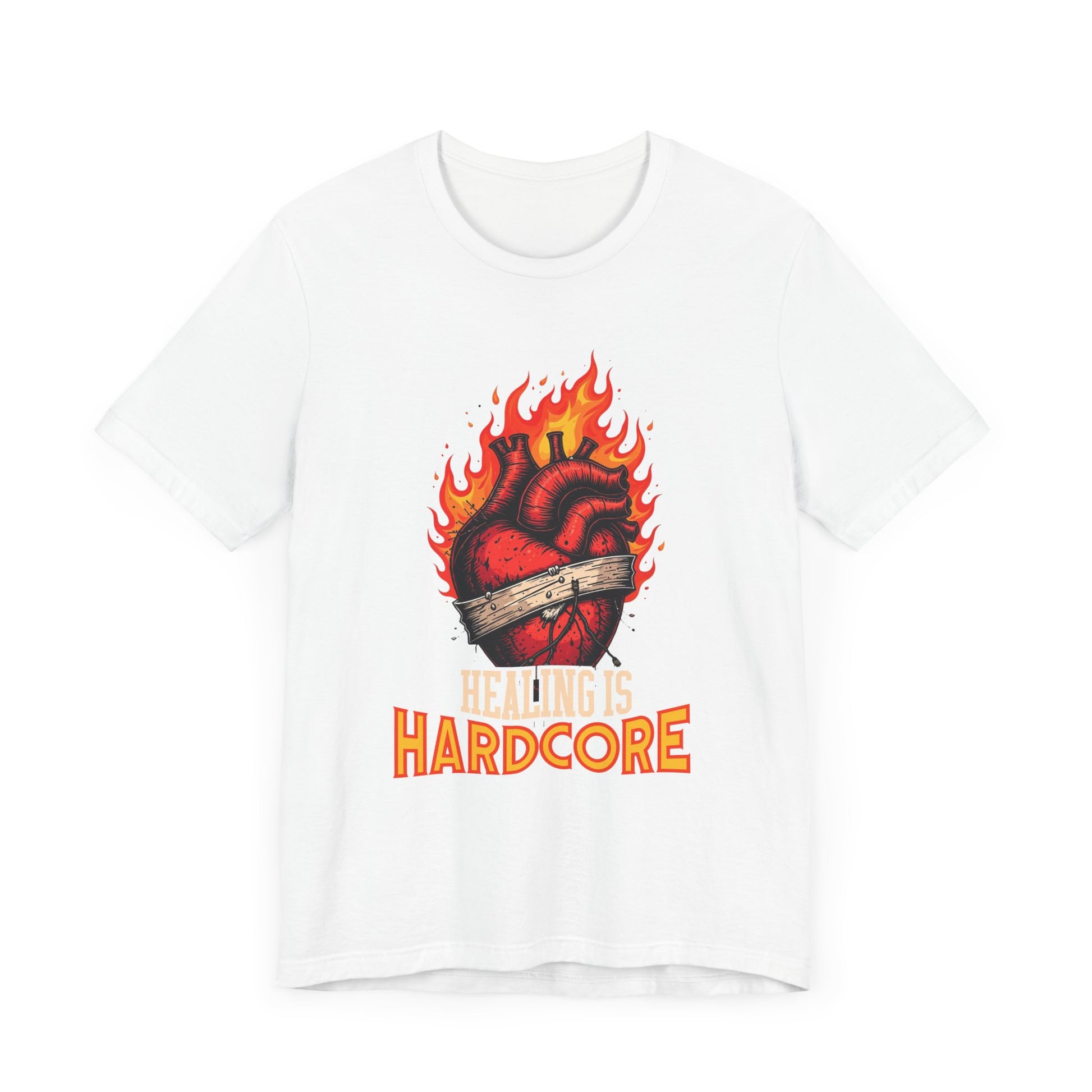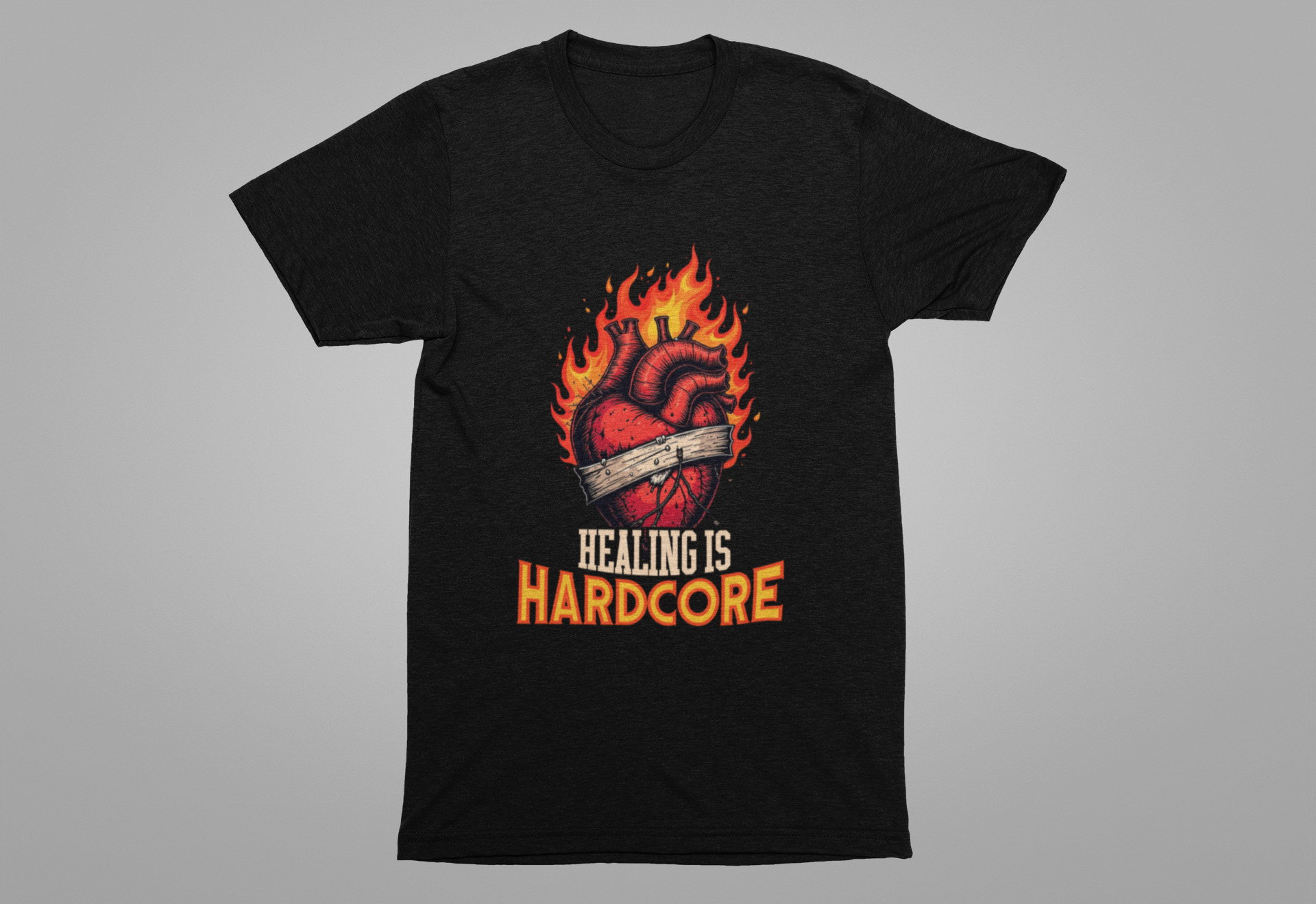 Show your strength and resilience with this bold “Healing Is Hardcore” t-shirt. Featuring a striking graphic of an anatomically detailed heart wrapped in a bandage and engulfed in flames, this design captures the intense journey of healing and recovery. The vivid artwork and powerful message make it perfect for anyone overcoming challenges, supporting mental health, or embracing their inner warrior.