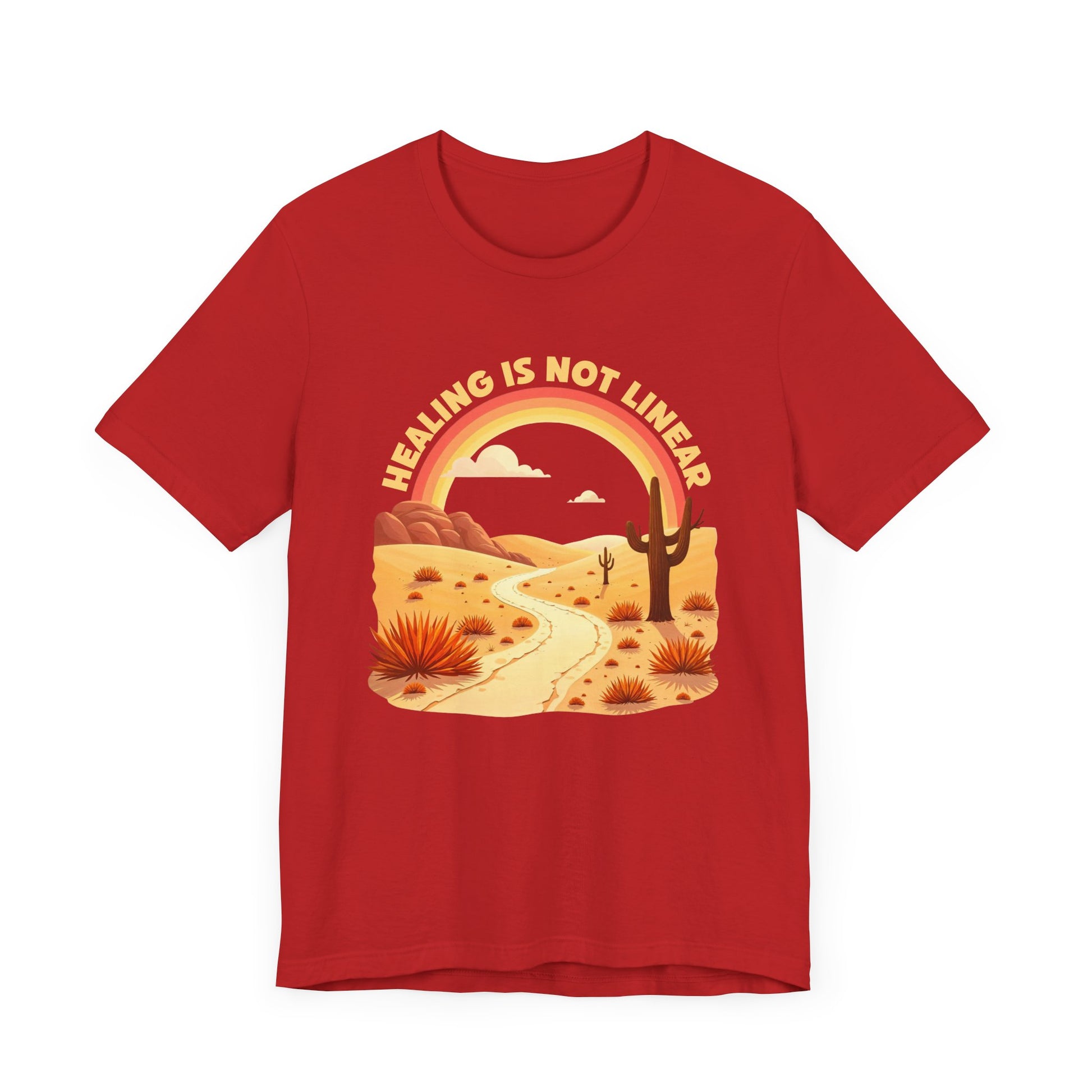 Embrace the journey of growth with this inspiring "Healing is not linear" t-shirt, featuring the uplifting phrase at the top of a unique graphic. The design showcases a rainbow in warm desert colors arching above a winding desert road, symbolizing the unpredictable path of healing. Scattered desert plants add a touch of resilience and natural beauty, making this tee a meaningful reminder that progress isn’t always straightforward. Crafted from soft, high-quality fabric, this shirt is perfect for anyone seeking encouragement, self-care, or a thoughtful gift for a loved one.