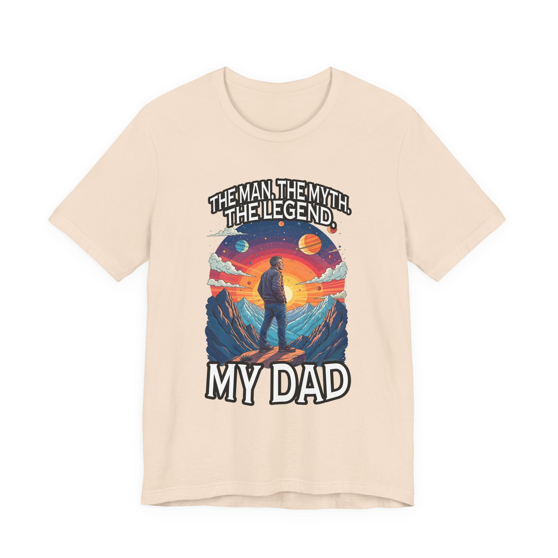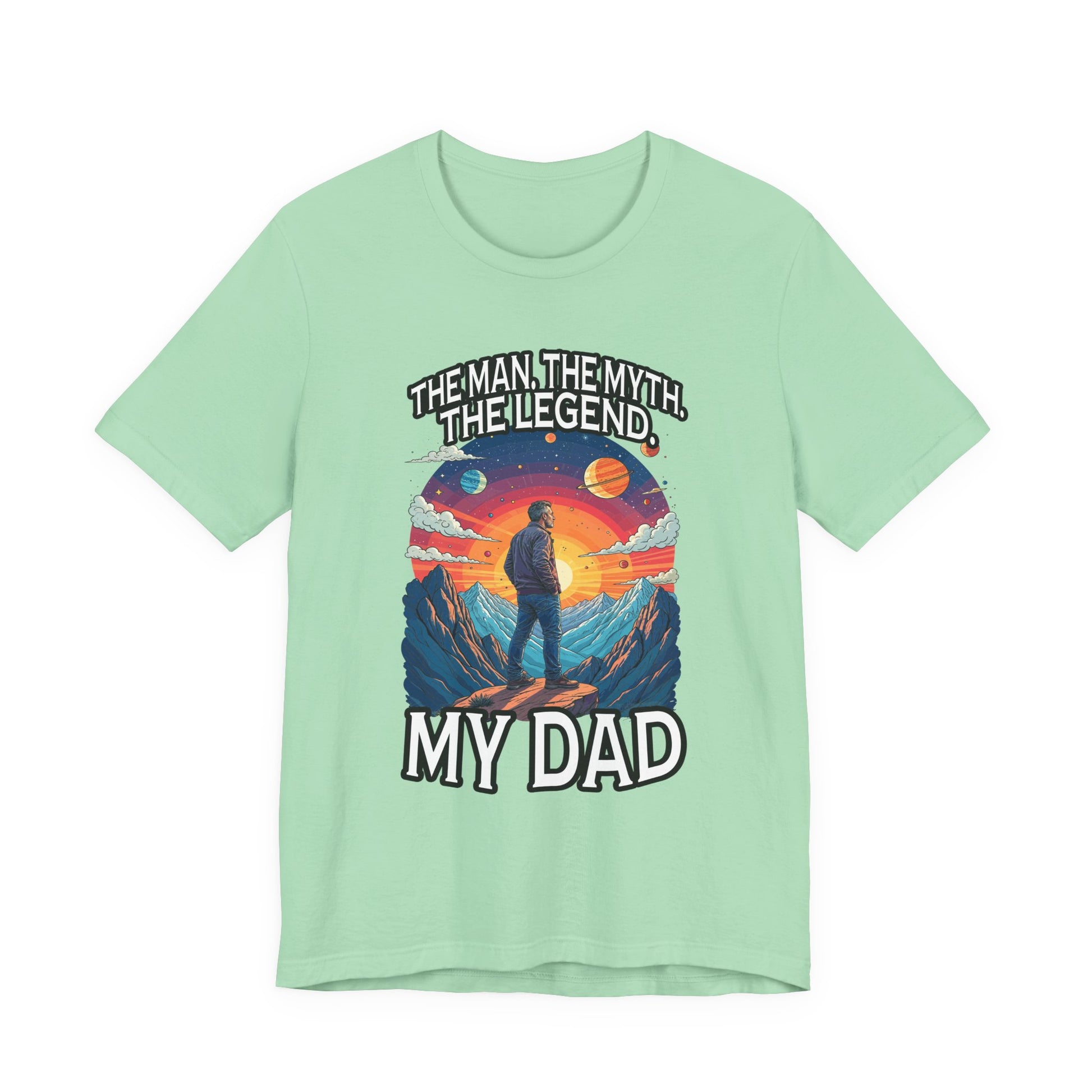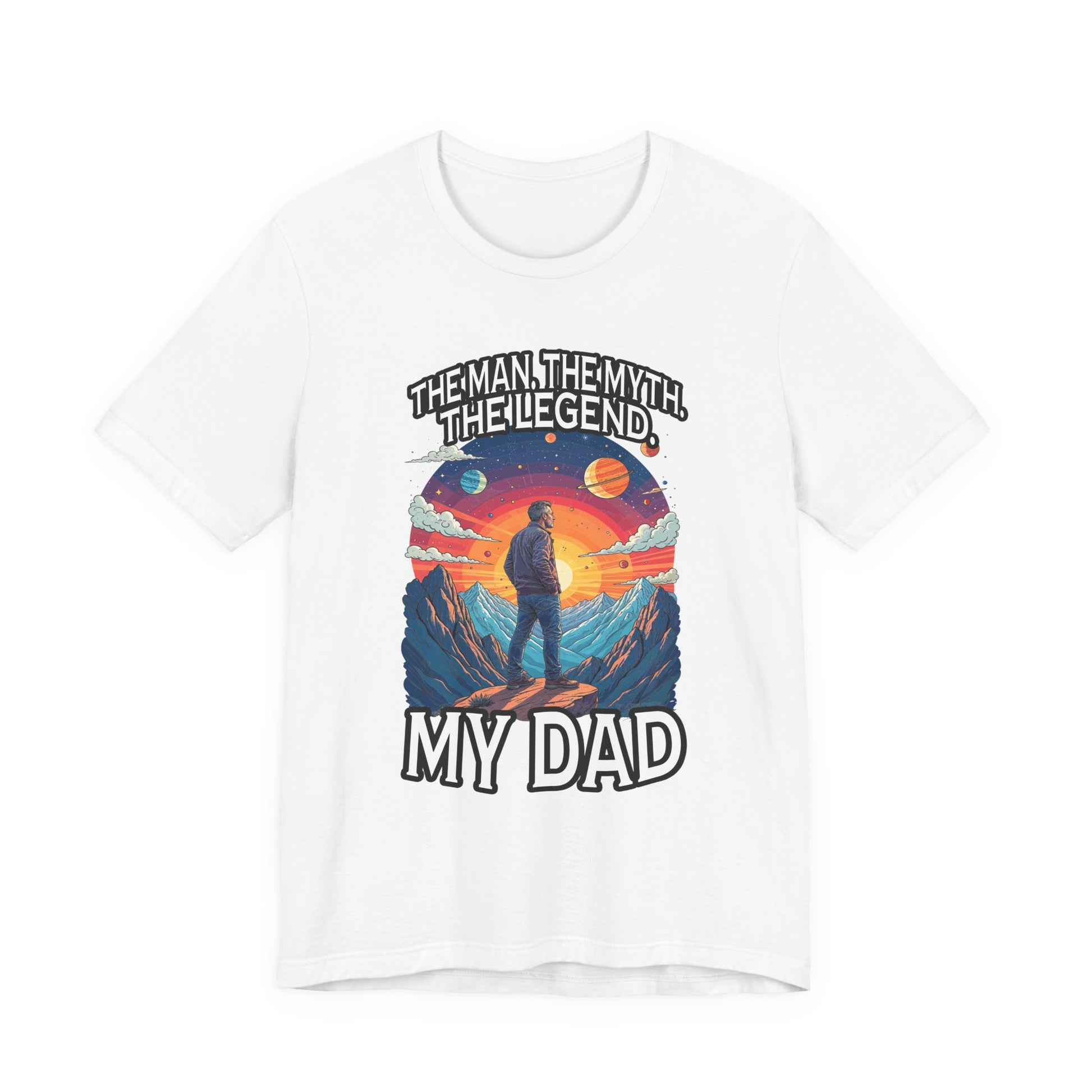 Honor the legendary dad in your life with this inspiring tshirt featuring a man standing proudly atop a majestic mountain, gazing forward into a breathtaking landscape of grand mountains, a bright radiant sun, and a vibrant sky filled with diverse plants. The dynamic scene evokes strength, admiration, and the spirit of adventure. Boldly printed with the heartfelt text "The Man, The Myth, The Legend. My Dad," this tshirt celebrates fathers who are heroes, role models, and legends in their own right. Crafted from soft, comfortable fabric, it's perfect for casual wear, gift-giving on Father’s Day, birthdays, or any occasion to show appreciation for dad’s enduring legacy.