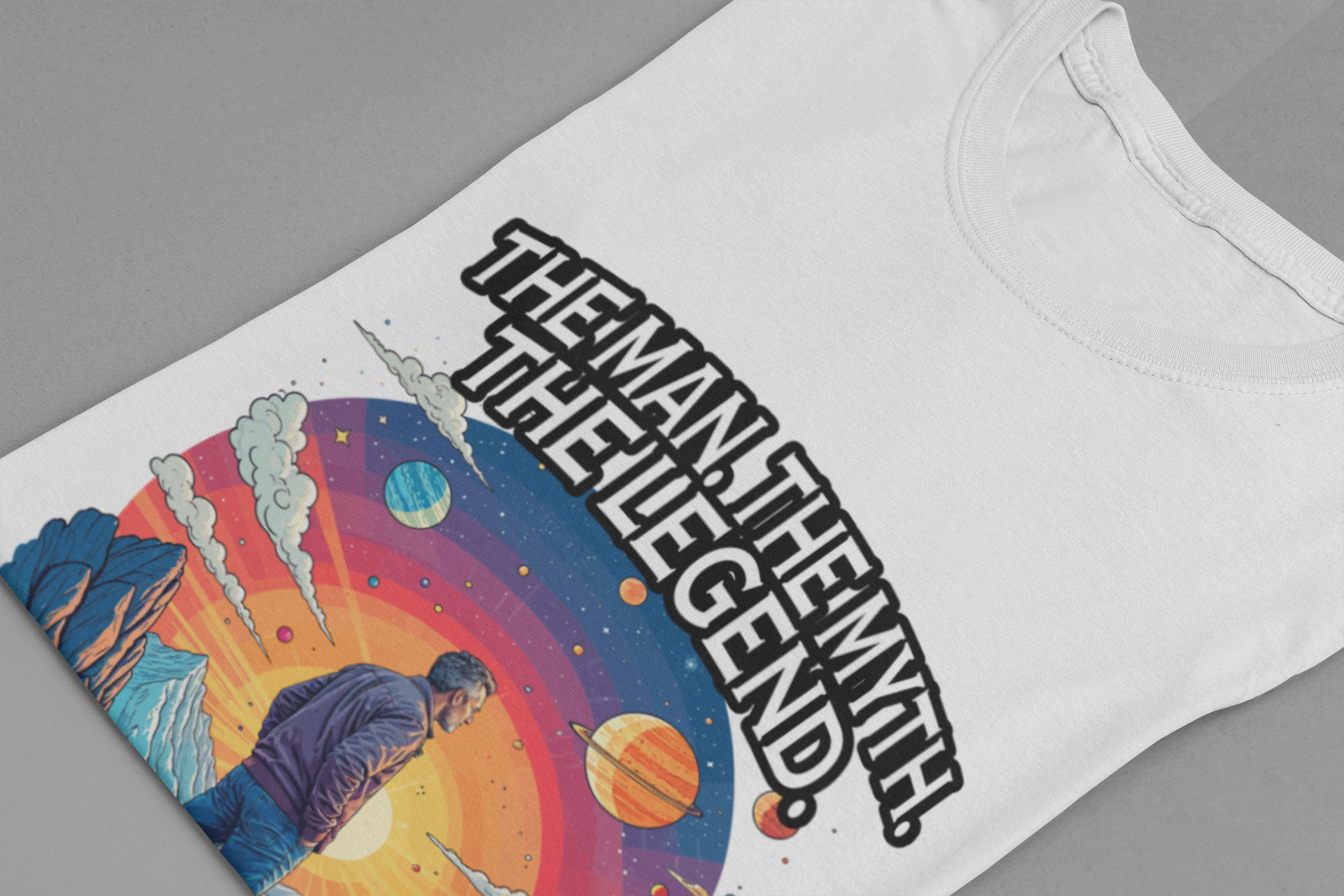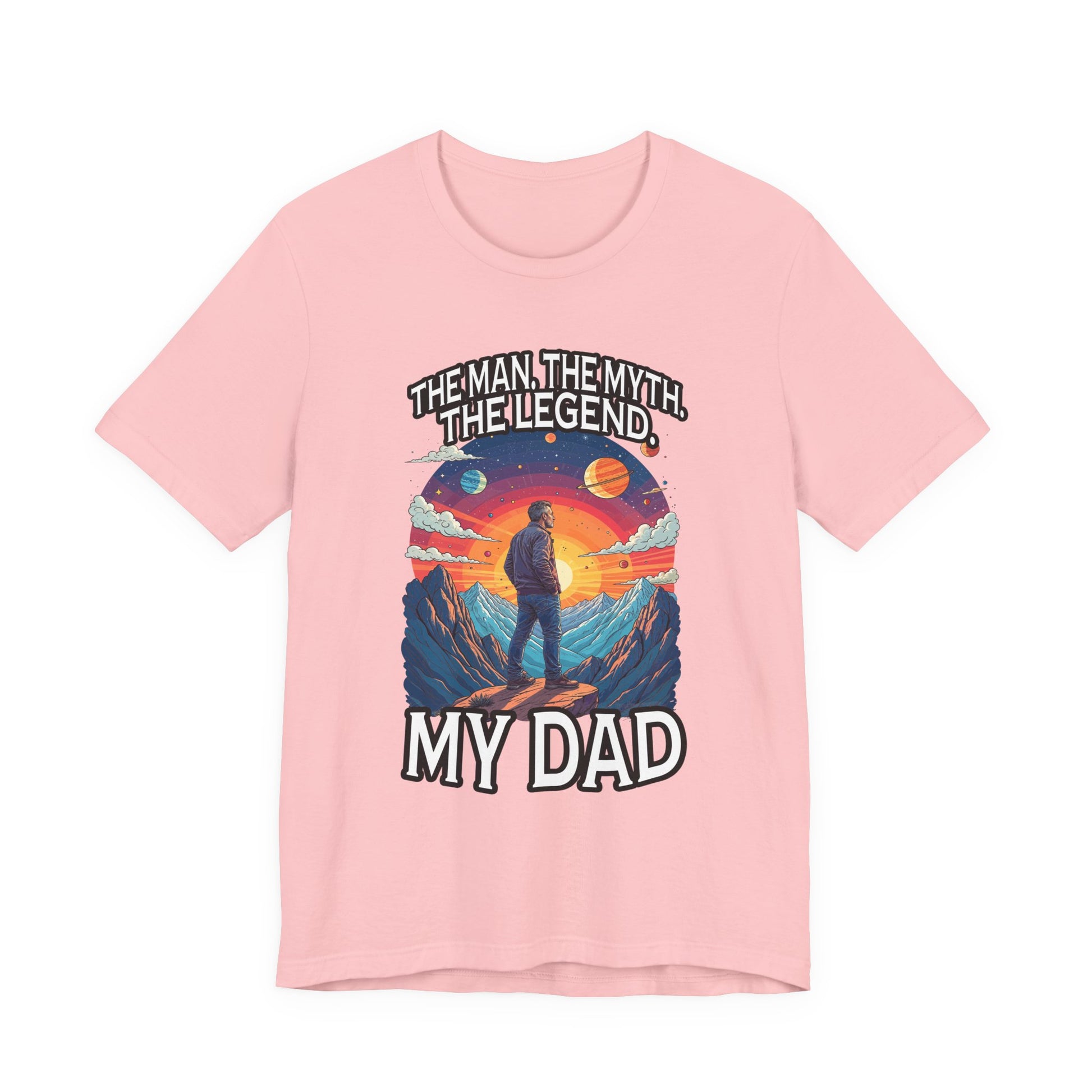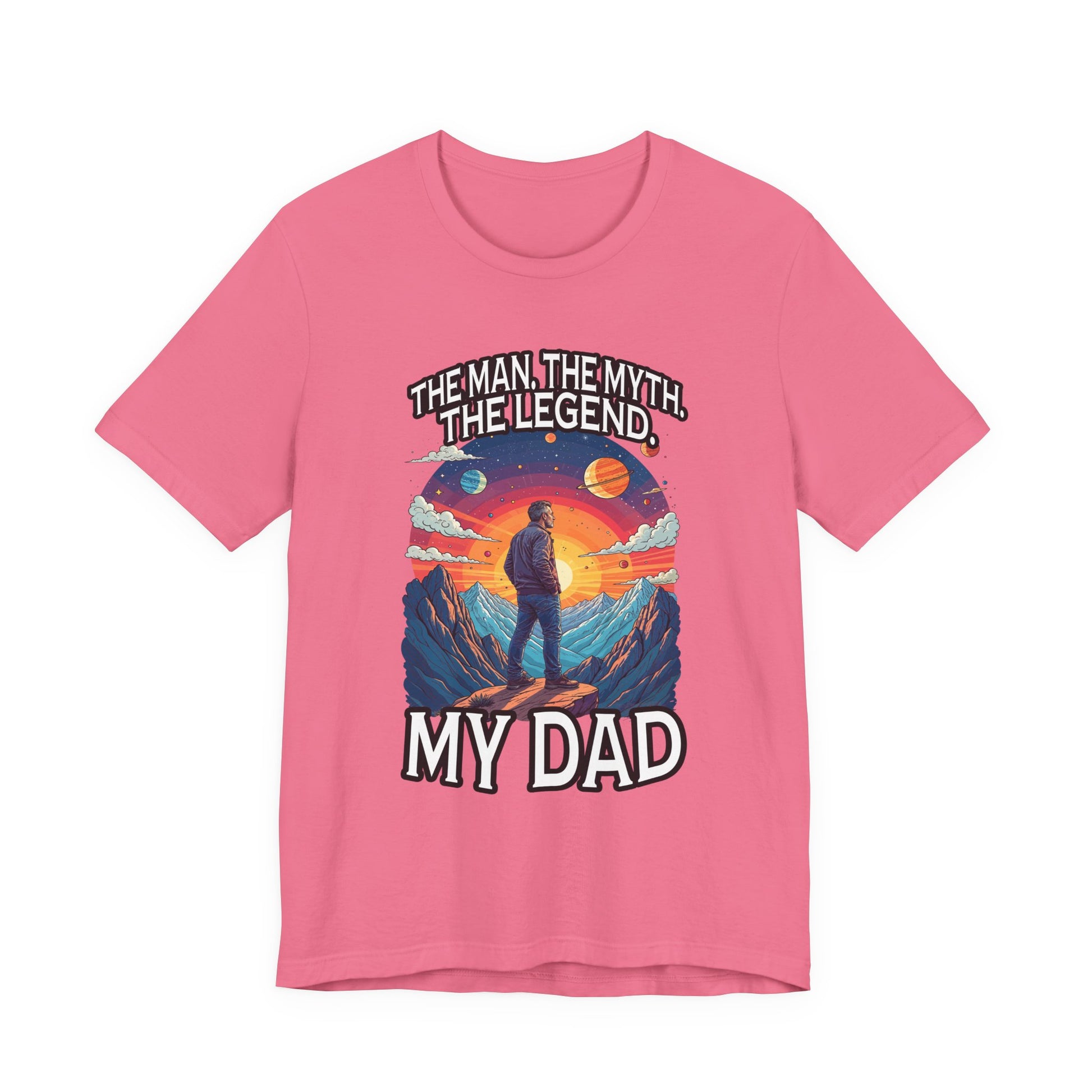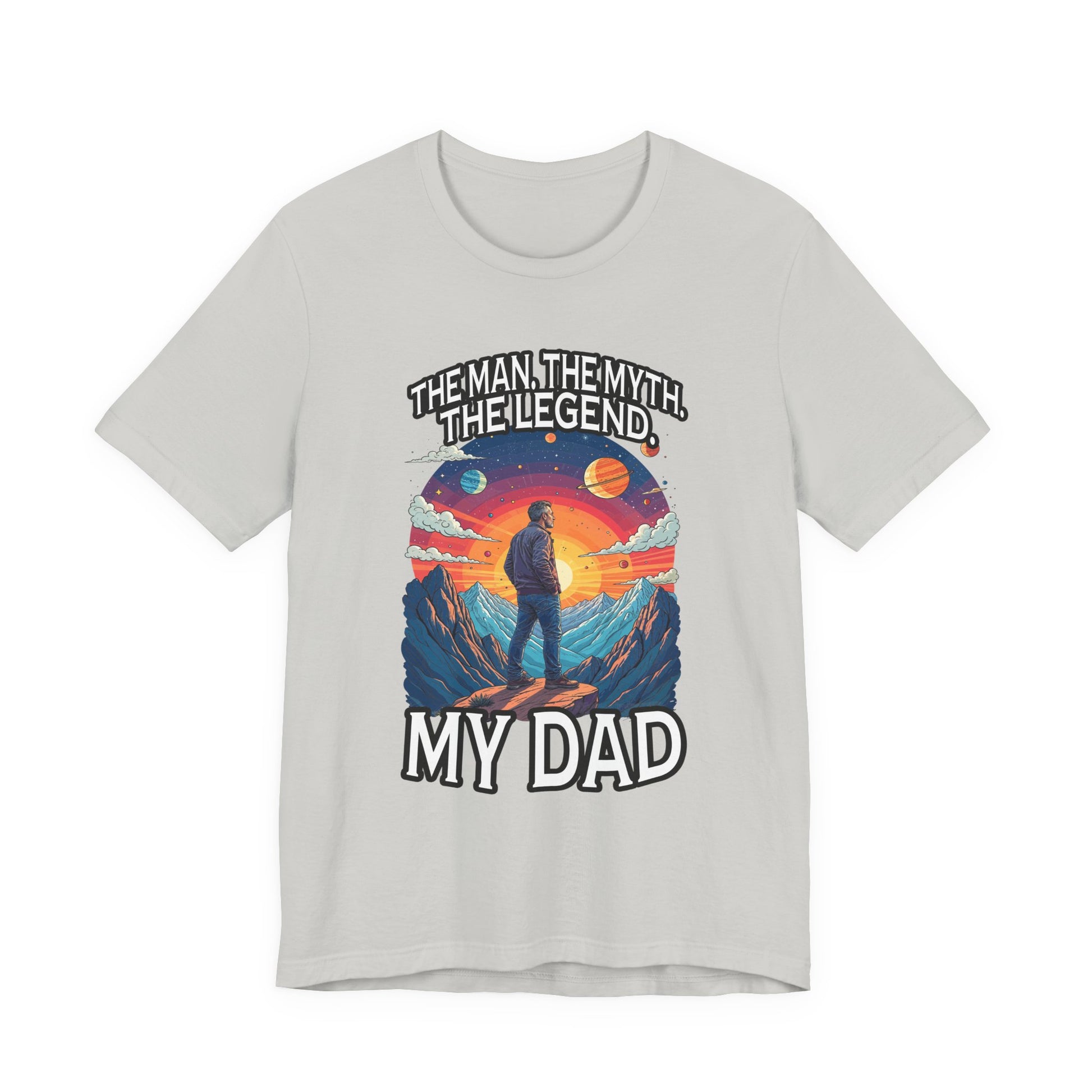 Honor the legendary dad in your life with this inspiring tshirt featuring a man standing proudly atop a majestic mountain, gazing forward into a breathtaking landscape of grand mountains, a bright radiant sun, and a vibrant sky filled with diverse plants. The dynamic scene evokes strength, admiration, and the spirit of adventure. Boldly printed with the heartfelt text "The Man, The Myth, The Legend. My Dad," this tshirt celebrates fathers who are heroes, role models, and legends in their own right. Crafted from soft, comfortable fabric, it's perfect for casual wear, gift-giving on Father’s Day, birthdays, or any occasion to show appreciation for dad’s enduring legacy.