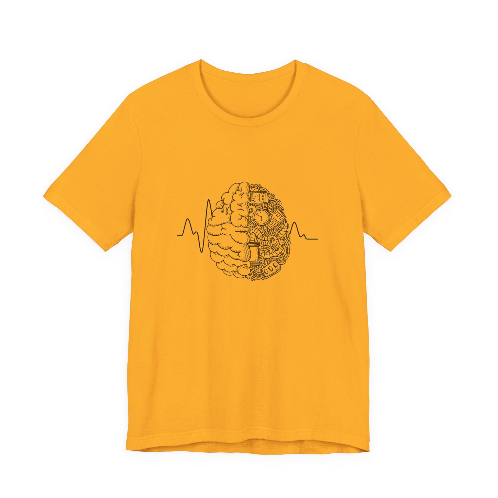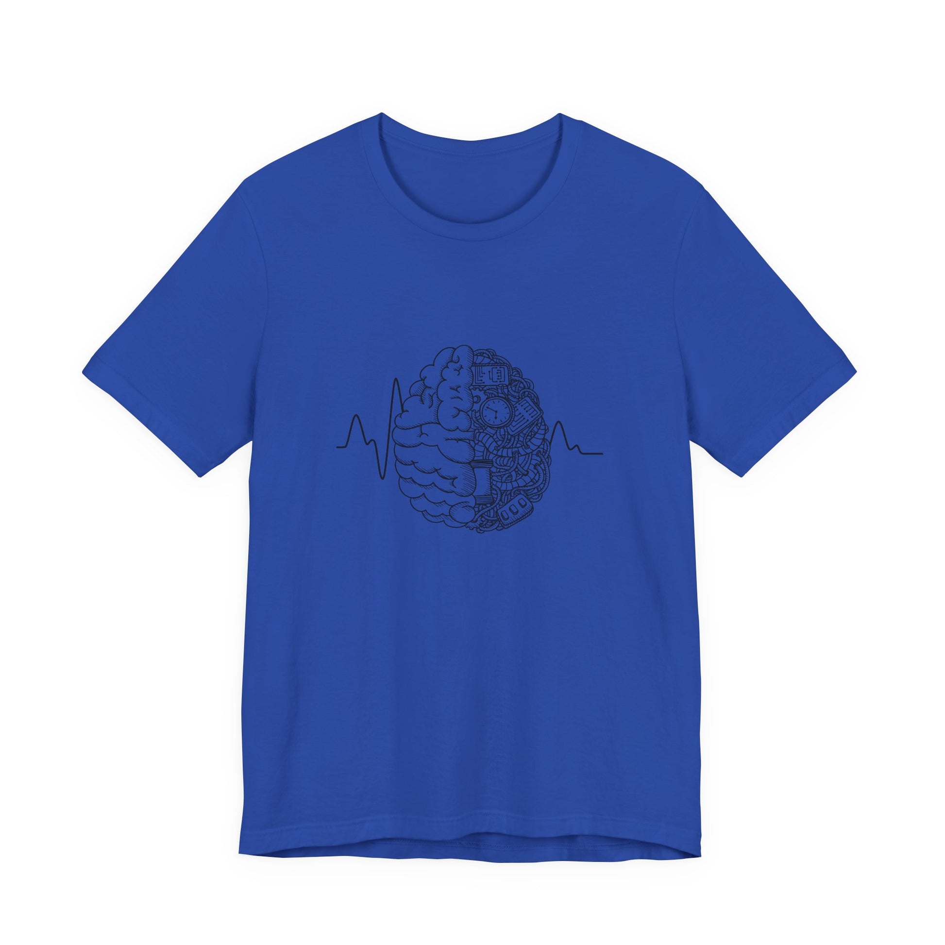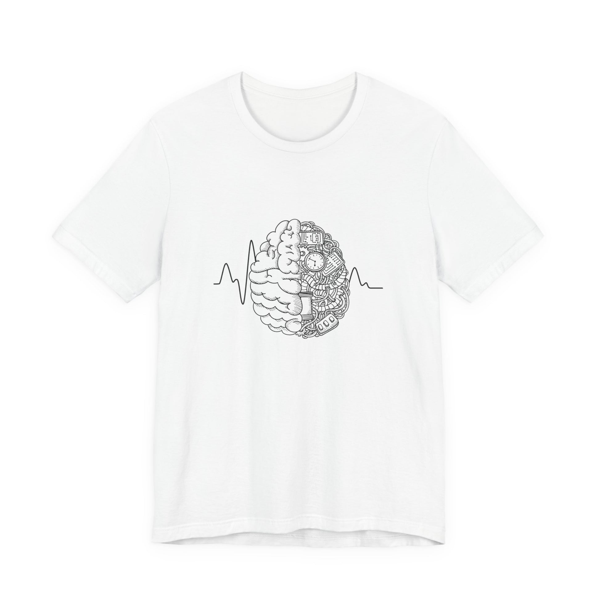 Showcase the balance between nature and technology with this striking tshirt featuring a large human brain, a life line running behind it, and one half composed of man-made items like cords, a watch, and small objects. This design visually represents the intersection of organic creativity and mechanical innovation, making it perfect for science enthusiasts, engineers, medical professionals, or anyone fascinated by the mind’s complexity. Comfortable and stylish, this shirt is ideal for everyday wear or as a thoughtful gift for those who appreciate both artistry and technology