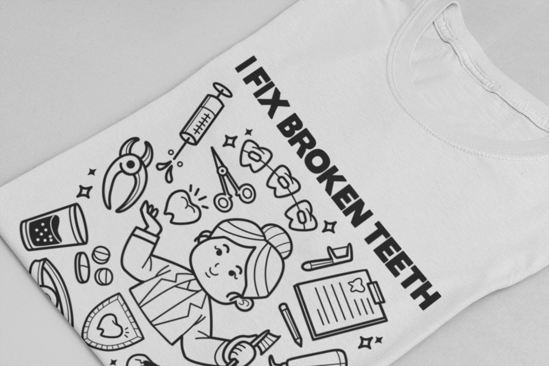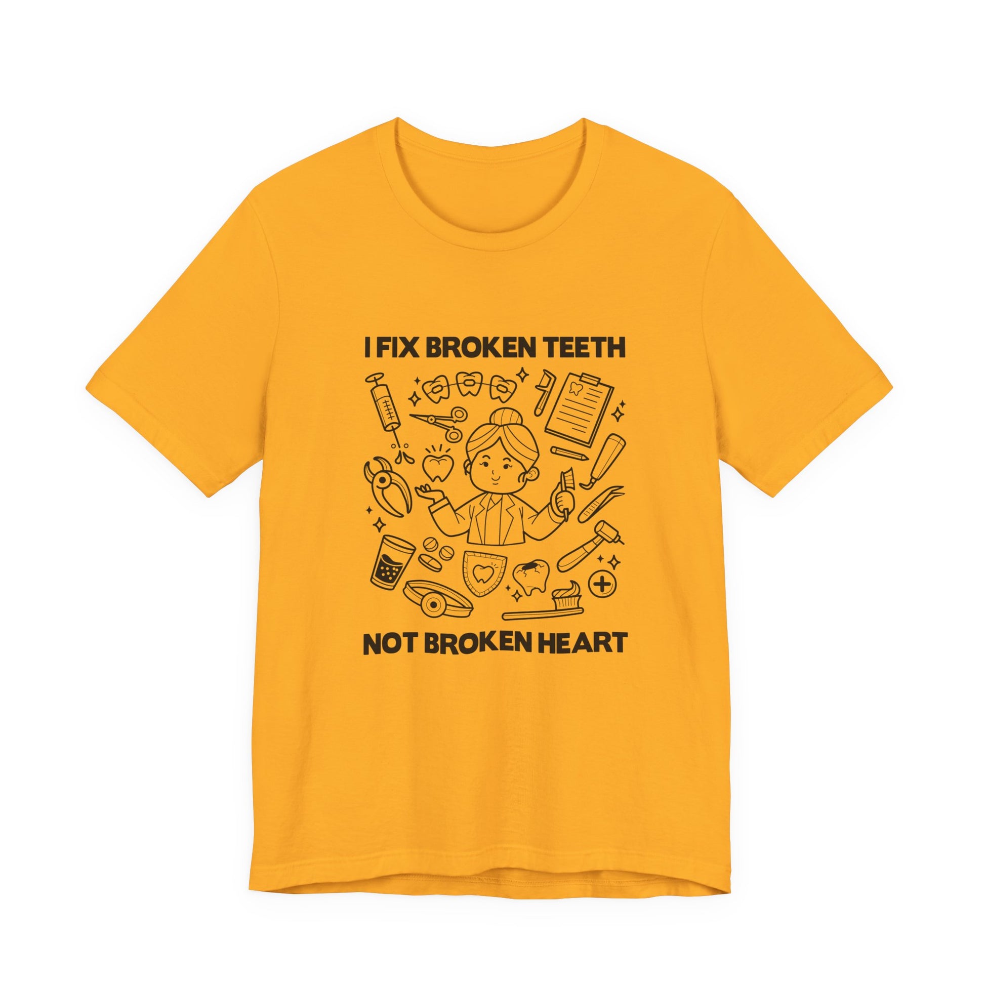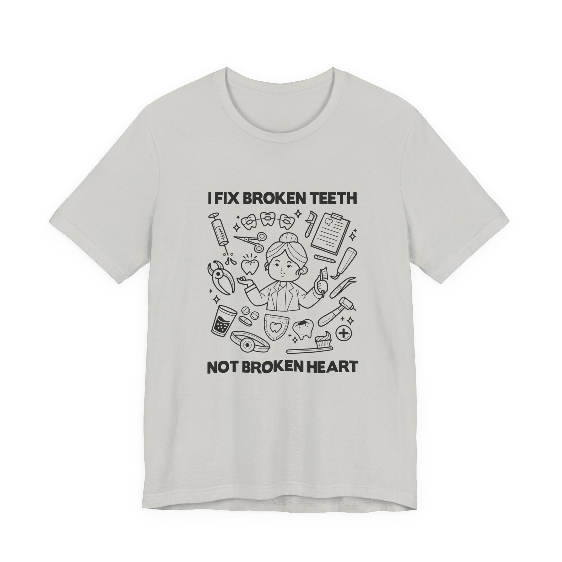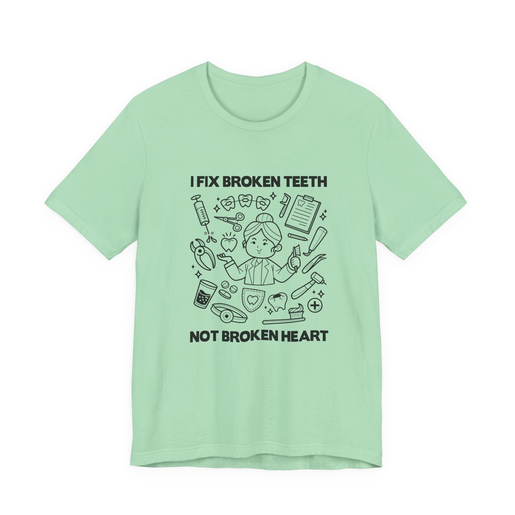 Show your dental pride with this witty t shirt featuring the phrase "I fix broken teeth not broken heart." The design displays a dental doctor surrounded by essential dental equipment, highlighting the tools of the trade and the important work of oral care professionals. Perfect for dentists, dental assistants, students, or anyone in the dental field, this comfortable and eye catching tee makes a great gift for graduation, appreciation, or everyday wear in the clinic.