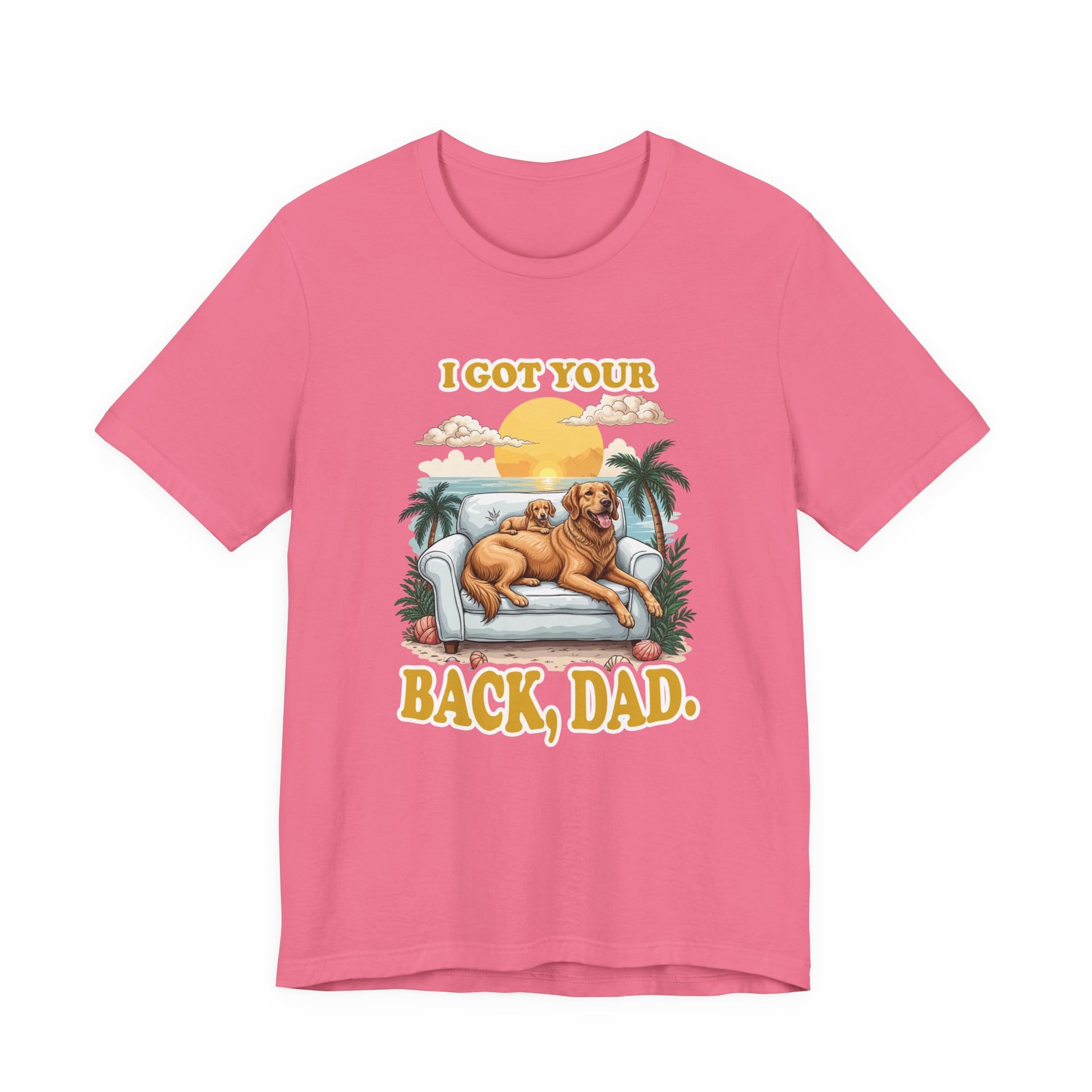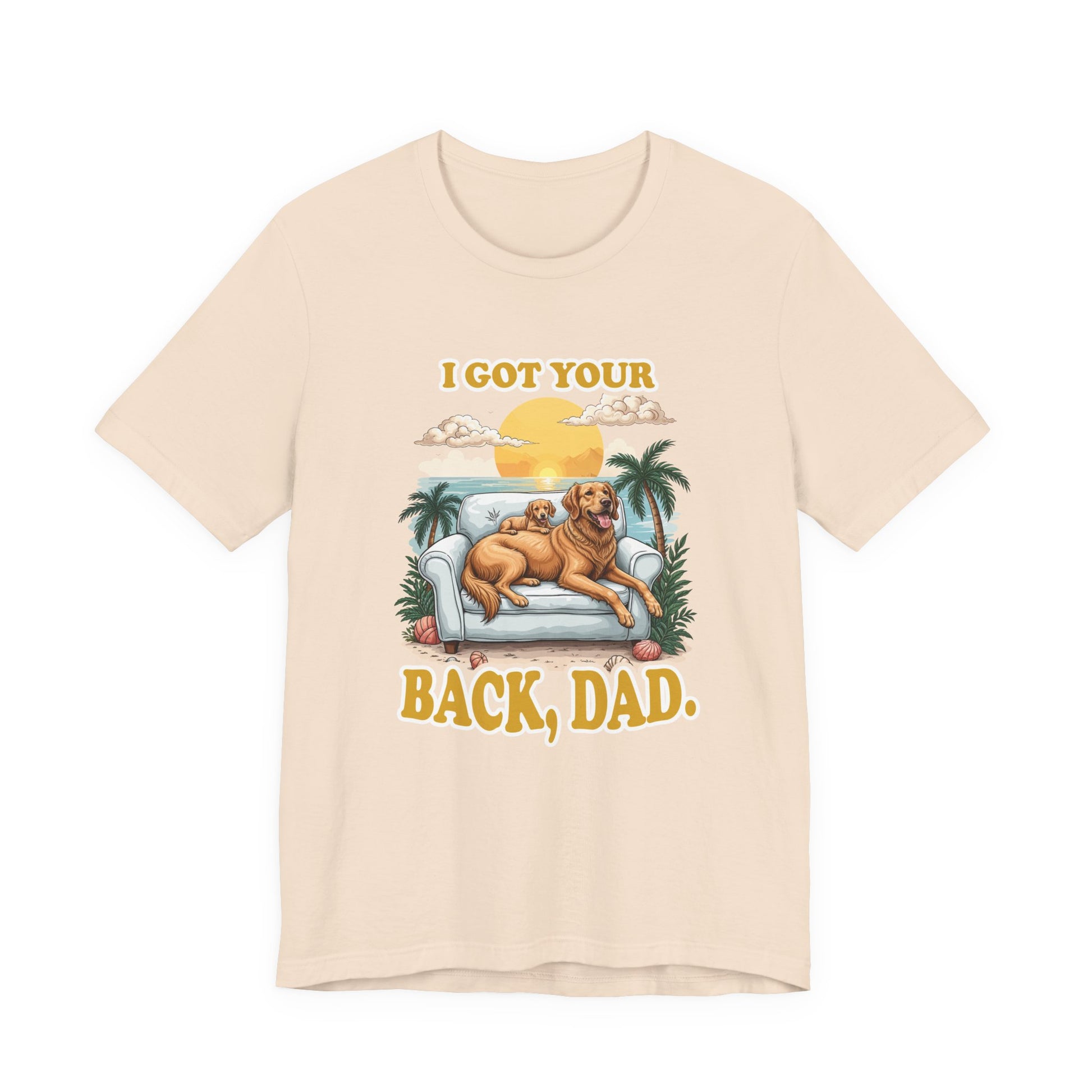 Celebrate the heartwarming bond between father and child with this charming tshirt featuring a golden retriever puppy sitting lovingly on the back of the father dog on a cozy couch. The background showcases a serene beach setup complete with sand, palm trees, ocean waves, mountains, and a stunning sunset. The uplifting text "I Got Your Back, DAD." adds a touching message of support and affection, perfect for dog dads, pet lovers, or anyone who treasures family ties and beach vibes. Made from soft, comfortable fabric, this tshirt is ideal for casual wear, gifts, or to show appreciation for the special dads in your life.