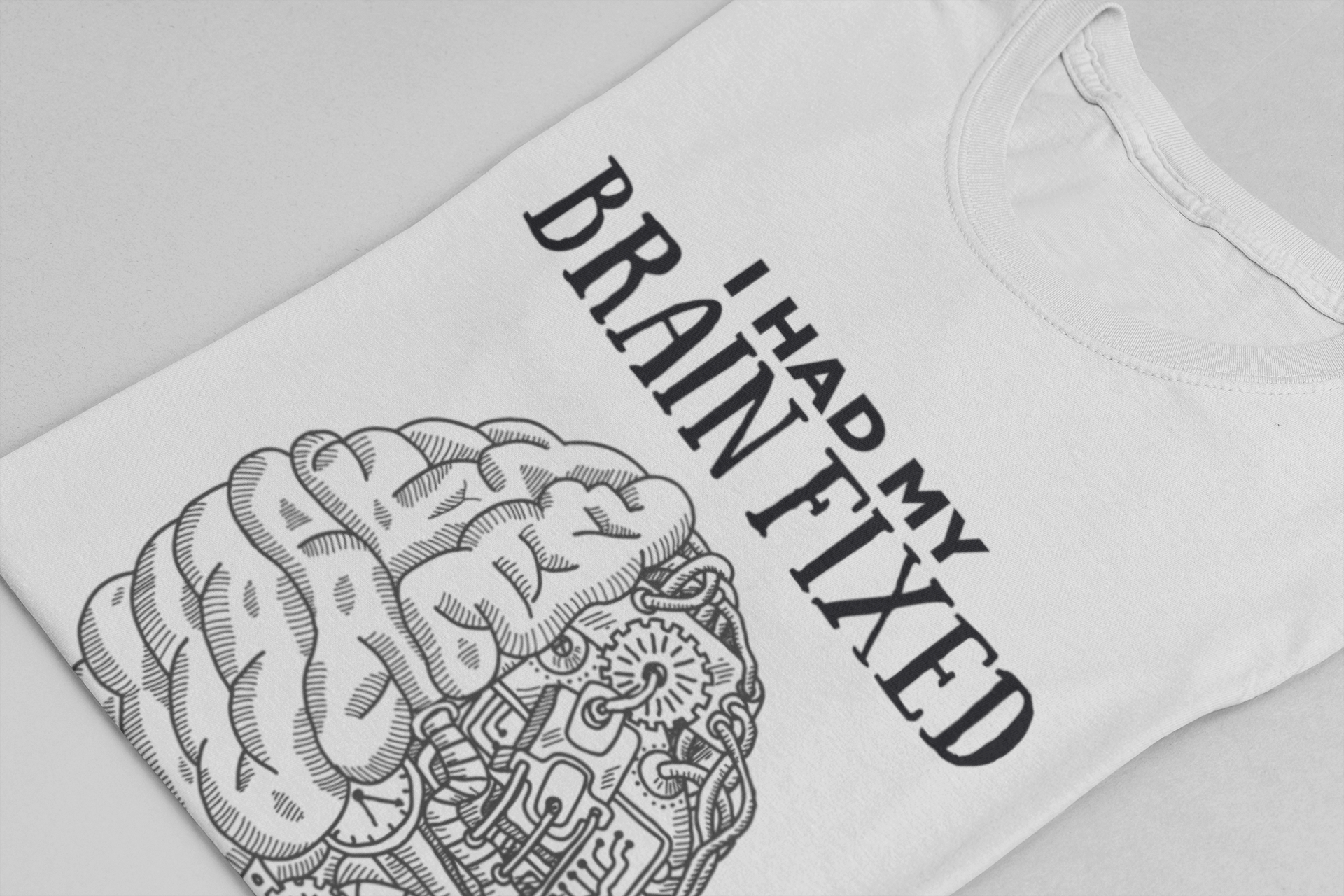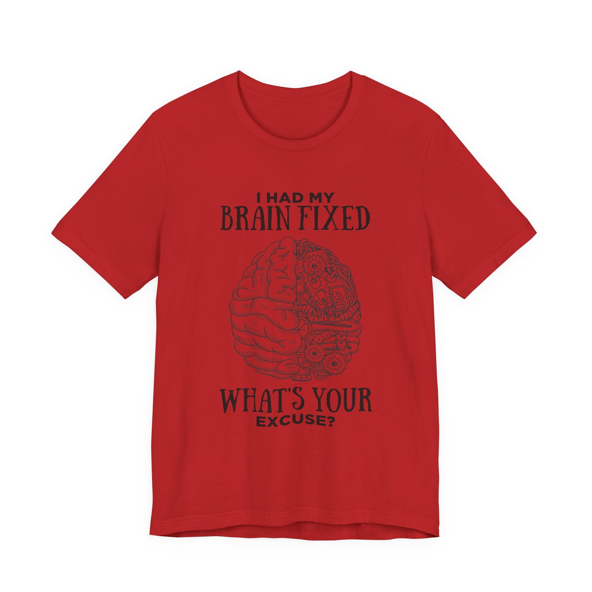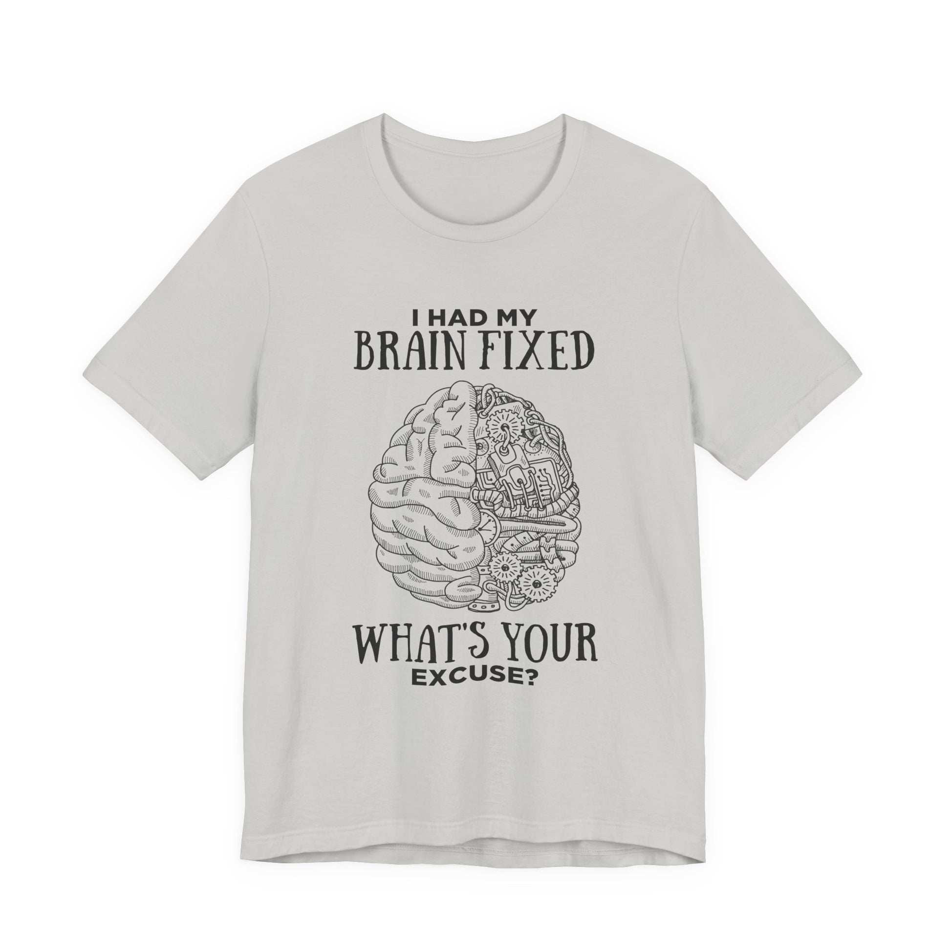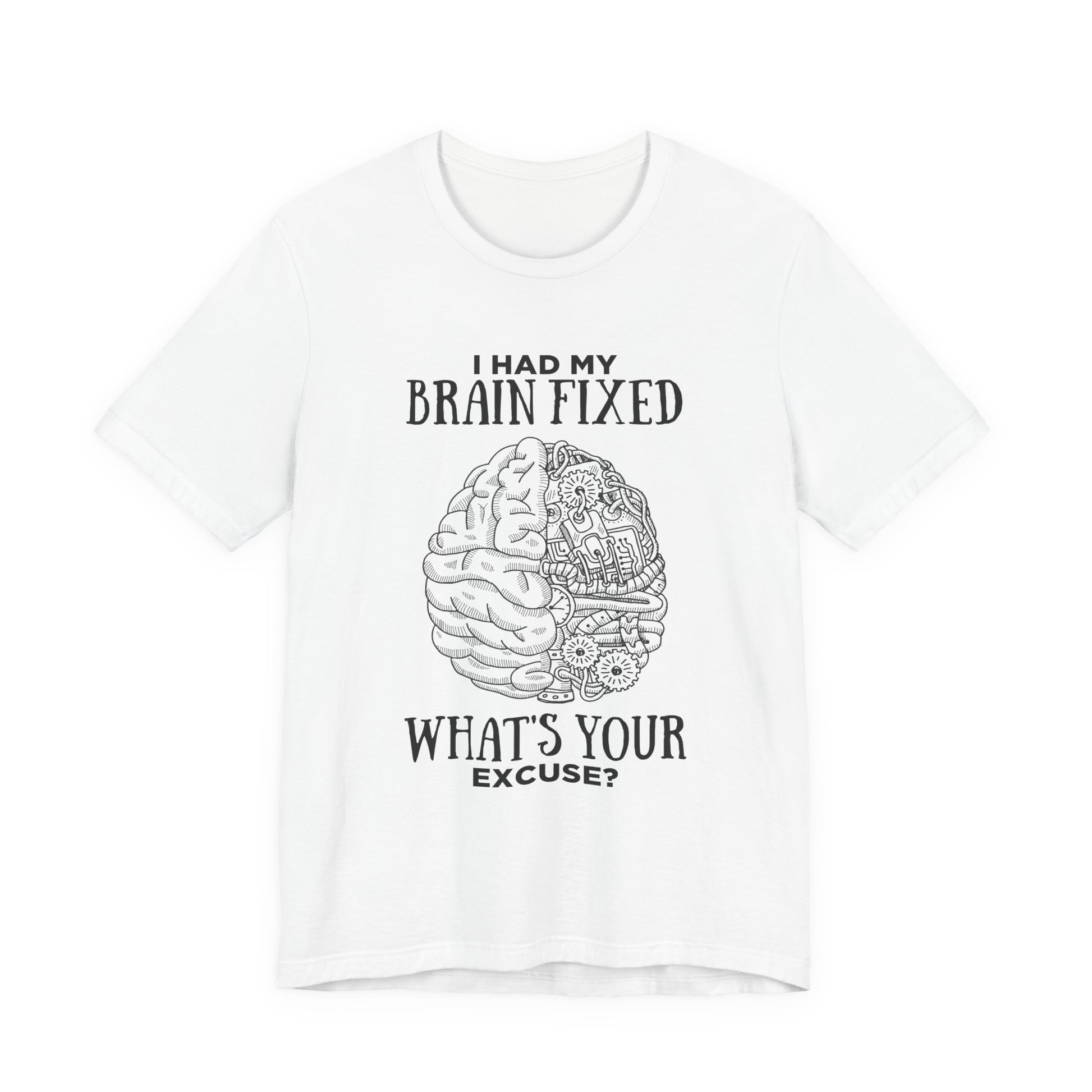 Make a statement with this bold and witty tshirt featuring the text "I had my brain fixed, what's your excuse?" and a striking graphic of a large human brain, half of which is intricately composed of mechanical parts like gears, wires, and other components. This design celebrates the fusion of human intellect and mechanical innovation, perfect for science enthusiasts, engineers, tech lovers, and anyone who appreciates clever, thought-provoking humor. Comfortable and eye-catching, this shirt is ideal for casual wear or as a unique gift for those who love to stand out and inspire curiosity