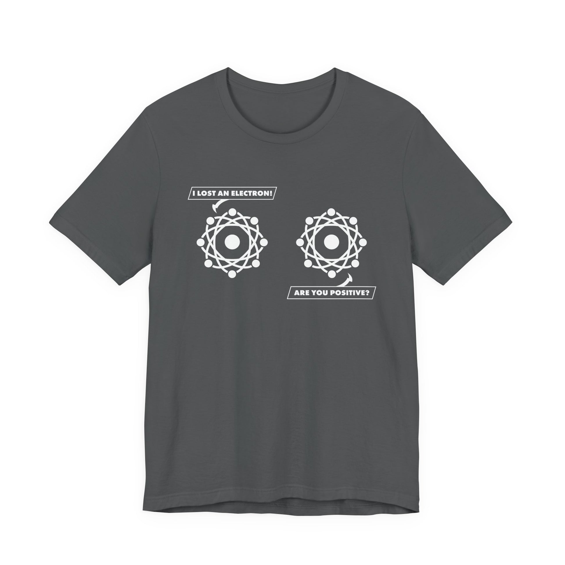 Get a charge out of this hilarious chemistry tshirt featuring the phrase "I Lost an Electron" alongside a thought bubble asking, "Are you positive?" The design shows two playful element characters engaging in a witty science pun about ions and electric charge. Perfect for chemistry students, teachers, scientists, and anyone who loves clever science humor, this tshirt is a fun way to spark smiles in the lab, classroom, or casual settings. Show off your chemistry wit with style and humor!