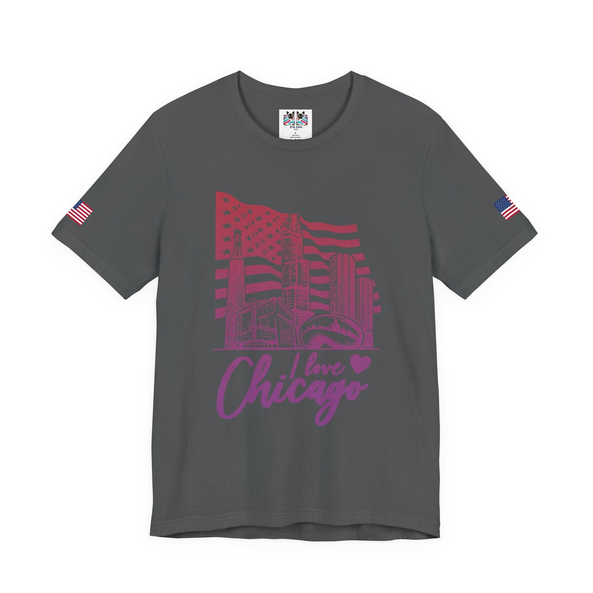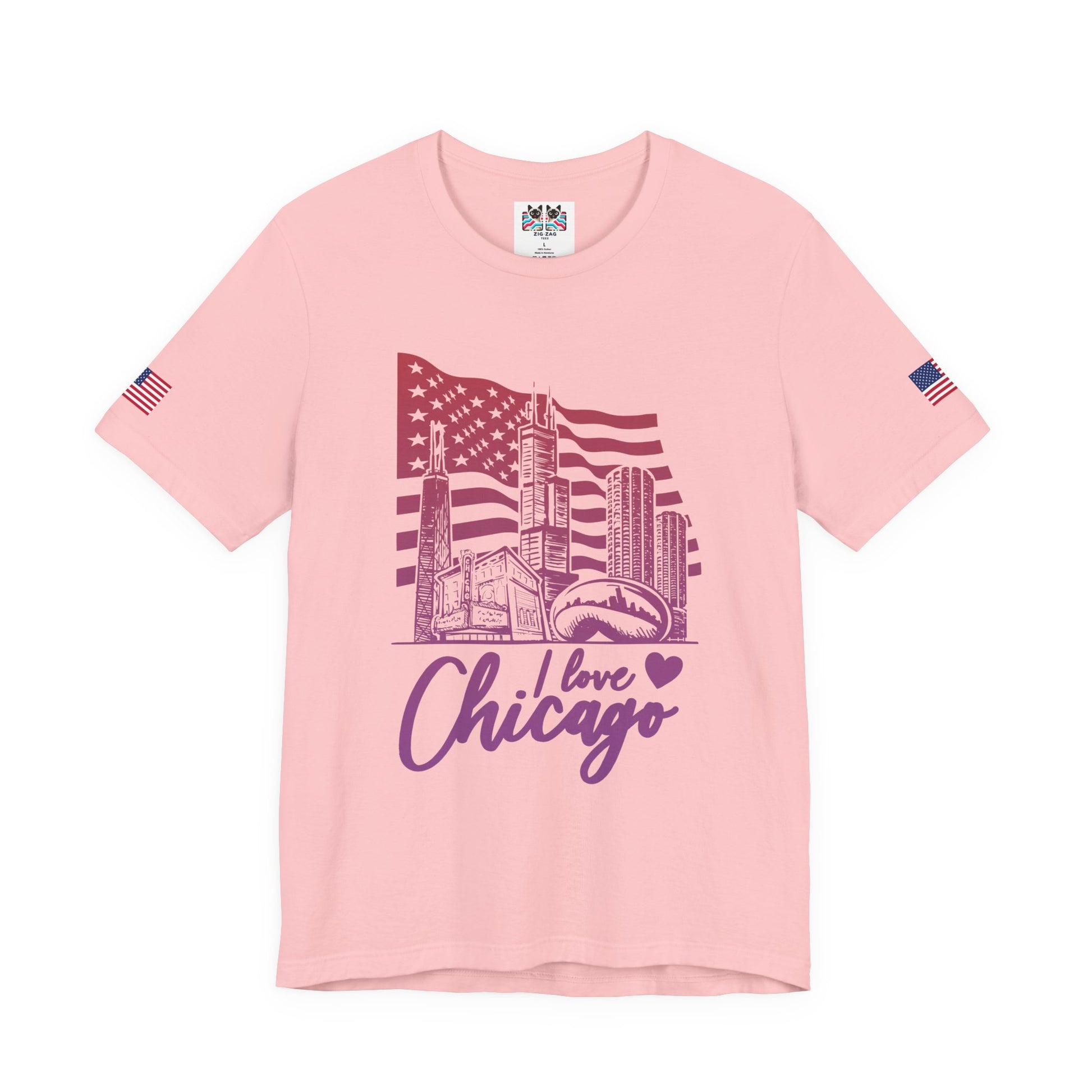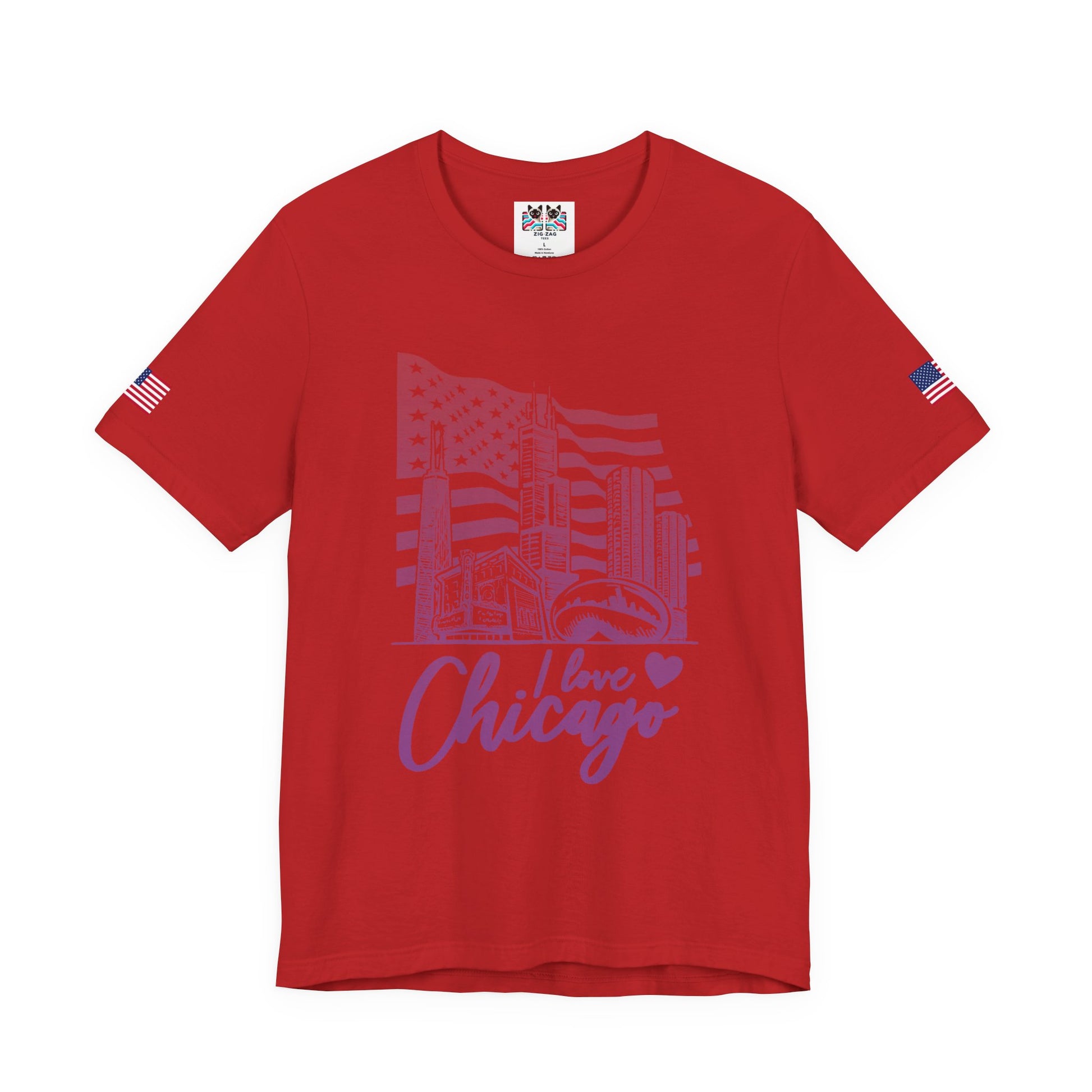 Show your love for the Windy City with this artistic "I Love Chicago" t-shirt featuring iconic Chicago landmarks against an American flag backdrop! The design showcases Willis Tower, John Hancock Center, downtown skyscrapers, Cloud Gate (The Bean), and the Chicago Theatre marquee in purple and yellow tones. The stylized "I love Chicago" script with a purple heart combines city pride with artistic flair. Chicago's famous landmarks make it one of America's most photographable cities - from Millennium Park's Cloud Gate sculpture to the historic Chicago Theatre on State Street. This vibrant orange/gold t-shirt with American flag sleeve patches is perfect for Chicago romantics, tourists who fell in love with the city, Illinois residents, architecture tour enthusiasts, or anyone with heartfelt Chicago connections. Ideal for date nights in Chicago, engagement photos downtown, Michigan Avenue strolls, or expressing genuine affection for the greatest city in the Midwest.