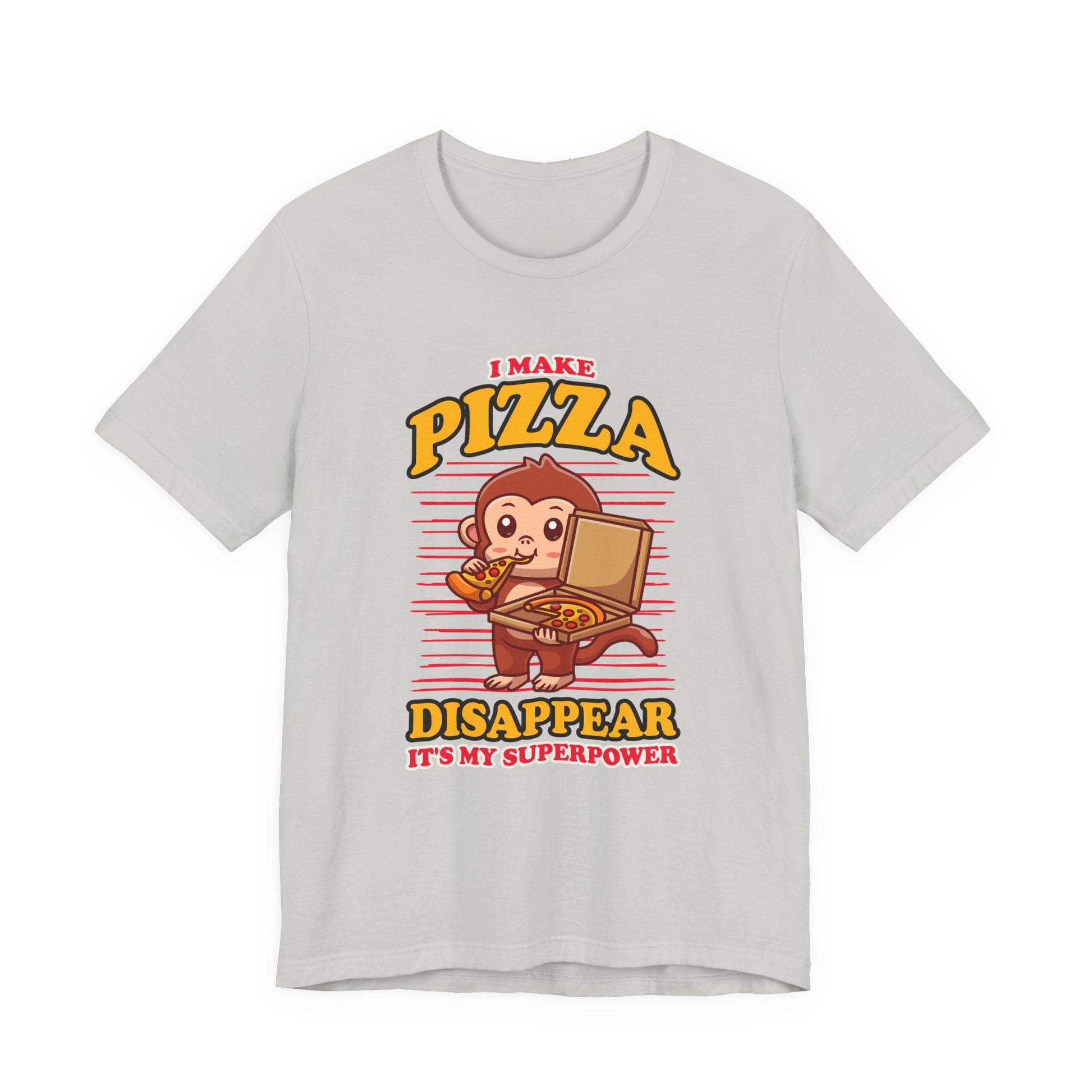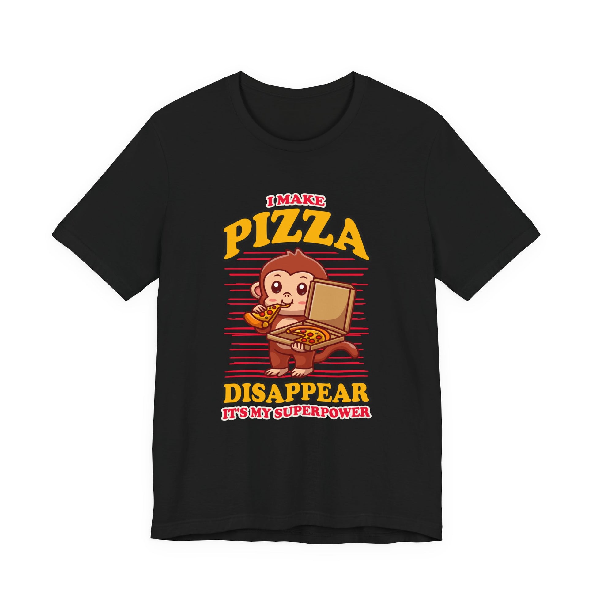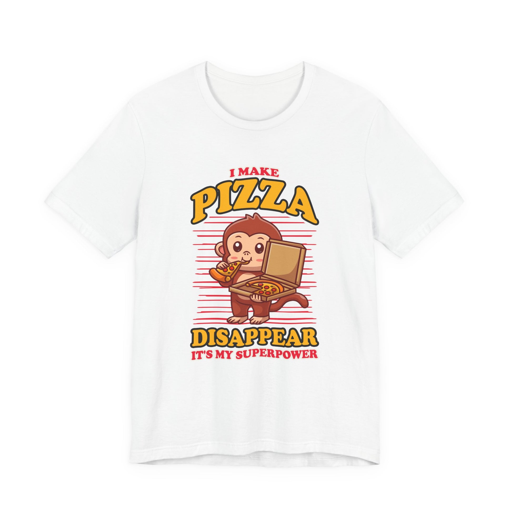 Show off your love for pizza and cheeky humor with this adorable T-shirt! Featuring a cool monkey holding an open pizza box in one hand and a slice of pizza in the other, paired with the playful phrase, “I make PIZZA Disappear, It's my Super Power.” Perfect for pizza enthusiasts, monkey lovers, and anyone who enjoys fun, bold statements. A great casual wear option or a quirky gift for friends who share a passion for tasty treats.