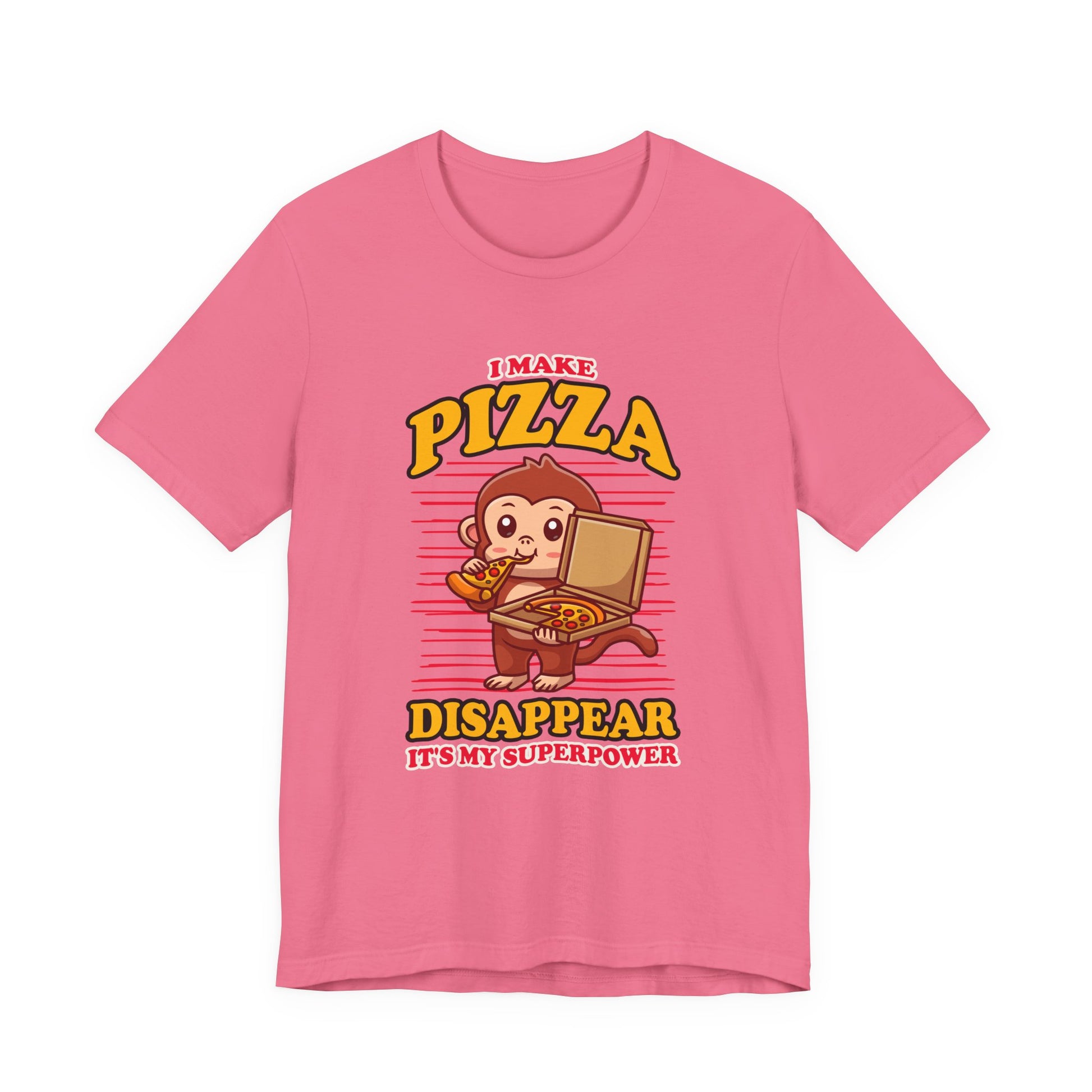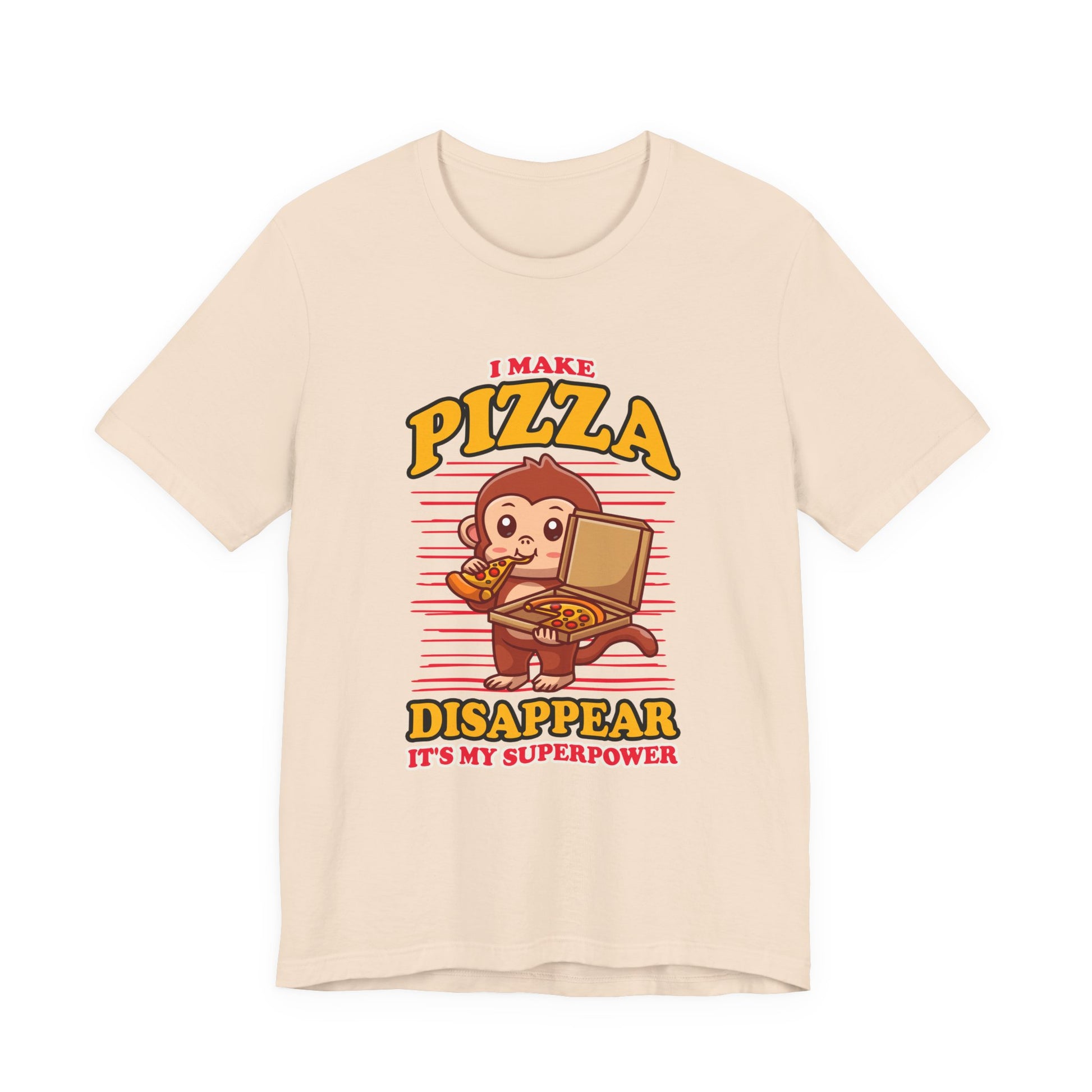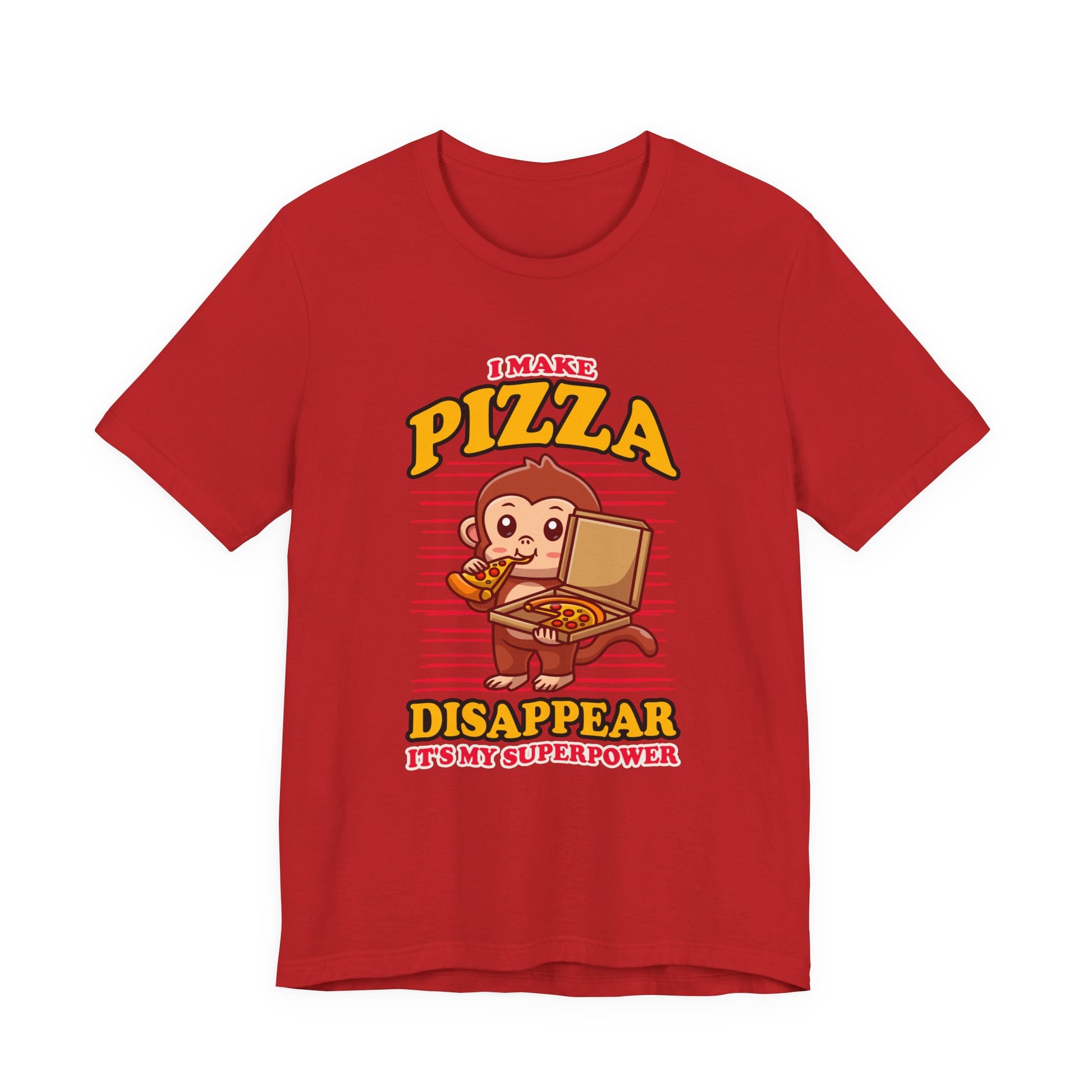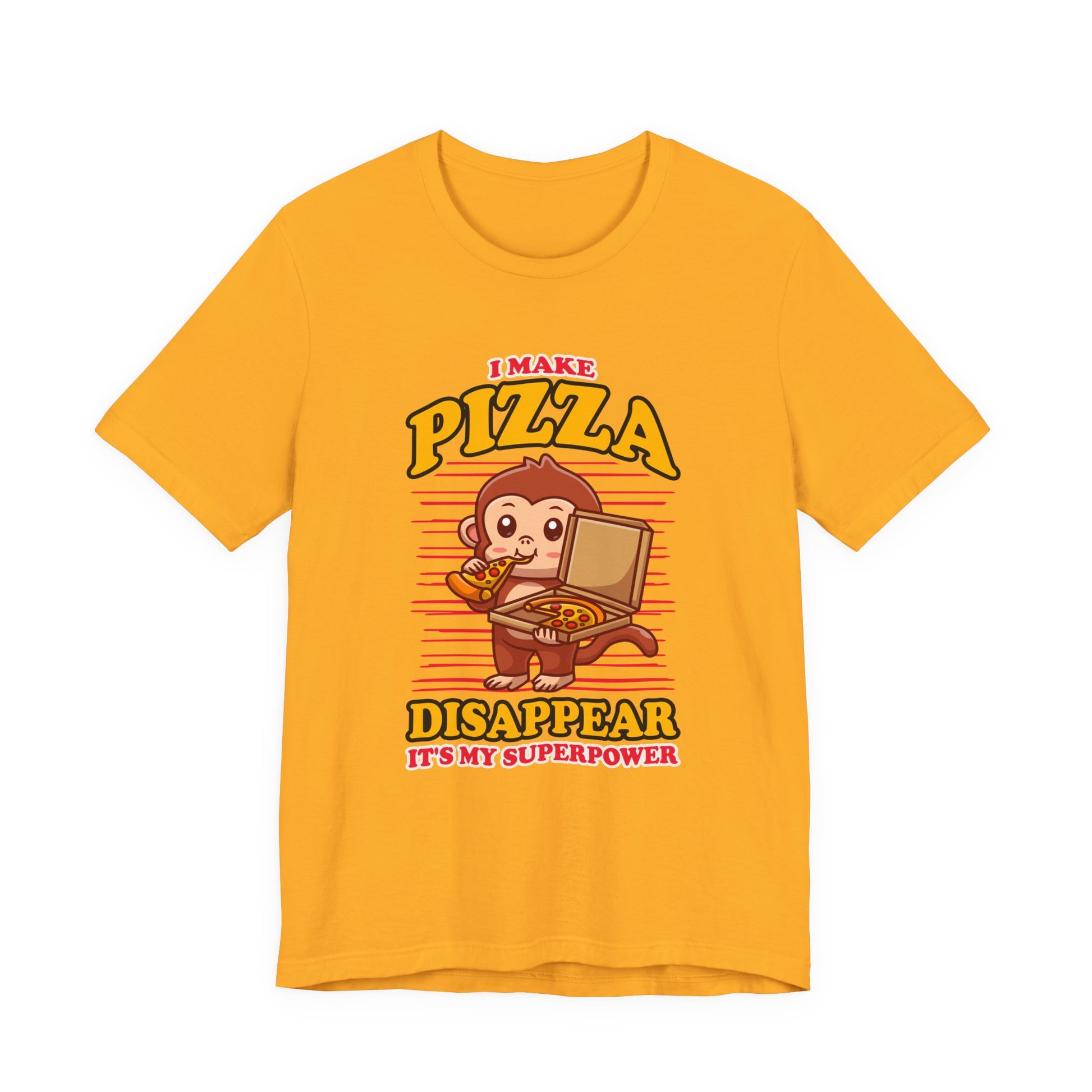Show off your love for pizza and cheeky humor with this adorable T-shirt! Featuring a cool monkey holding an open pizza box in one hand and a slice of pizza in the other, paired with the playful phrase, “I make PIZZA Disappear, It's my Super Power.” Perfect for pizza enthusiasts, monkey lovers, and anyone who enjoys fun, bold statements. A great casual wear option or a quirky gift for friends who share a passion for tasty treats.