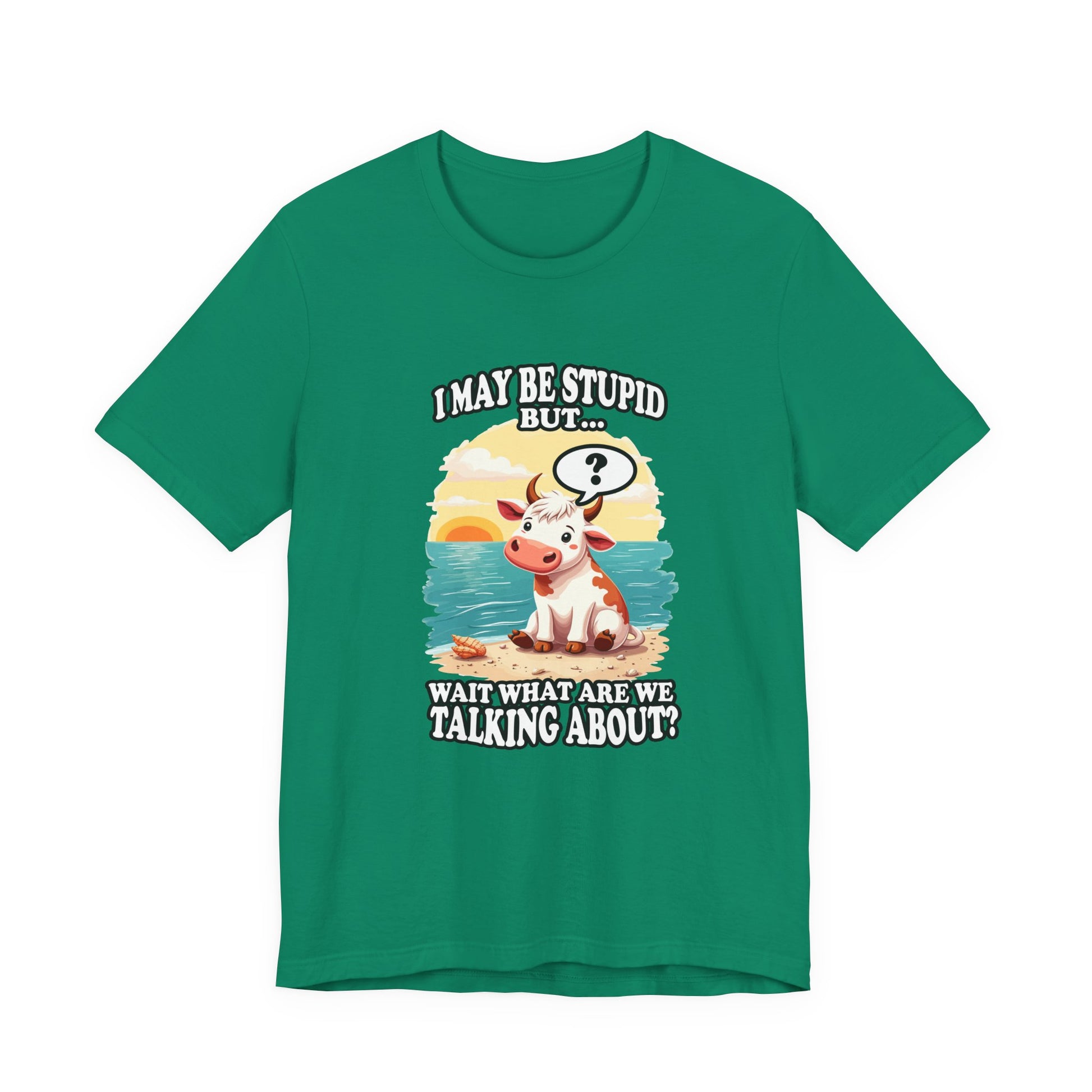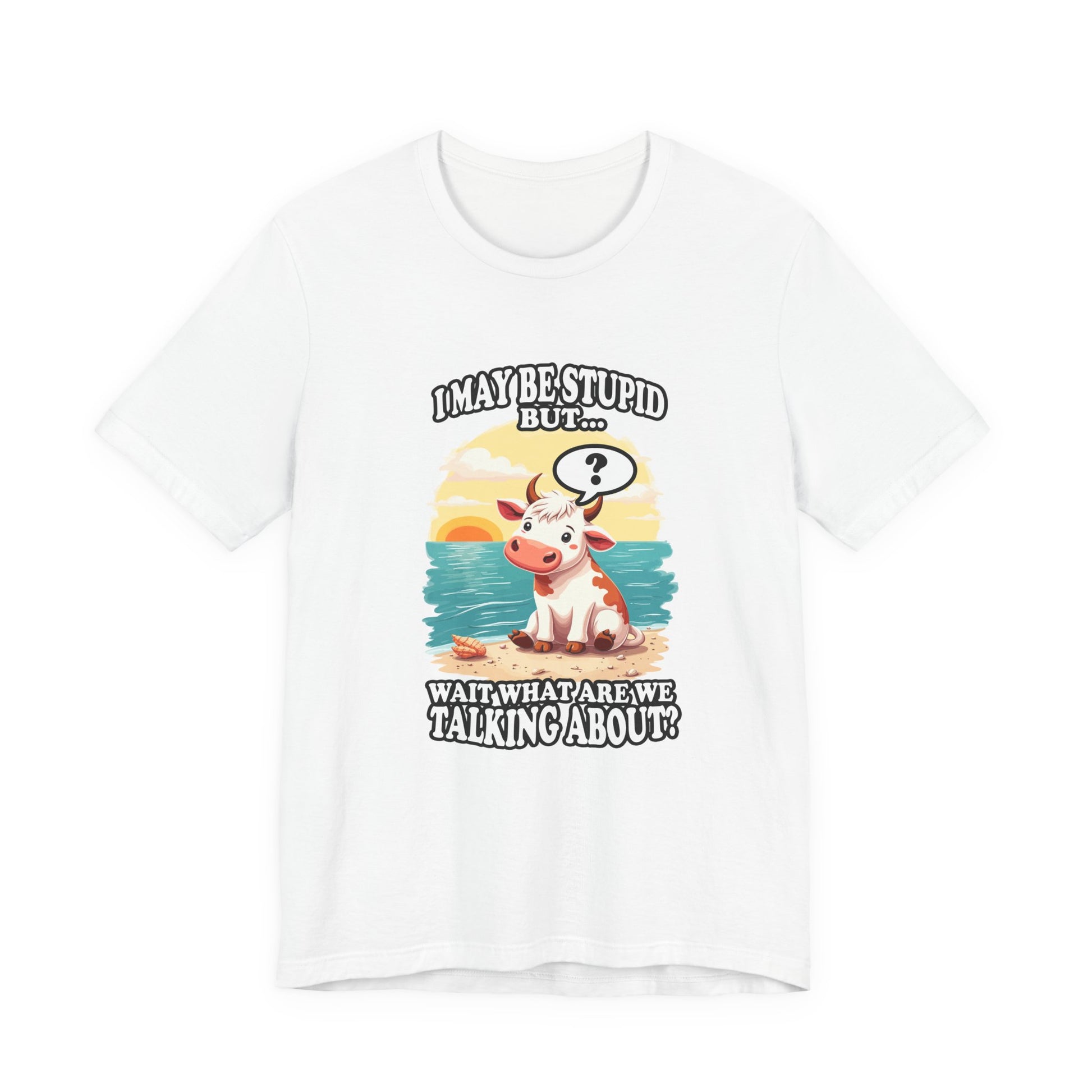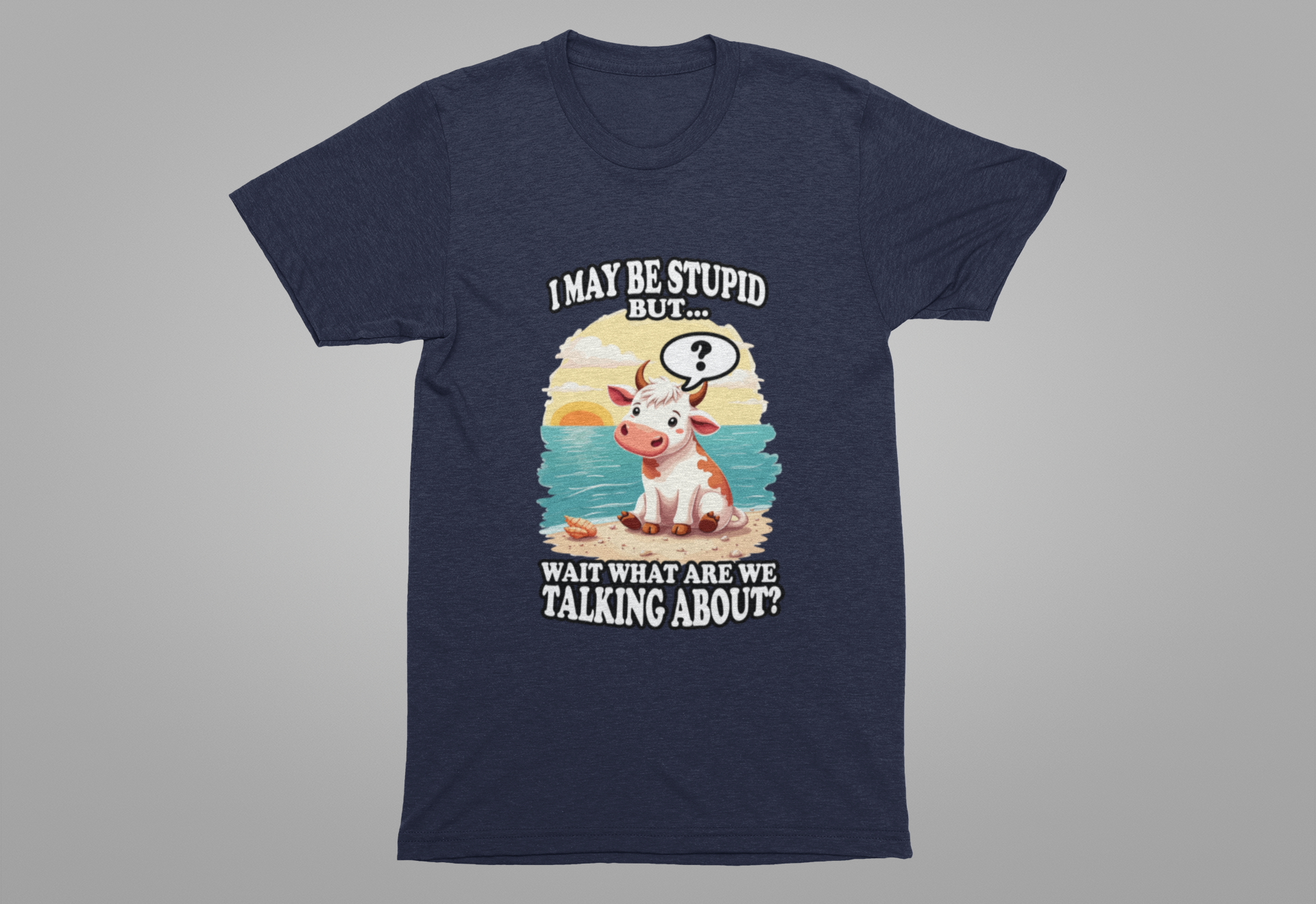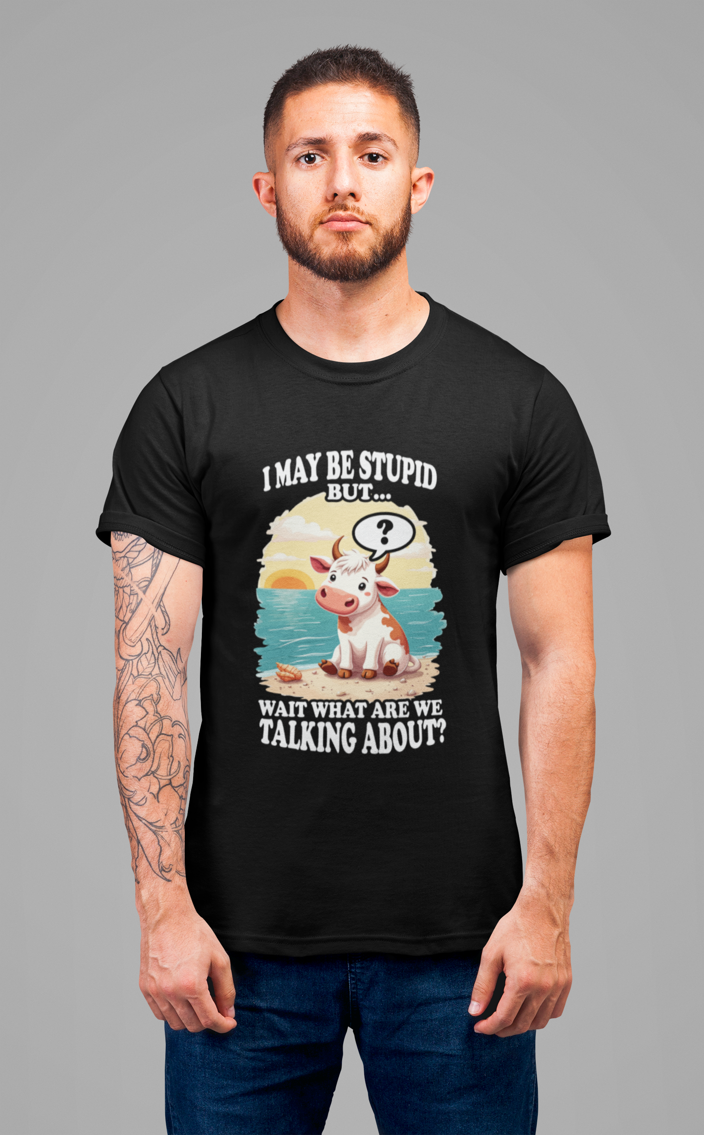 Bring humor and charm to your wardrobe with this funny tshirt featuring a confused-looking cow sitting by the beach shore, thinking, "I may be stupid but... wait, what are we talking about?" The playful design captures a lighthearted, relatable moment with a cute cow and a whimsical thought bubble. Perfect for animal lovers, meme fans, and anyone who enjoys a good laugh, this tshirt is great for casual wear, beach days, or as a unique gift for friends and family.