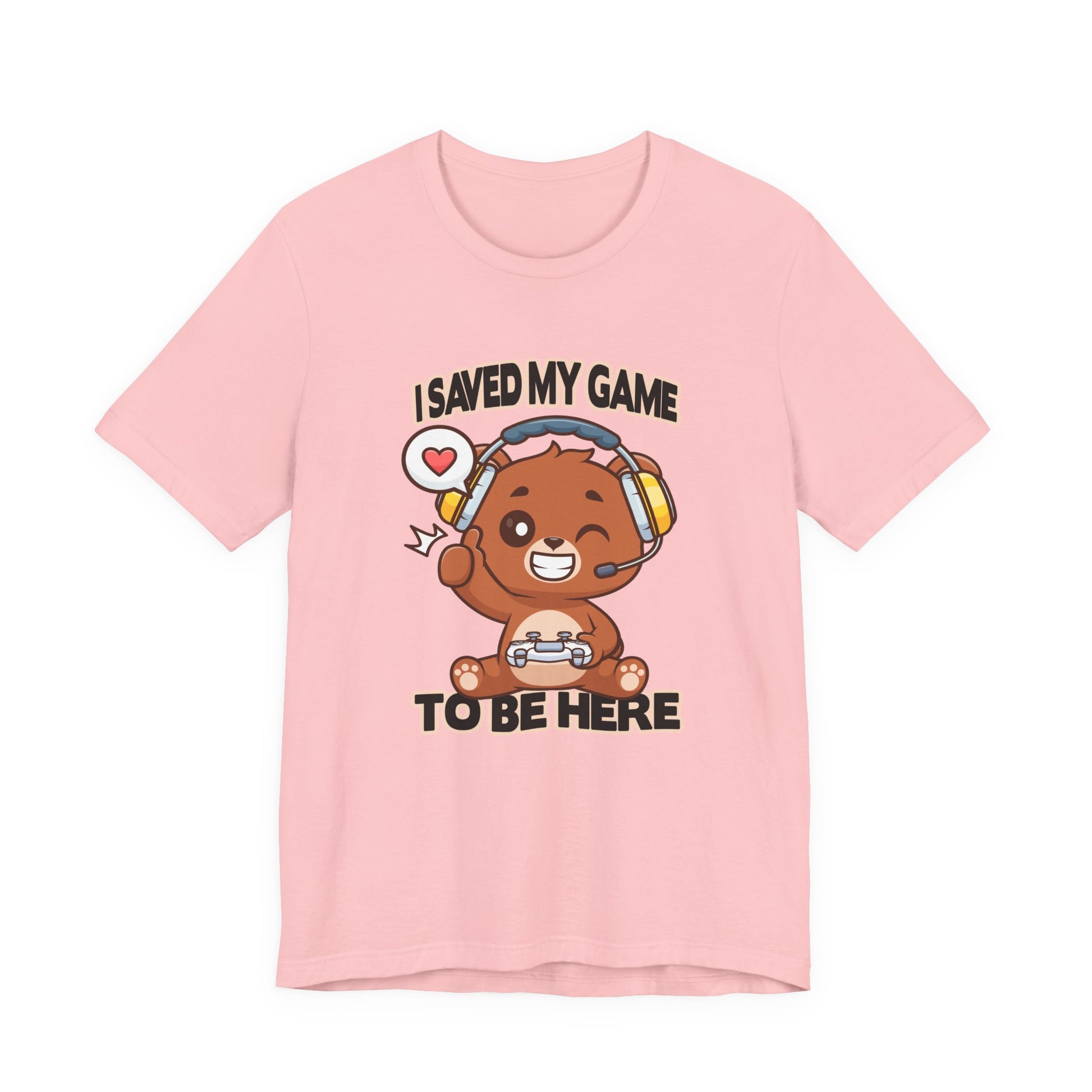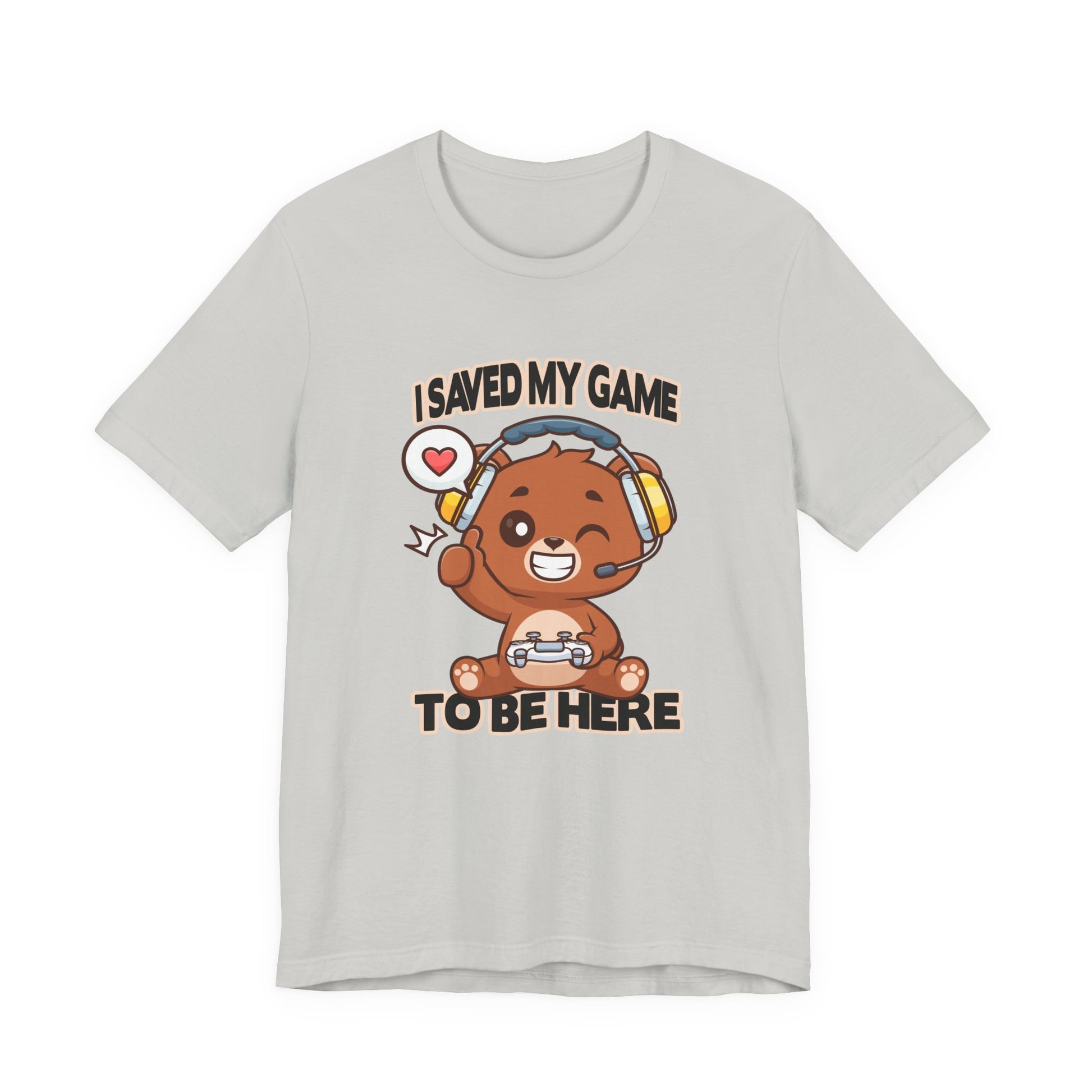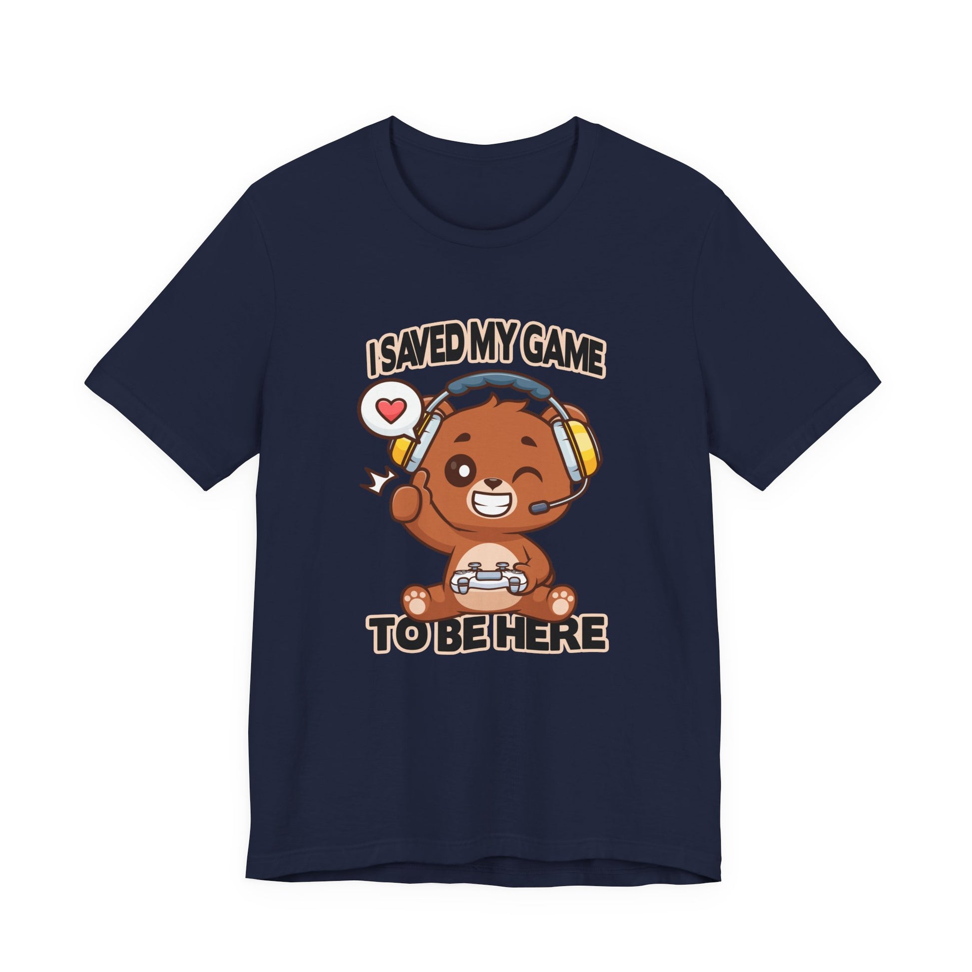 Show your playful gamer spirit with this adorable tshirt featuring a winking teddy bear wearing headphones and holding a game controller or joystick. The fun graphic captures the cozy charm of a classic teddy bear combined with the excitement of gaming culture. Above or near the design, the clever text "I saved my game to be here" adds whimsy and a nod to gamers who know the importance of hitting pause to enjoy the moment. Perfect for casual wear, gaming events, or as a gift for teddy bear fans and gamers alike, this soft, comfortable tshirt blends cute and cool seamlessly.