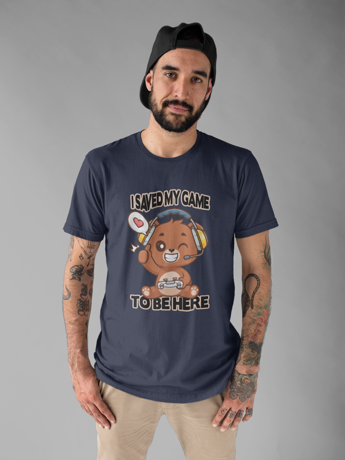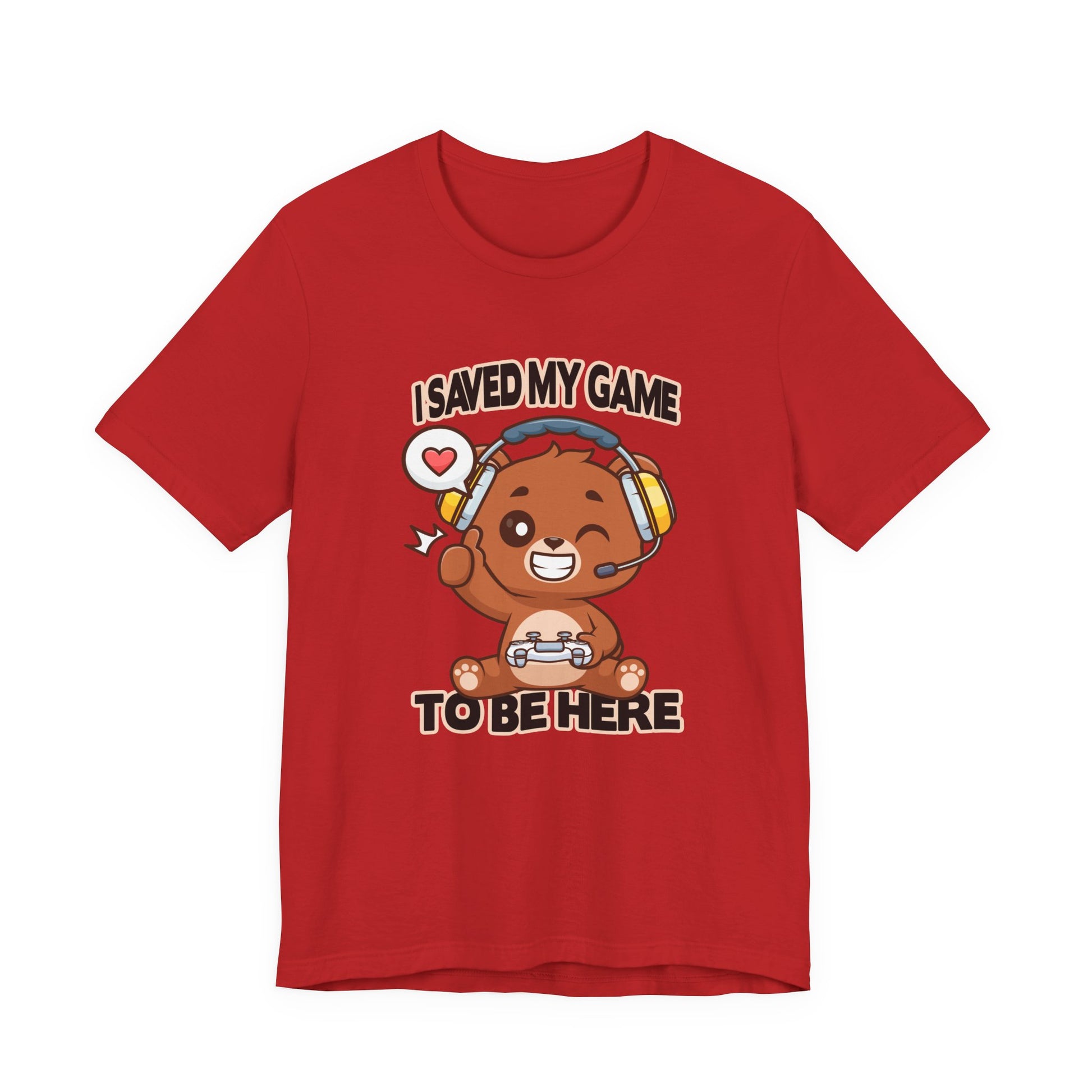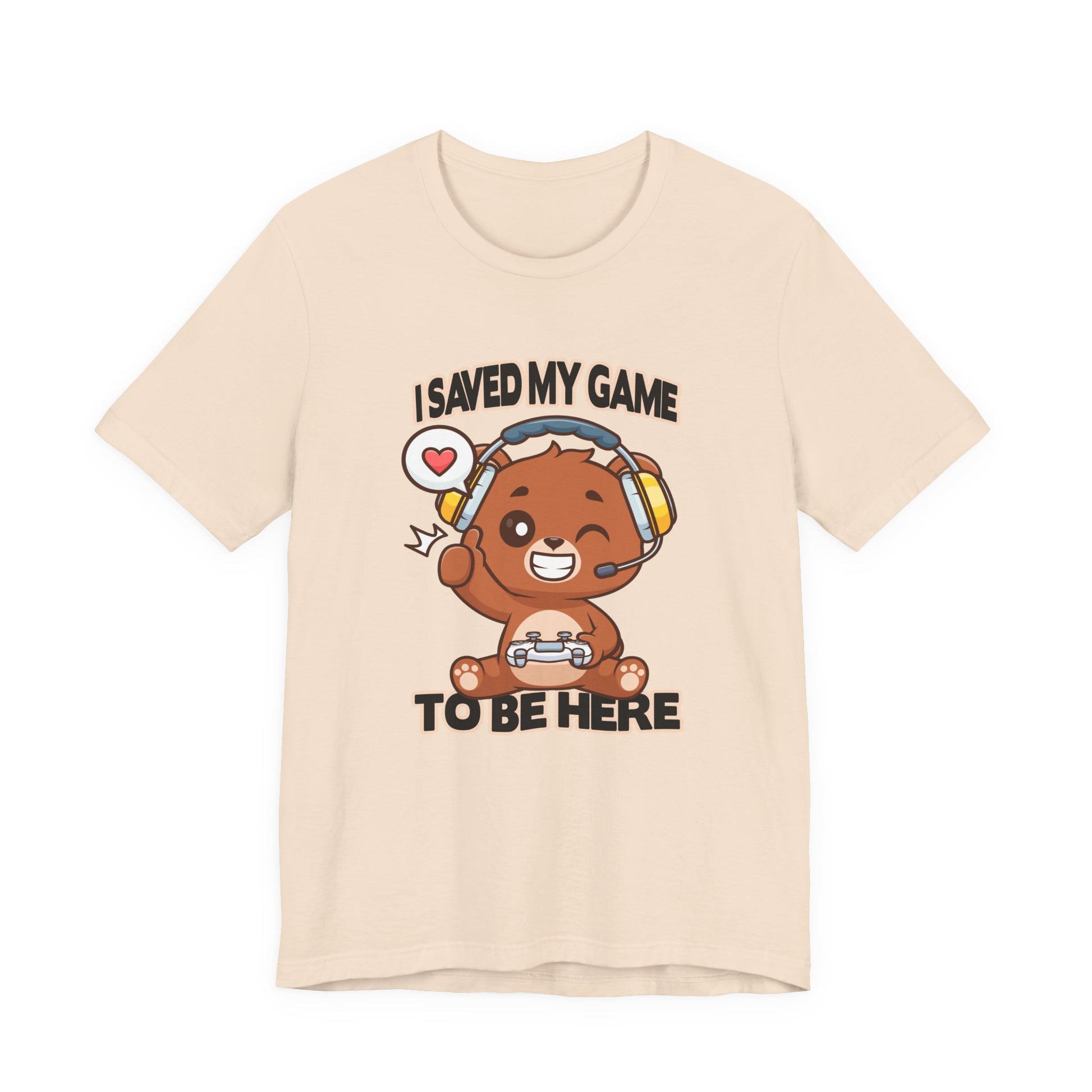 Show your playful gamer spirit with this adorable tshirt featuring a winking teddy bear wearing headphones and holding a game controller or joystick. The fun graphic captures the cozy charm of a classic teddy bear combined with the excitement of gaming culture. Above or near the design, the clever text "I saved my game to be here" adds whimsy and a nod to gamers who know the importance of hitting pause to enjoy the moment. Perfect for casual wear, gaming events, or as a gift for teddy bear fans and gamers alike, this soft, comfortable tshirt blends cute and cool seamlessly.