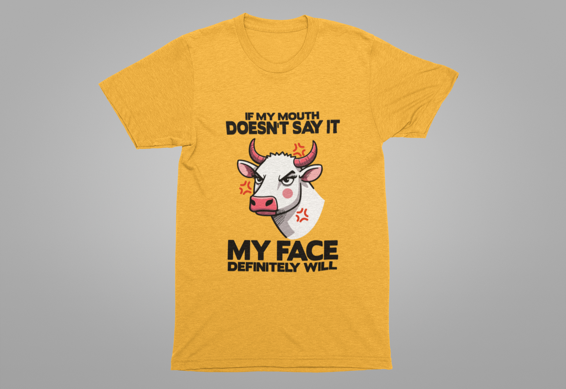 Make a bold and humorous statement with this striking t shirt featuring a large, staring bull with short horns at the center and the witty text "If my mouth doesn't say MY FACE Definitely will." This design captures the idea of unspoken feelings expressed through facial expressions, paired with the fierce and attentive bull graphic for added impact. Perfect for those who love clever sayings, animal motifs, or want to show a playful edge in their style. Comfortable and eye-catching, this tee is ideal for casual wear, gifts, or anyone who appreciates a bit of attitude and humor.