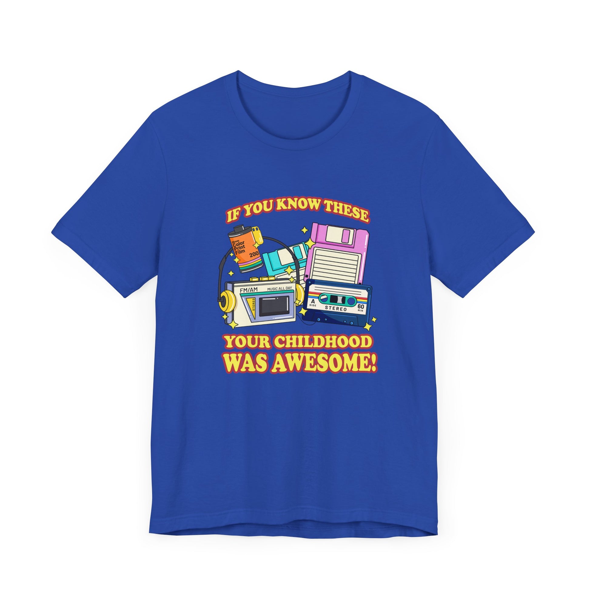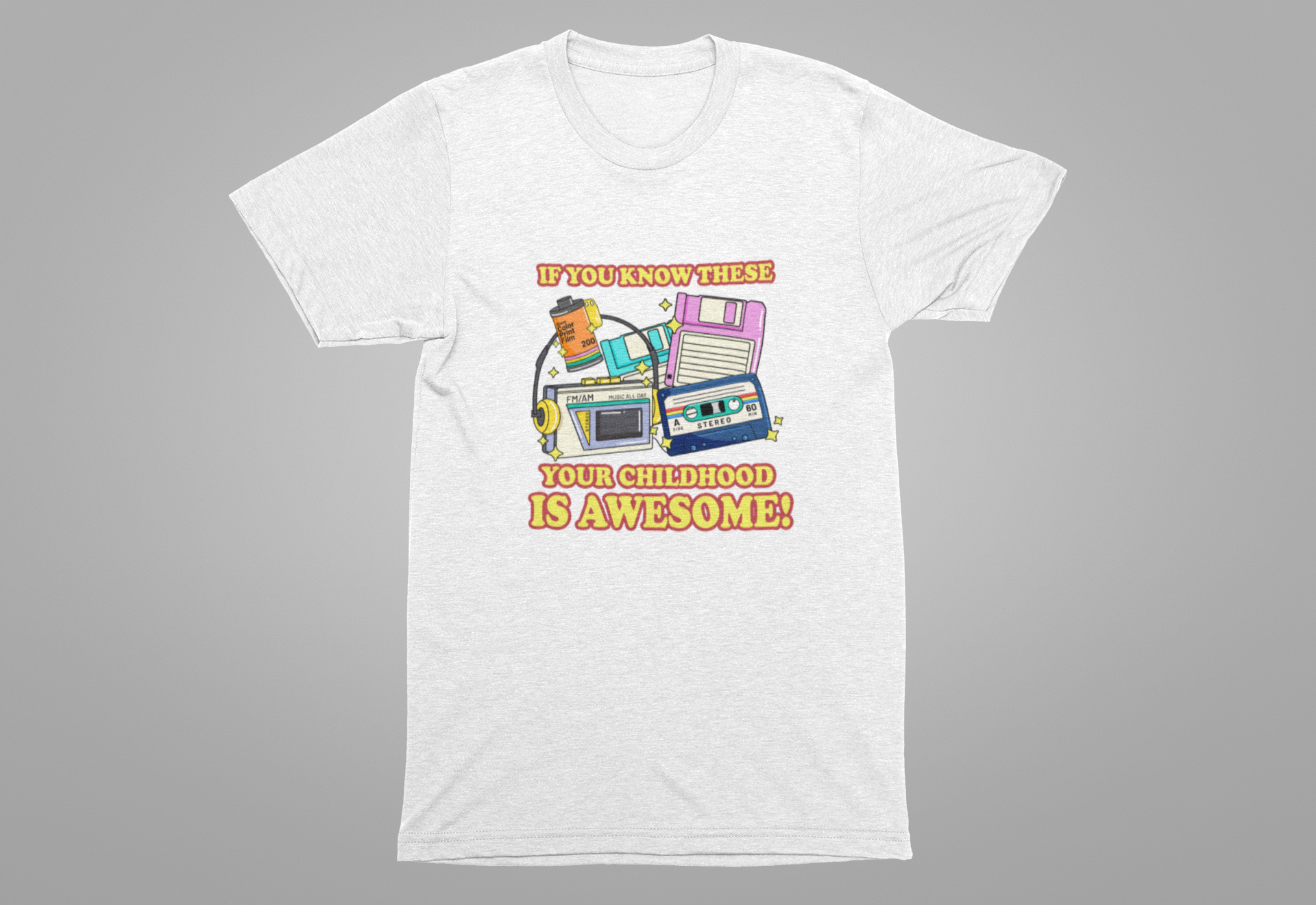 Celebrate the golden days of childhood with this “If You Know These Your Childhood Is Awesome!” t-shirt! Featuring a colorful, retro design with classic icons like a cassette tape, floppy disk, film roll, and a vintage FM/AM radio, this tee is a must-have for anyone who grew up in the 80s or 90s. Whether you’re a nostalgic tech lover or just want to show off your awesome childhood memories, this shirt is sure to spark conversations and smiles.