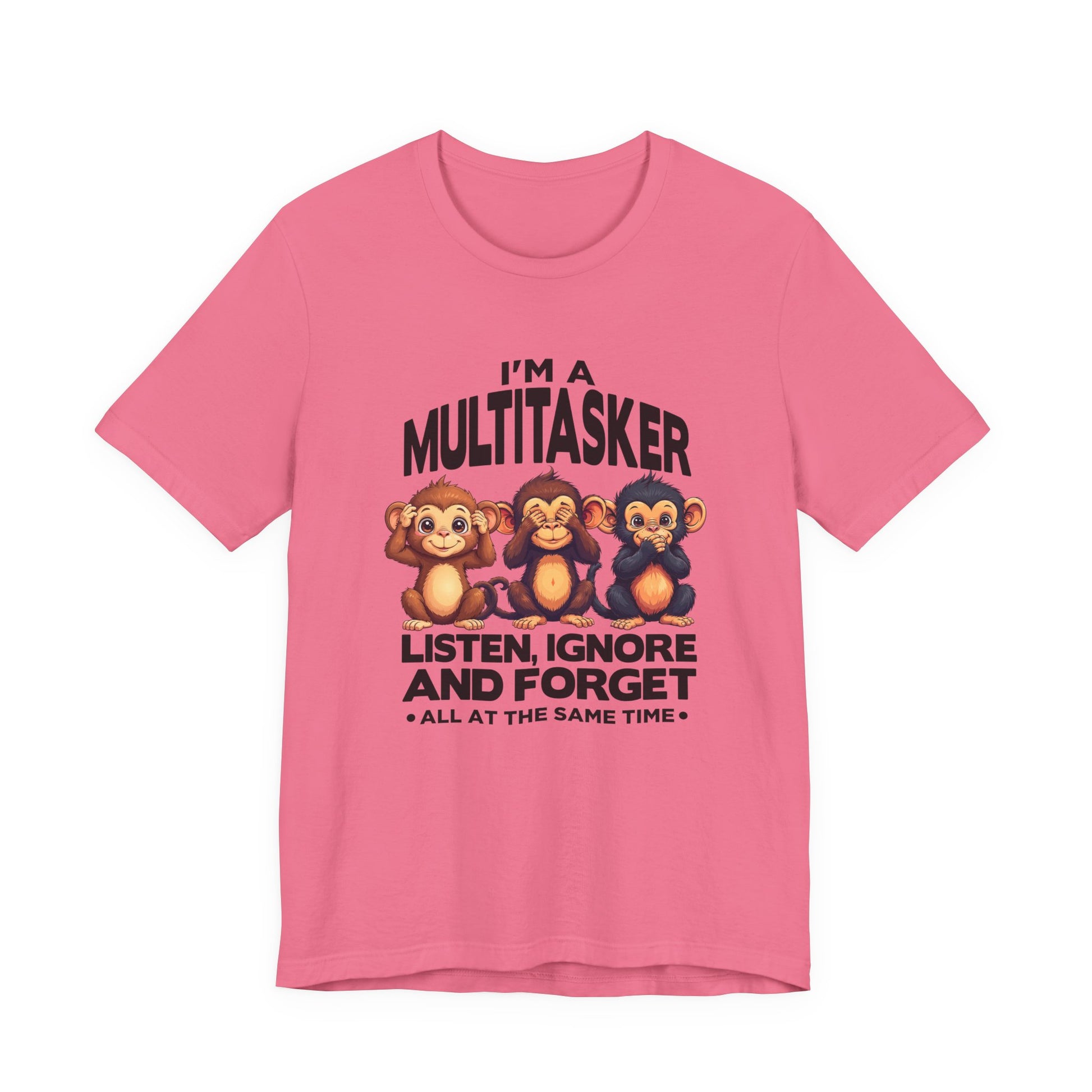 Show off your multitasking skills with a humorous twist in this tshirt featuring three smiling monkeys embodying the classic "See No Evil, Hear No Evil, Speak No Evil" pose. The text reads, "I'm a multitasker: Listen, Ignore and Forget all at the same time," perfectly capturing the playful spirit of selective attention. Ideal for anyone who appreciates clever humor, this design blends iconic imagery with a witty message, making it a great gift for friends, coworkers, or yourself. Comfortable and fun, it’s perfect for casual wear or as a conversation starter.