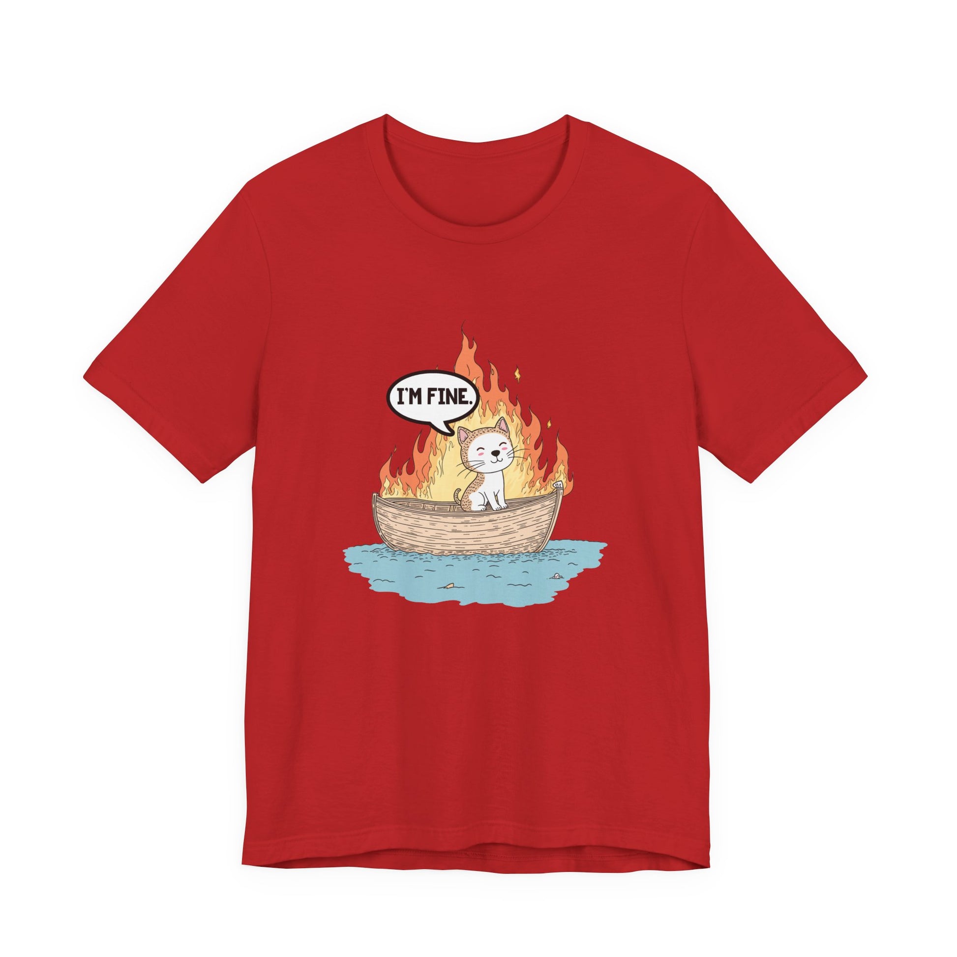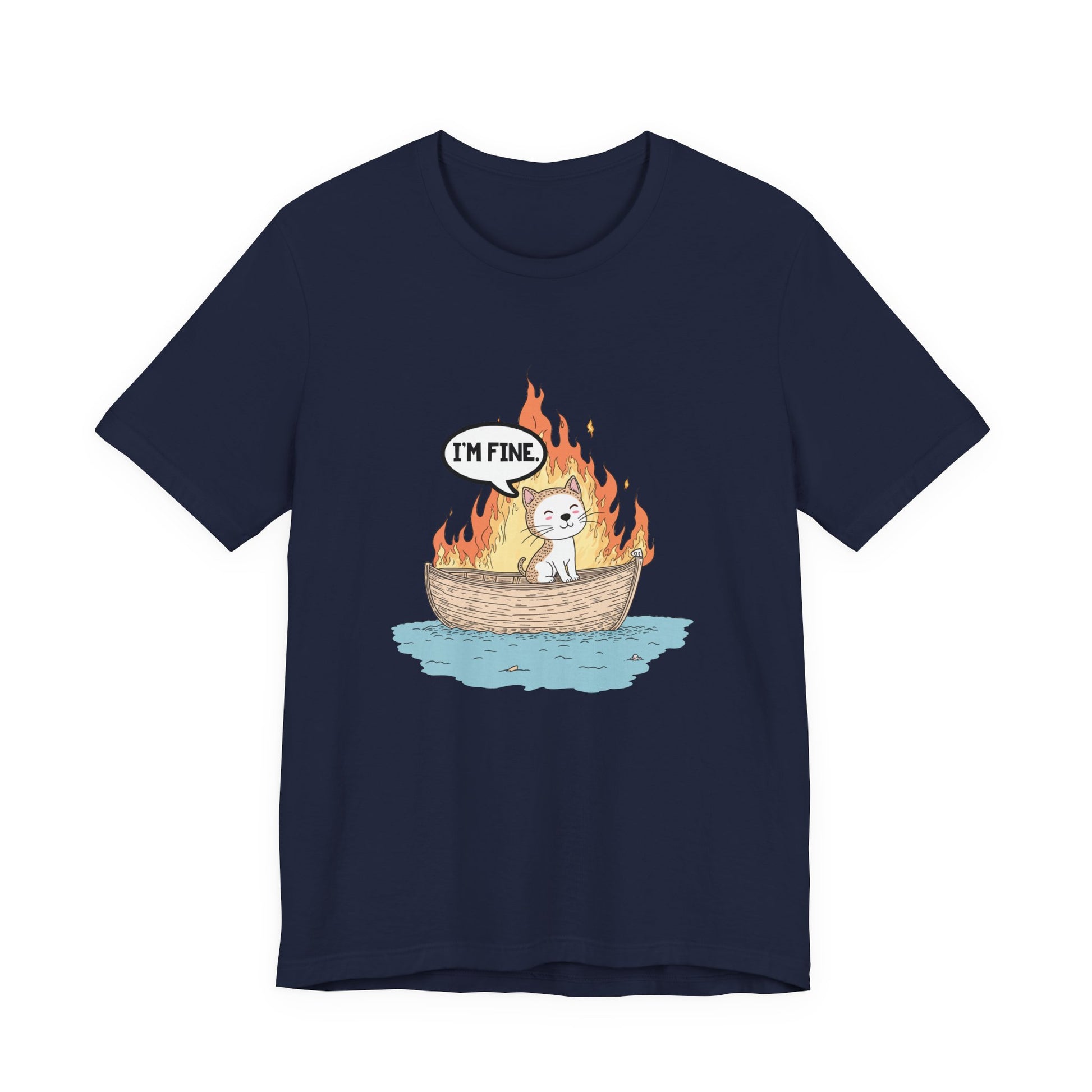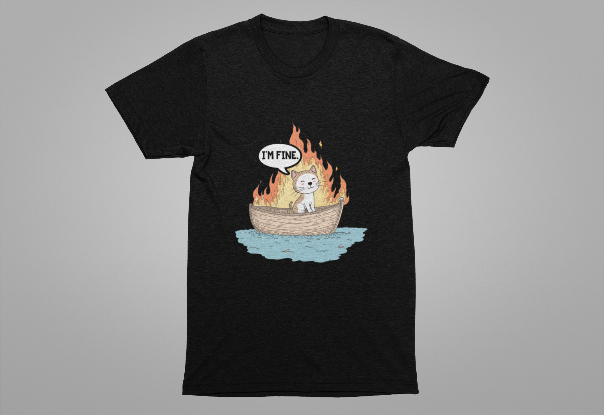 Express a darkly humorous vibe with this striking tshirt featuring a calm cat sitting in a small boat engulfed in flames, accompanied by a thought bubble that says "I'm Fine." This clever graphic captures the ironic contrast between the chaotic fiery scene and the cat's nonchalant attitude, perfect for those who appreciate sarcastic wit, meme culture, or a playful take on stressful situations. Ideal for cat lovers, fans of quirky humor, or anyone wanting a bold and eye-catching statement piece. Made from soft, comfortable fabric, this tshirt is great for casual wear, gifts, or sharing a smile with a side of irony.