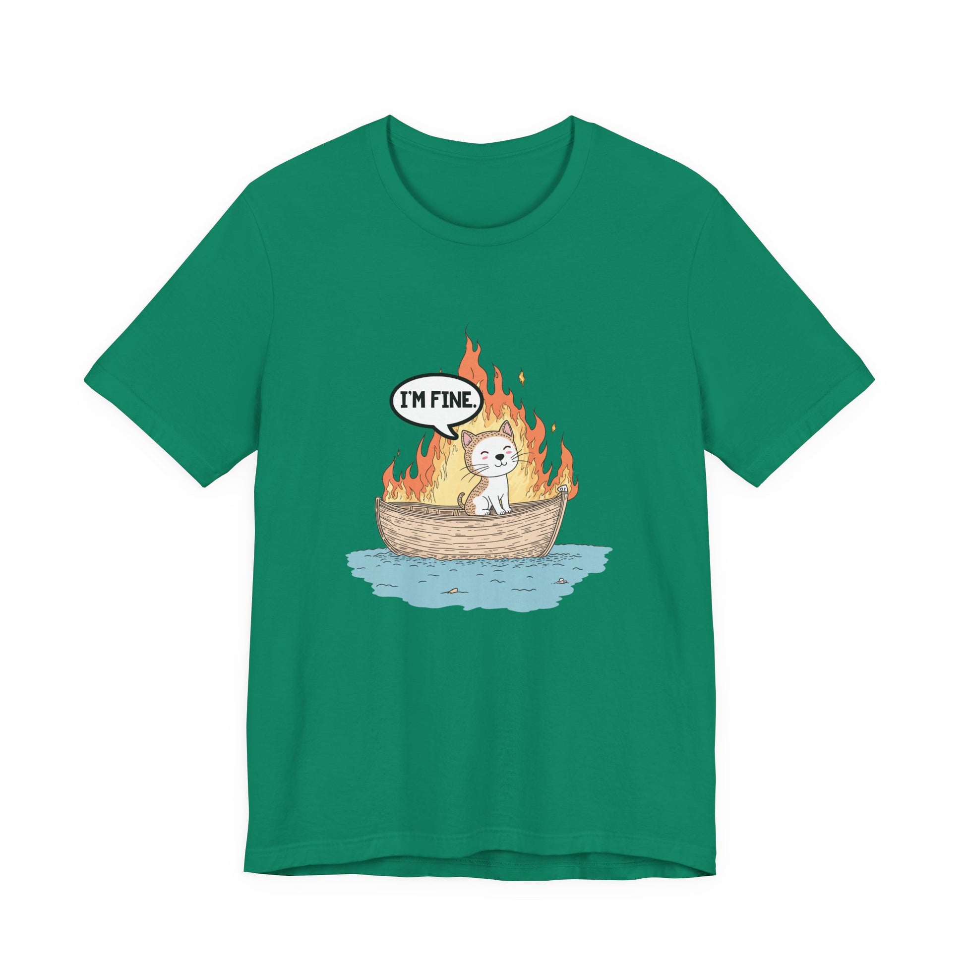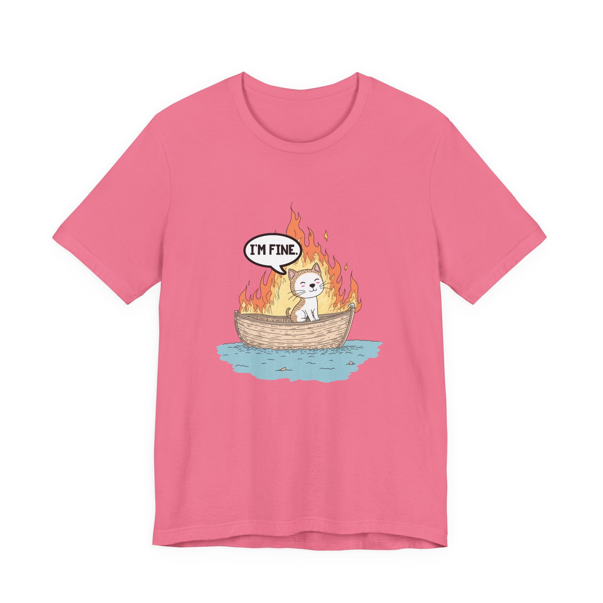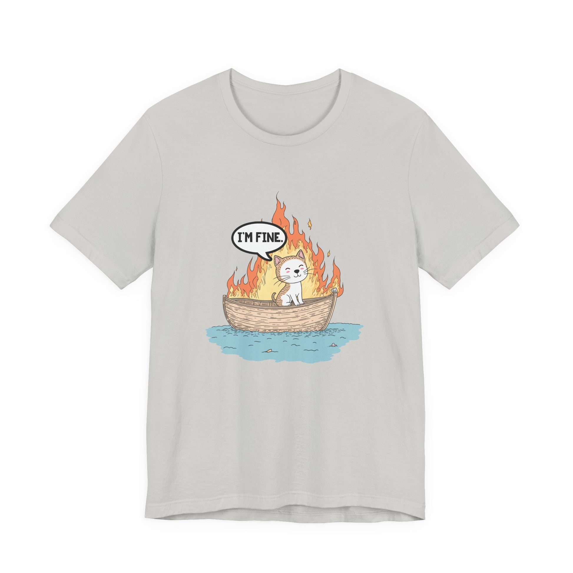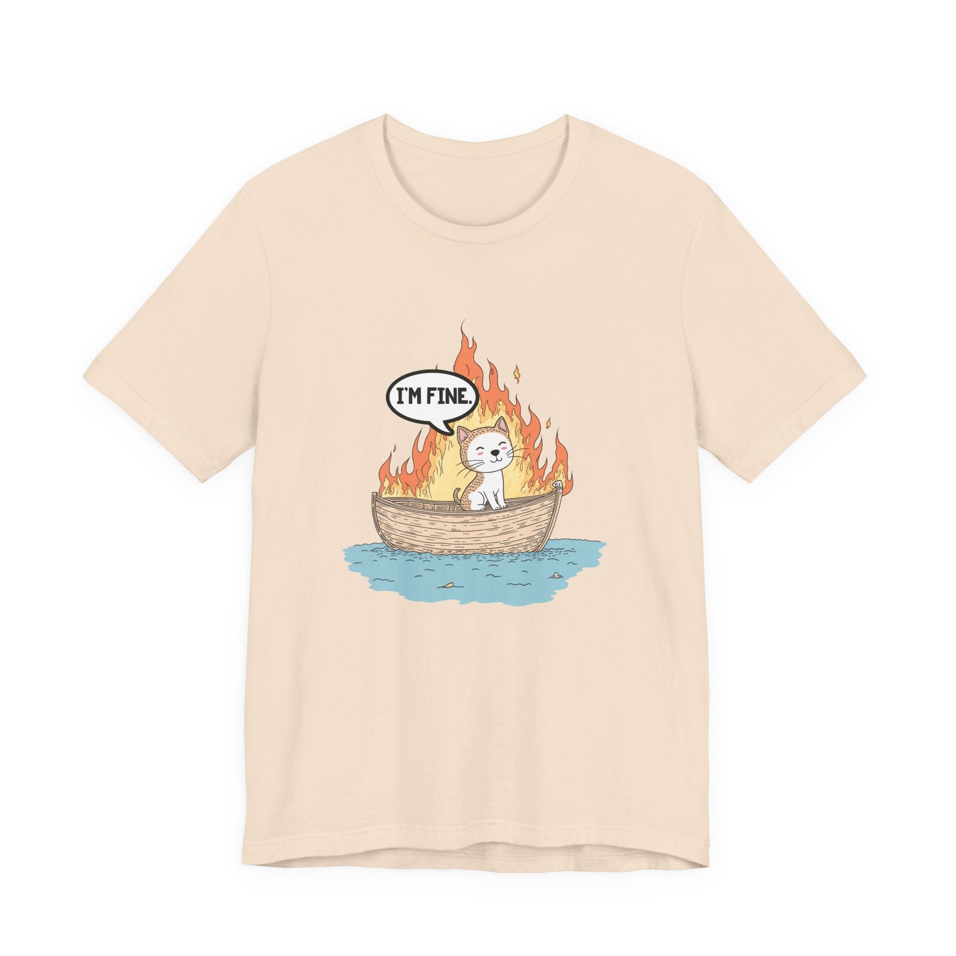 Express a darkly humorous vibe with this striking tshirt featuring a calm cat sitting in a small boat engulfed in flames, accompanied by a thought bubble that says "I'm Fine." This clever graphic captures the ironic contrast between the chaotic fiery scene and the cat's nonchalant attitude, perfect for those who appreciate sarcastic wit, meme culture, or a playful take on stressful situations. Ideal for cat lovers, fans of quirky humor, or anyone wanting a bold and eye-catching statement piece. Made from soft, comfortable fabric, this tshirt is great for casual wear, gifts, or sharing a smile with a side of irony.