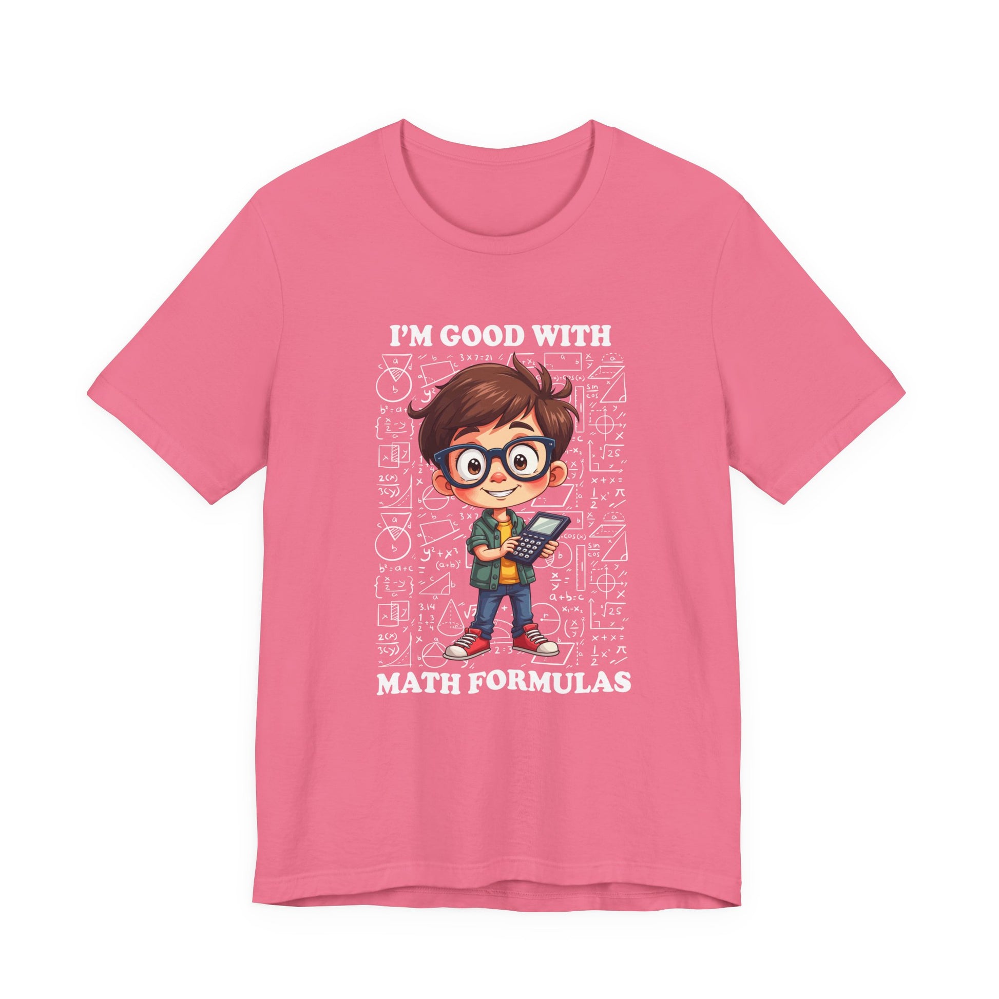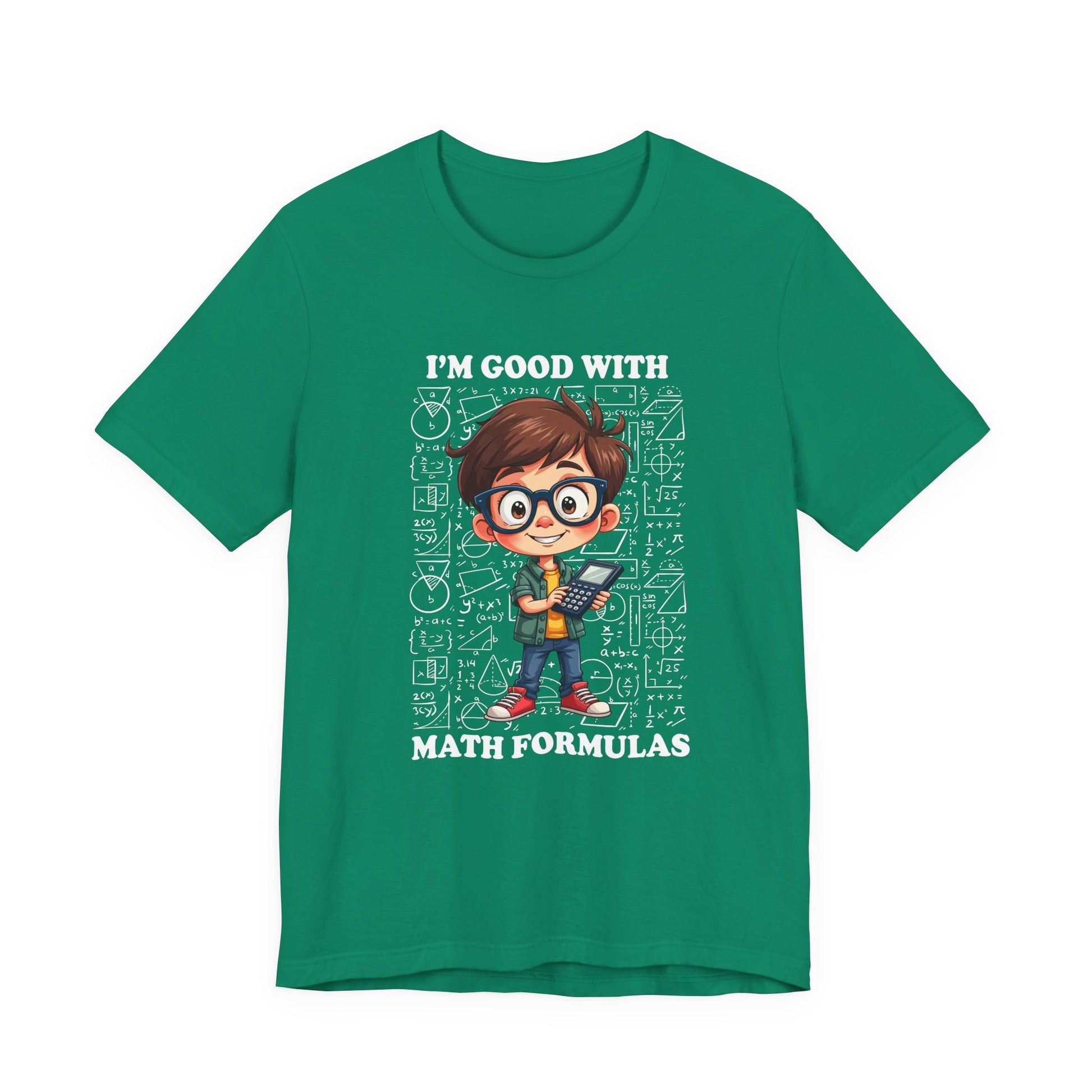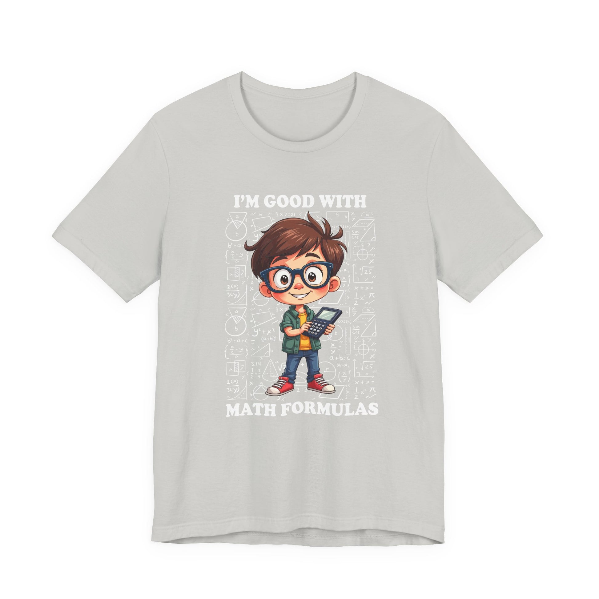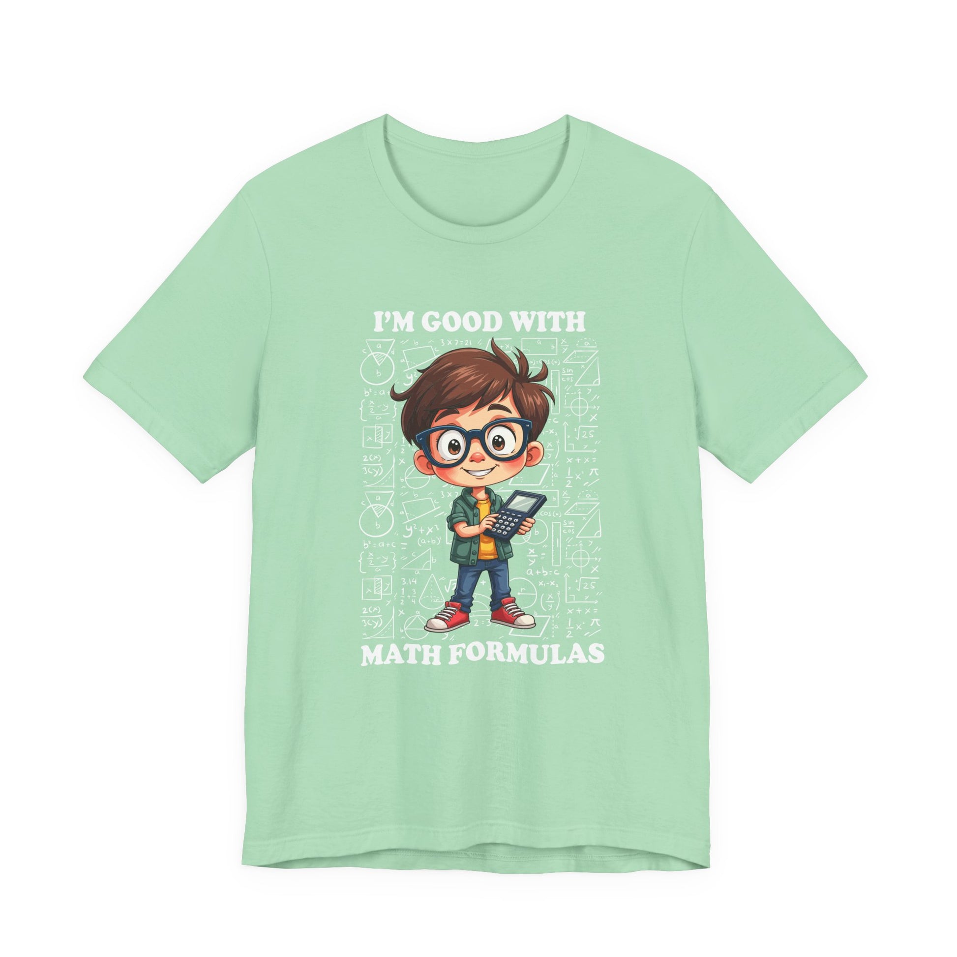 I'm Good with Math Formulas Tshirt – Happy Boy with Calculator and Math Diagrams