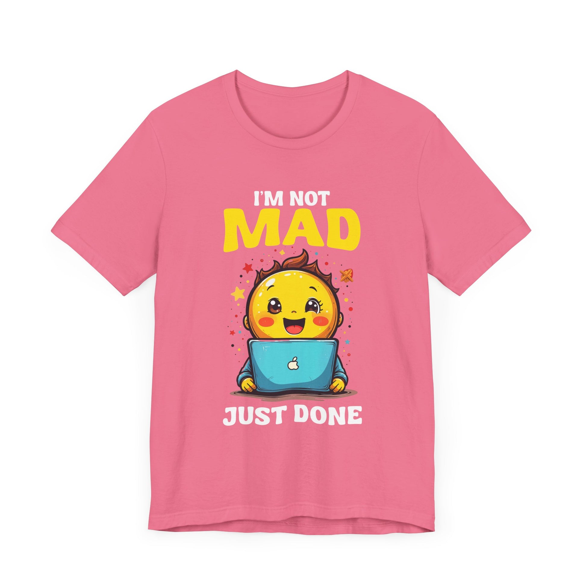 Capture the perfect blend of humor and emotional complexity with this "I'm NOT MAD Just Done" t-shirt. Featuring a cute yet expressive graphic of a happy baby sitting in front of a laptop, showing mixed emotions, this design speaks to those moments when you're over it but still keeping your cool. Made from soft, comfortable fabric, this tee is ideal for casual wear and makes a relatable statement for anyone navigating frustration with a lighthearted twist. Perfect for gifting or adding a touch of personality to your wardrobe, it’s a fun way to express “done but not angry” vibes with charm and wit.