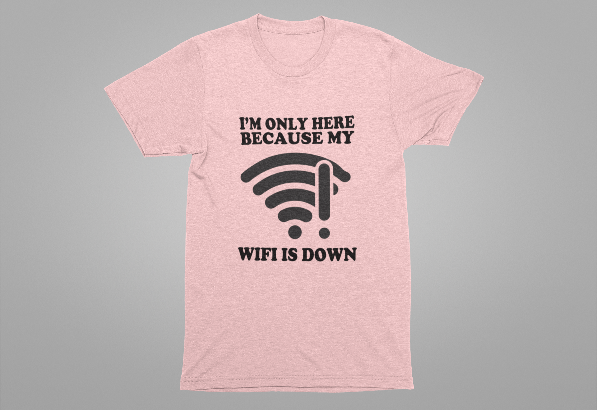 Show off your tech humor with this witty t-shirt featuring the bold text "I'm only here because my WiFi is down" alongside a large, eye-catching WiFi down symbol at the center. Perfect for anyone who can’t live without internet or loves to joke about the modern-day struggle of connectivity issues. This shirt combines a playful message with a clean, minimalist design, making it a great conversation starter and ideal casual wear for tech enthusiasts, students, or remote workers. Made from soft, high-quality fabric for all-day comfort.