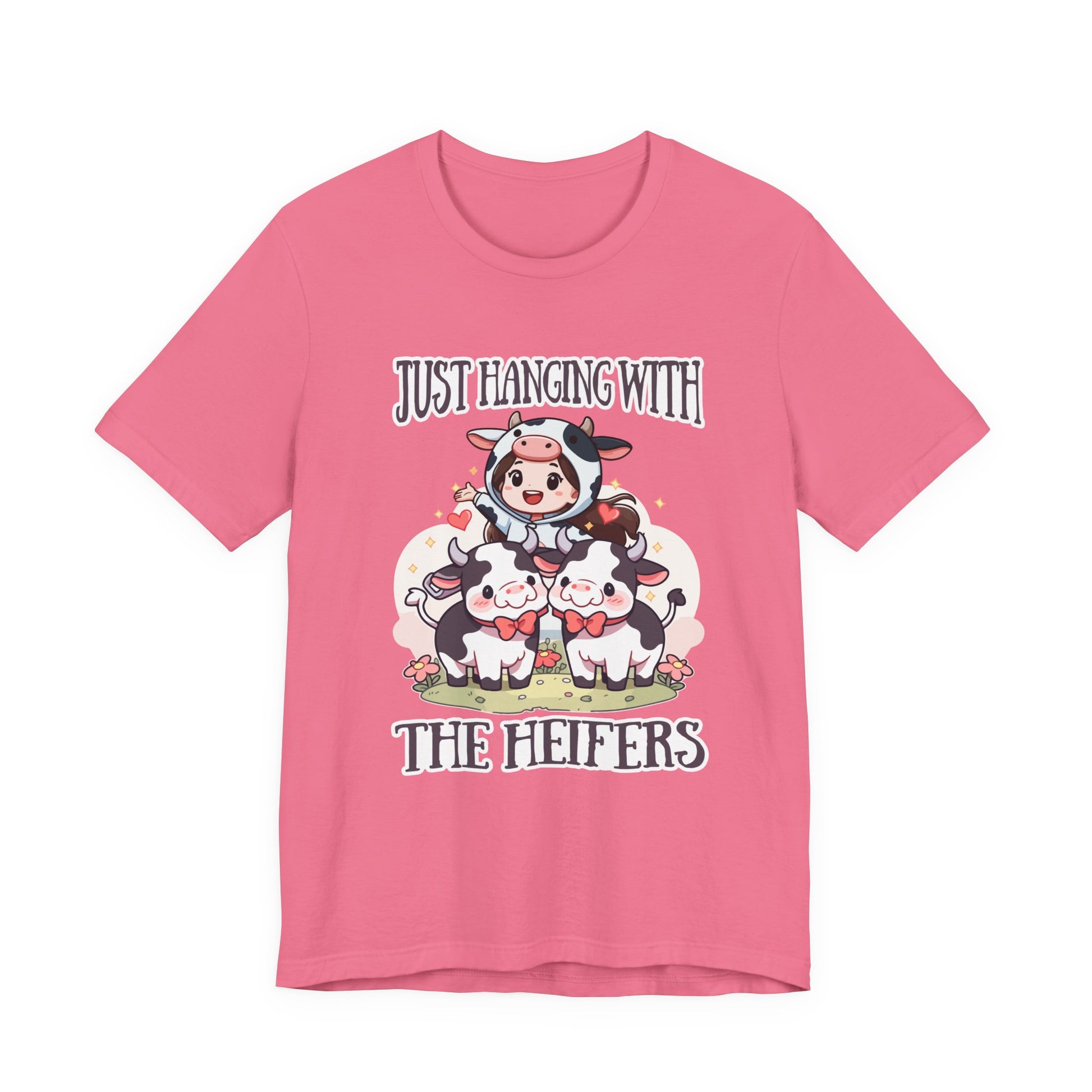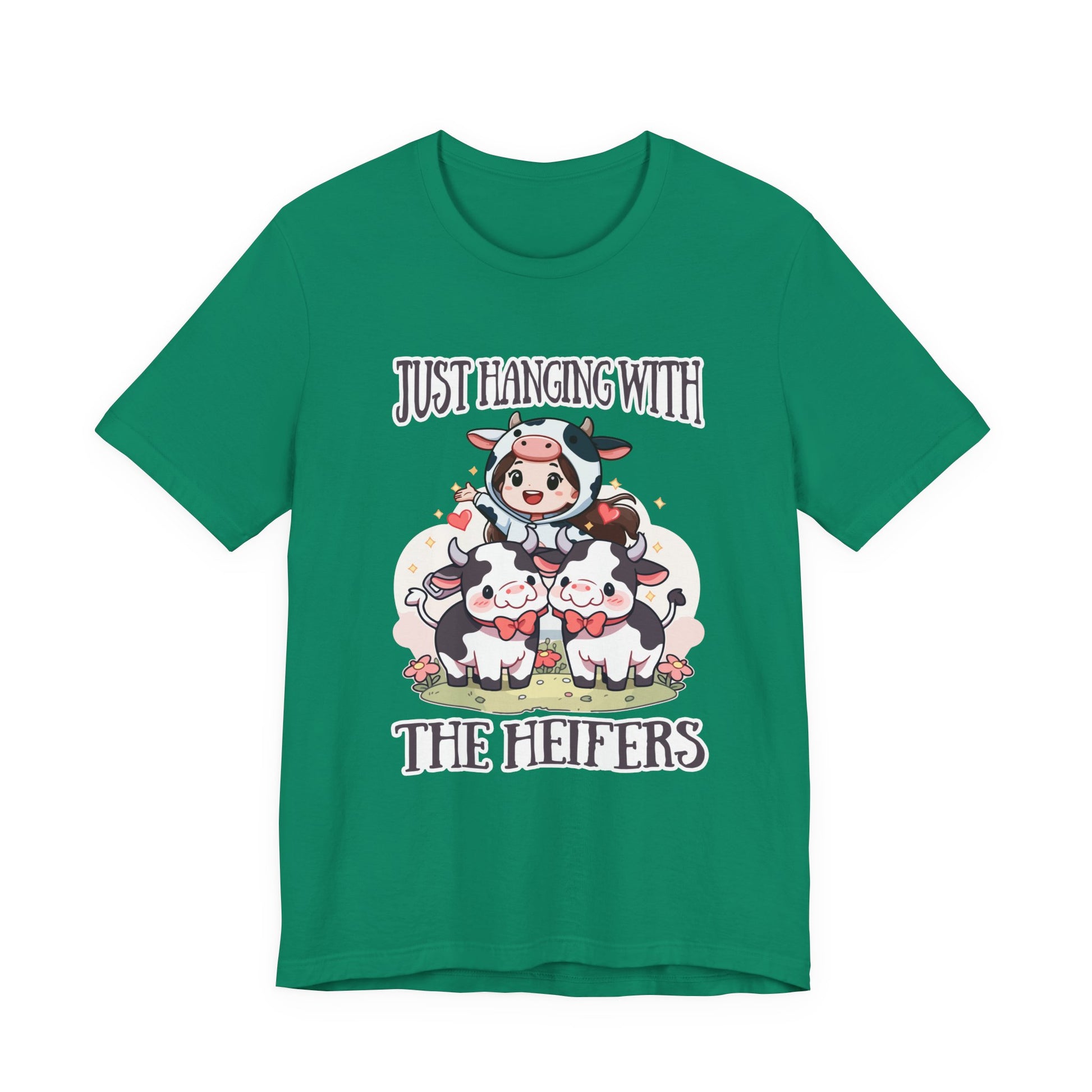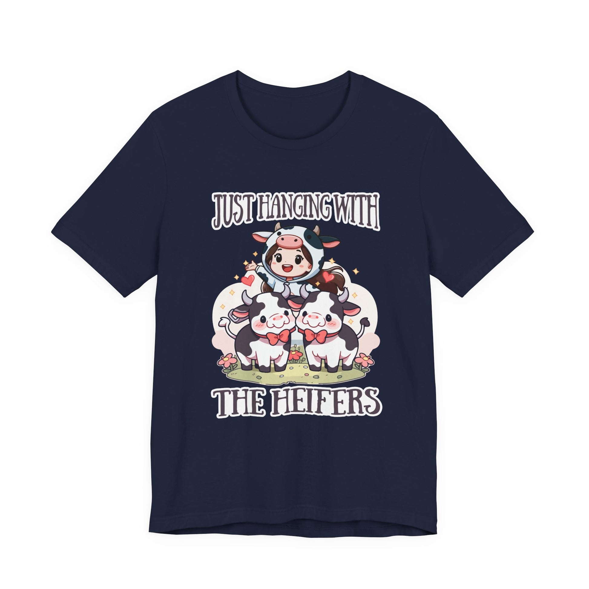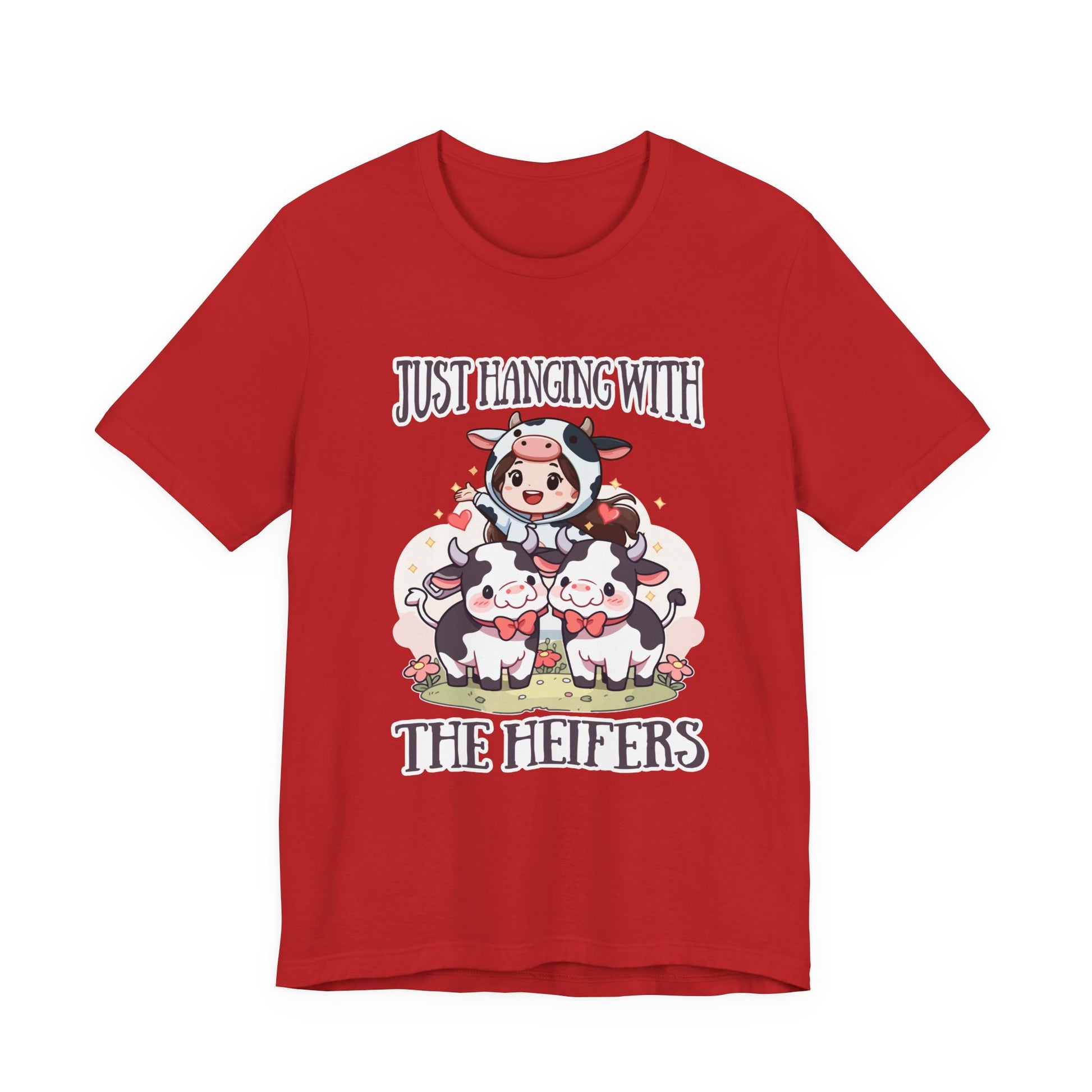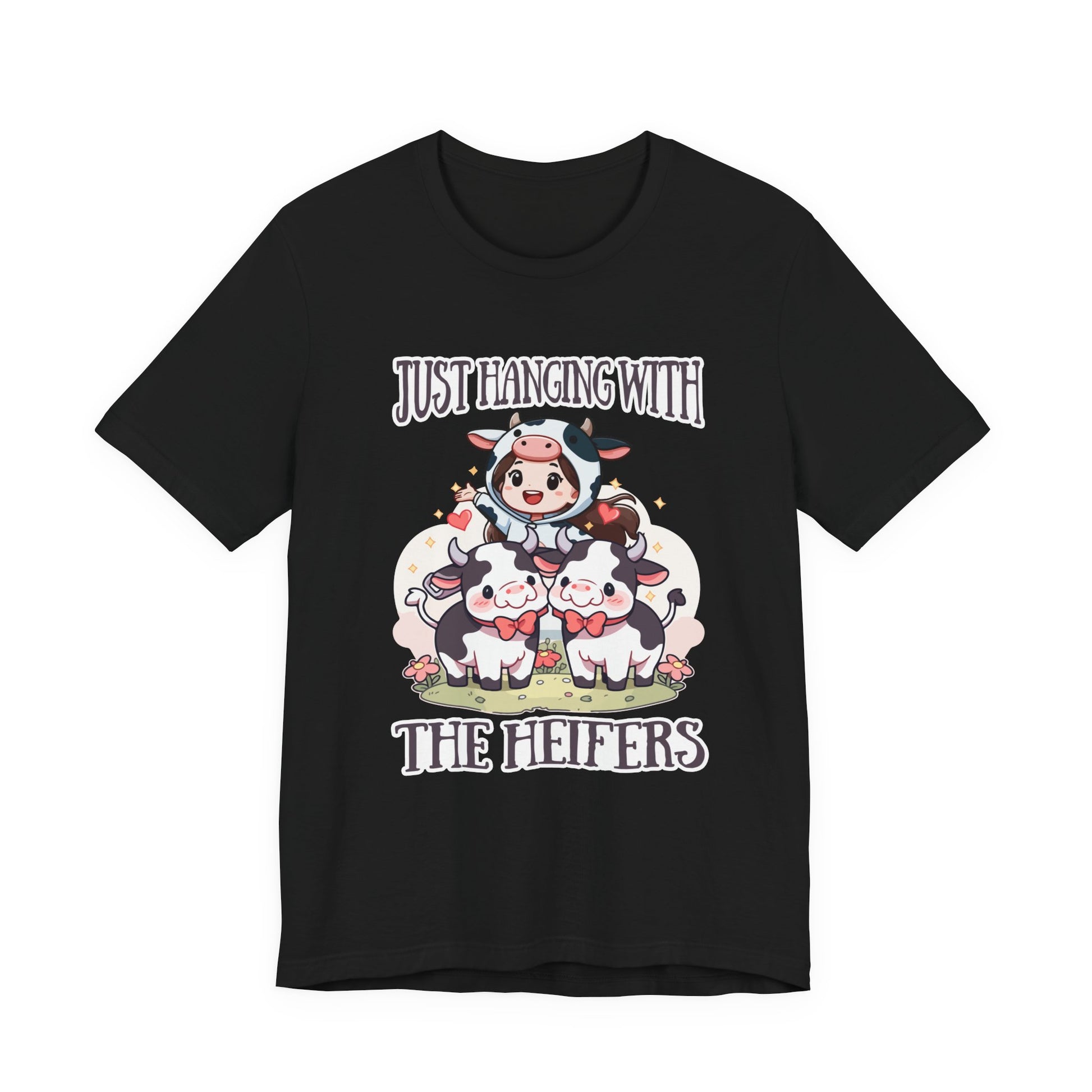 Celebrate farm life and playful humor with this unique t shirt featuring an adorable kid dressed as a cow, happily hanging out with two real cows hugging in a cheerful farm setting. The background includes small farm elements to set the rural scene, while the fun text "Just hanging with the heifers" adds charm and personality. Perfect for animal lovers, farm families, and those who enjoy cute, lighthearted designs. Soft and comfortable, this tee is great for everyday wear, gifts, or anyone who loves cows and wholesome country vibes.