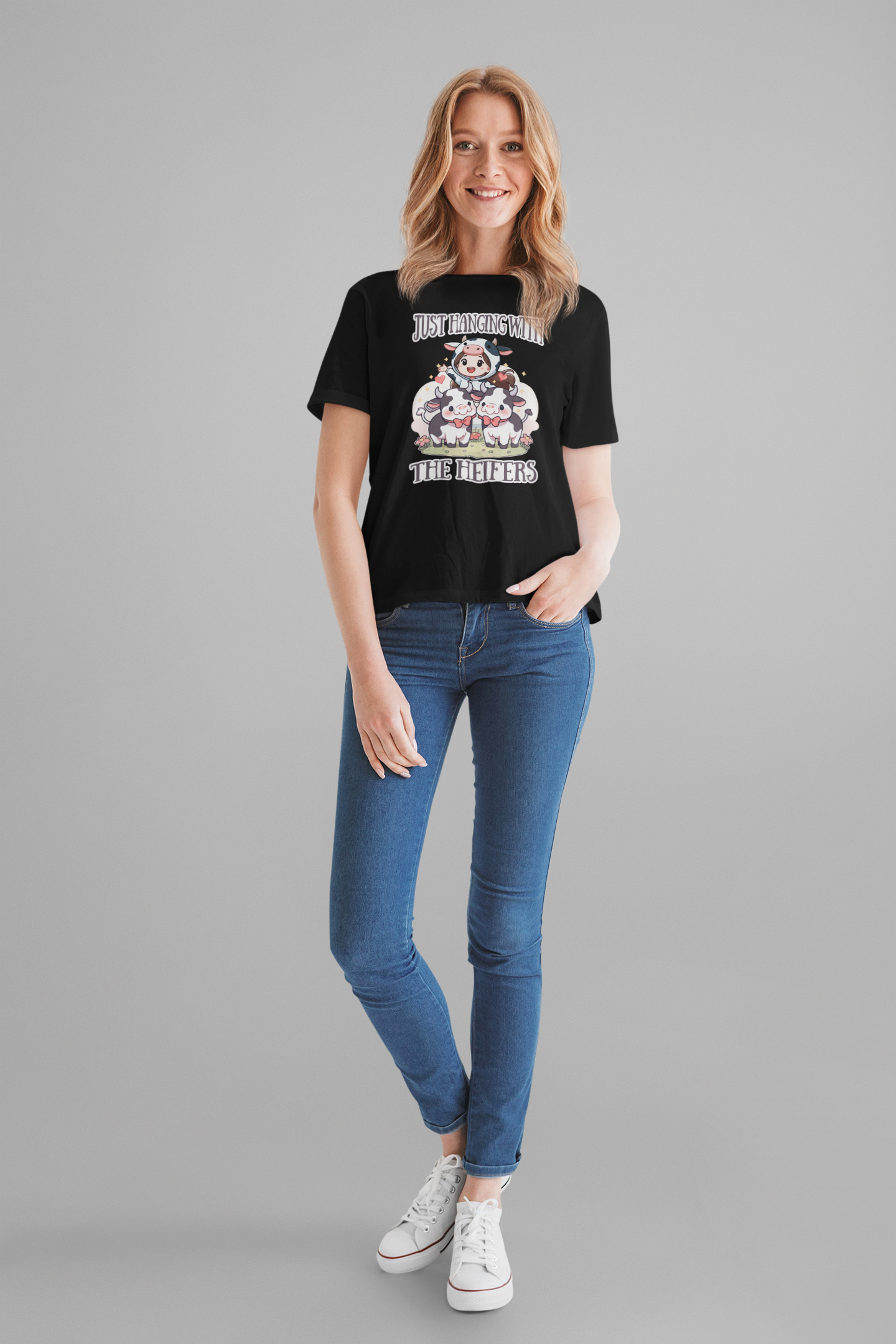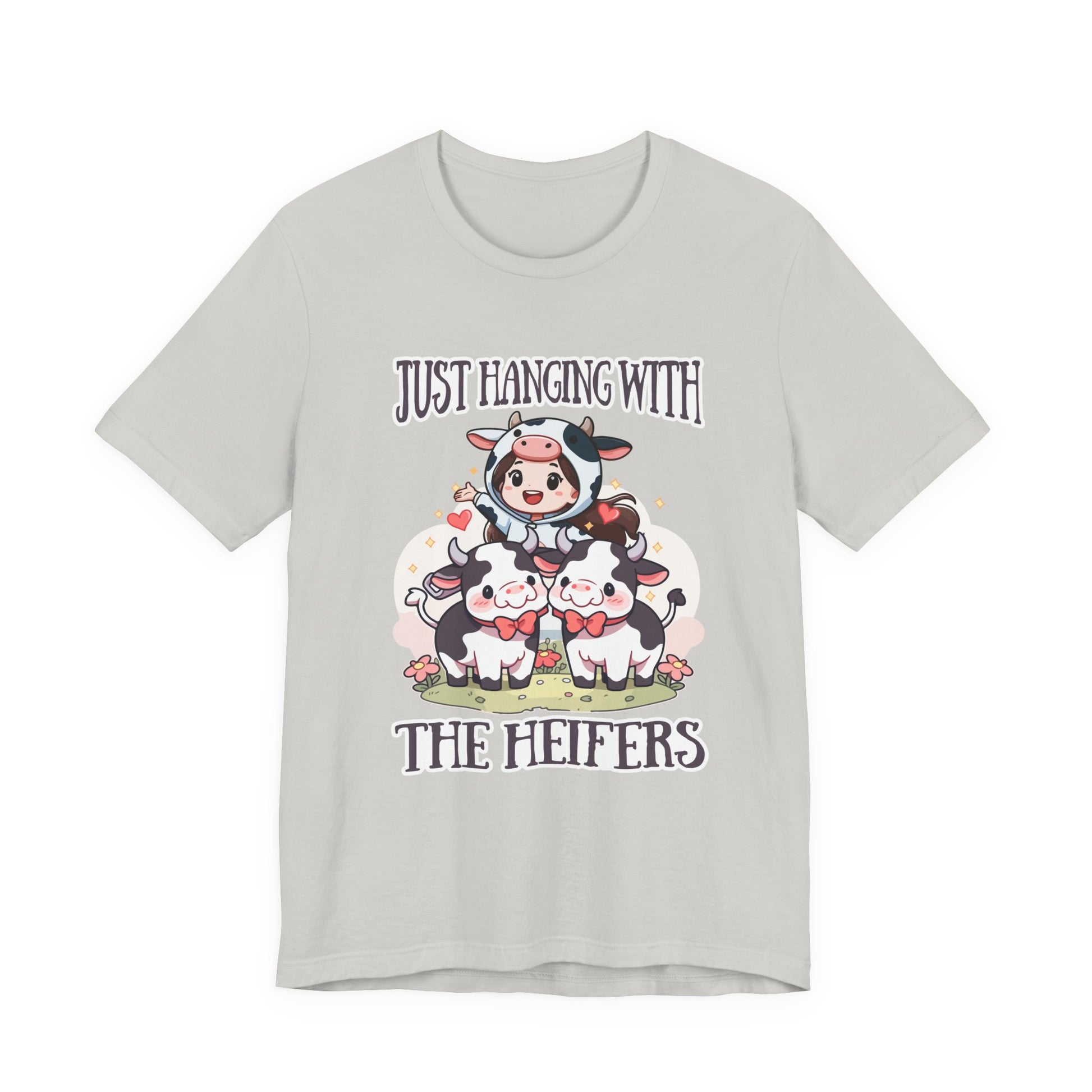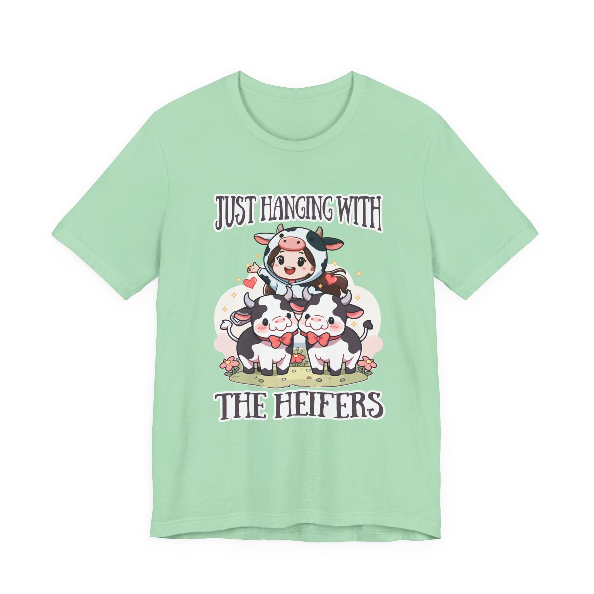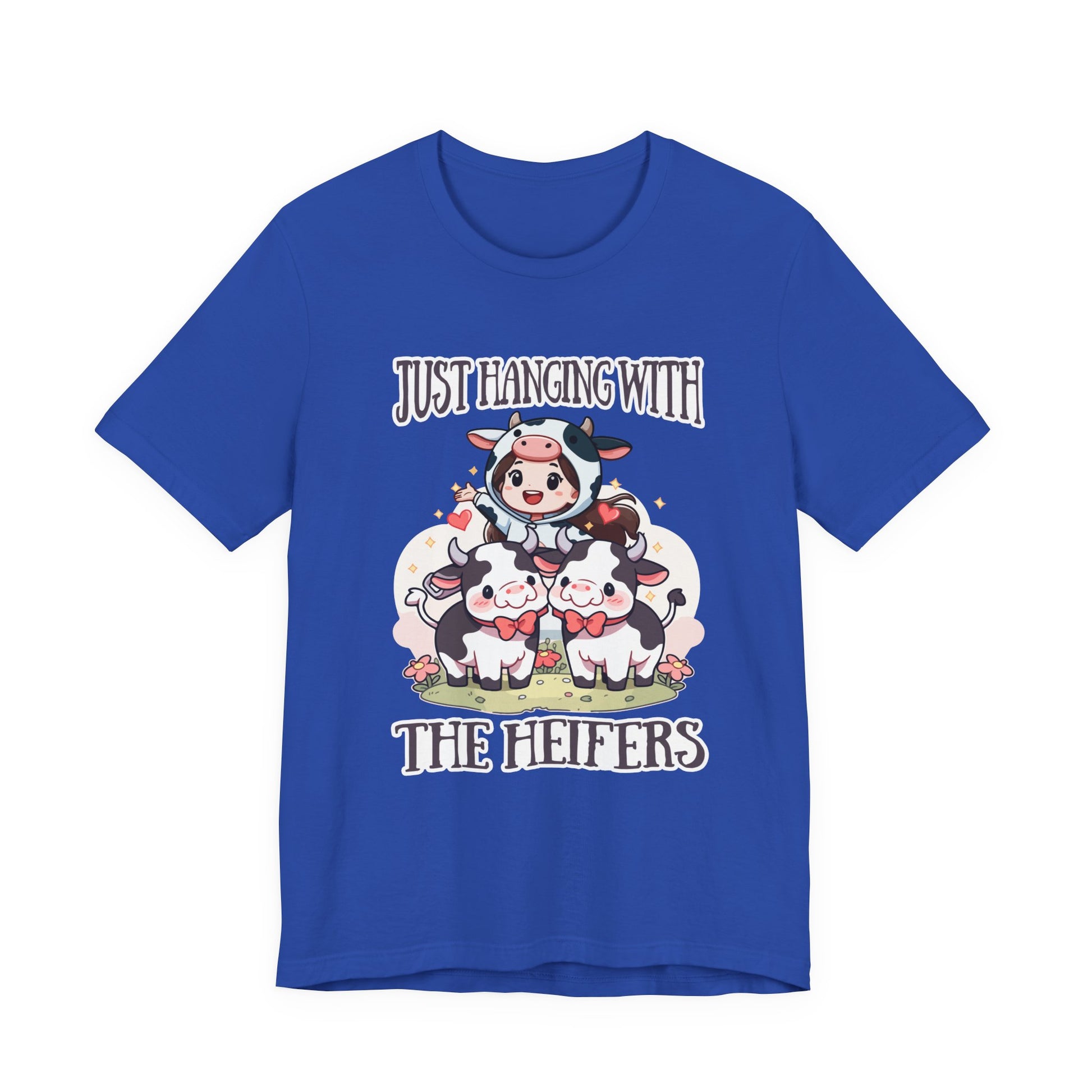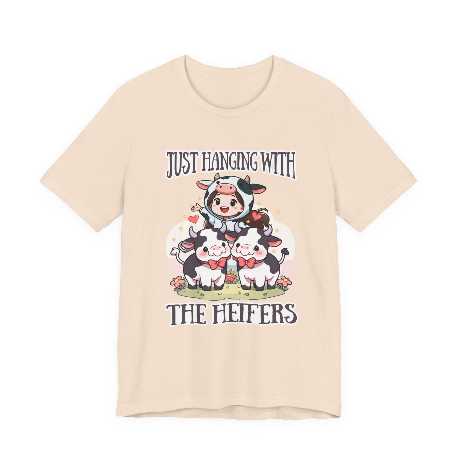 Celebrate farm life and playful humor with this unique t shirt featuring an adorable kid dressed as a cow, happily hanging out with two real cows hugging in a cheerful farm setting. The background includes small farm elements to set the rural scene, while the fun text "Just hanging with the heifers" adds charm and personality. Perfect for animal lovers, farm families, and those who enjoy cute, lighthearted designs. Soft and comfortable, this tee is great for everyday wear, gifts, or anyone who loves cows and wholesome country vibes.