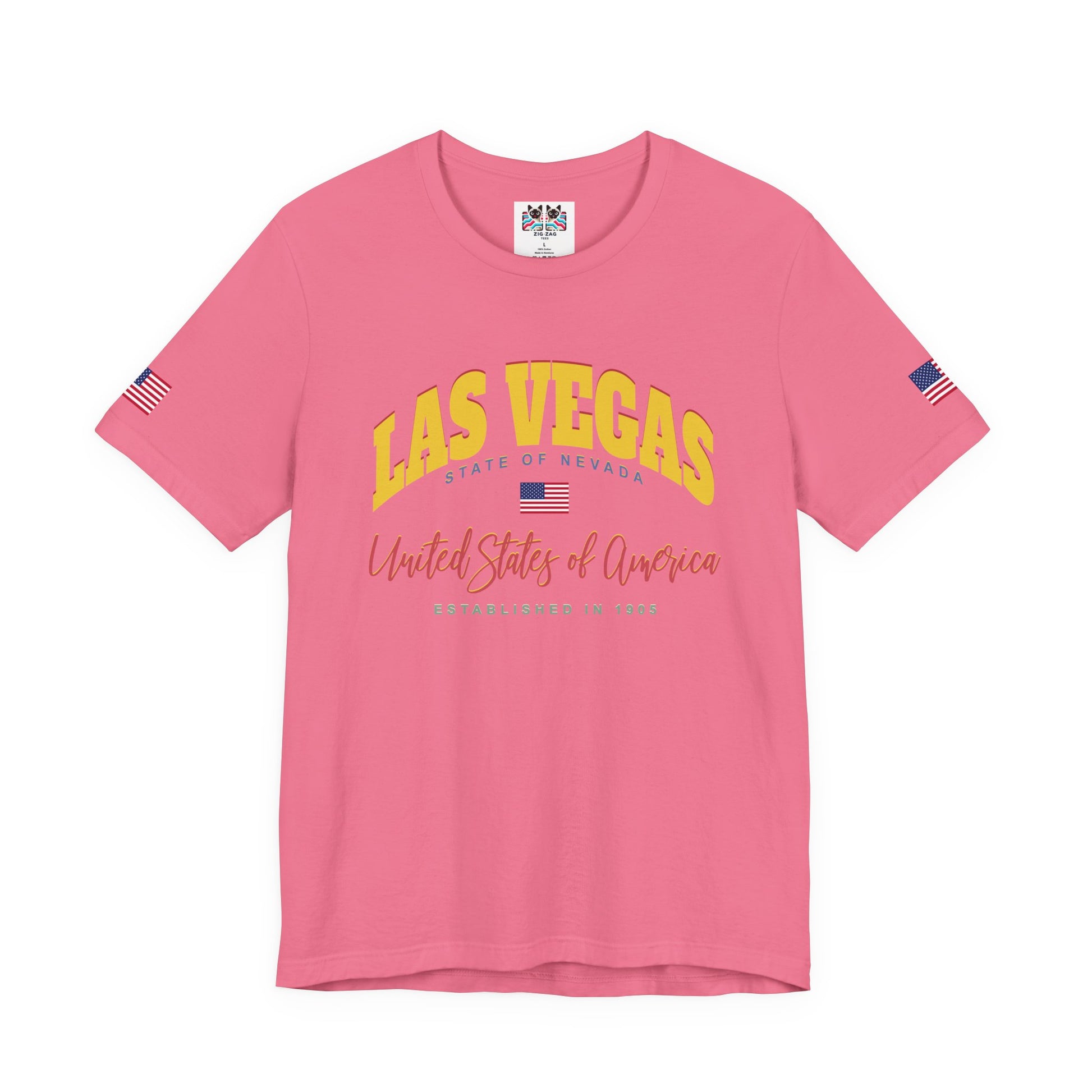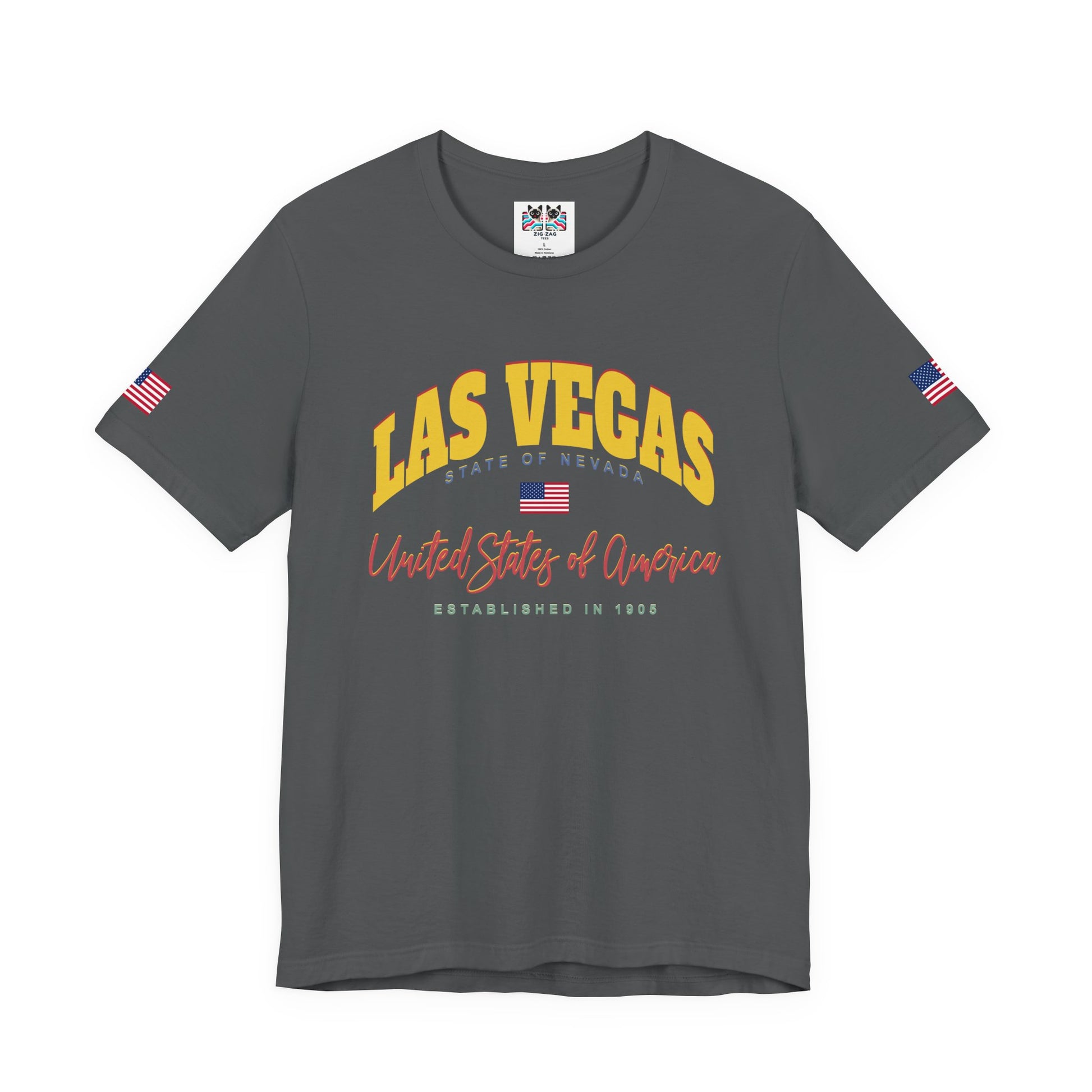 Show Las Vegas pride with this collegiate-style "LAS VEGAS - STATE OF NEVADA" t-shirt in bold yellow and orange lettering! The design features "UNITED STATES OF AMERICA" script, American flag, "ESTABLISHED IN 1905" text, and Nevada's founding year. The varsity-style typography gives this a classic, timeless athletic department feel perfect for representing your city with pride. Las Vegas was established in 1905 and incorporated in 1911, growing from a small railroad town into one of the world's most famous cities. This t-shirt with American flag sleeve patches is perfect for Las Vegas residents, UNLV students and alumni, Nevada state pride, Vegas locals, hometown pride, or anyone who wants a more subdued, classic Las Vegas design without flashy casino imagery. Great for everyday wear, casual Nevada pride, or representing Vegas in a sophisticated, collegiate way.