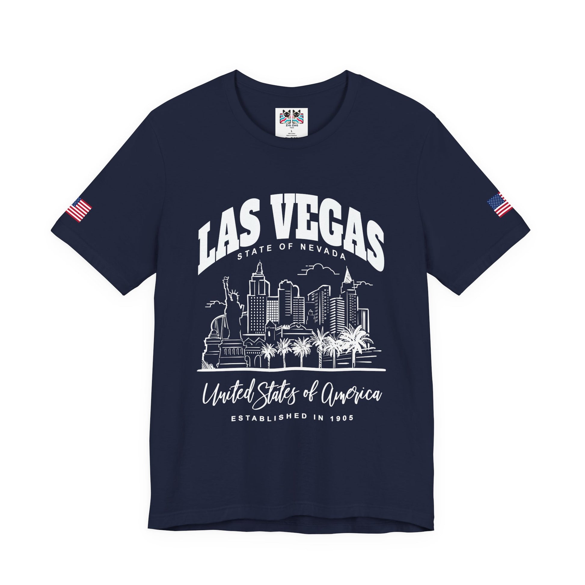 Represent Las Vegas and Nevada with this bold "LAS VEGAS - STATE OF NEVADA" t-shirt featuring stunning white line-art of the iconic Vegas skyline! The design showcases casino resort buildings, the Statue of Liberty replica (New York-New York Hotel), palm trees, and desert landscape with "United States of America - ESTABLISHED IN 1905" text in elegant script. Las Vegas was officially founded on May 15, 1905, when 110 acres of land were auctioned off to create what would become downtown Las Vegas. The city's name means "The Meadows" in Spanish, referring to the natural springs in the area. From a small railroad town in the Mojave Desert, Las Vegas has grown into the Entertainment Capital of the World, known worldwide for its mega-casino resorts, vibrant nightlife, and 24/7 excitement. The detailed white illustration on rich red fabric creates striking contrast perfect for Nevada state pride. This t-shirt with American flag sleeve patches is perfect for Las Vegas residents, Nevada natives, Vegas Strip workers, casino employees, hospitality industry professionals, desert lovers, or tourists who fell in love with Sin City. Great for showing hometown pride, commemorating the city that truly never sleeps, or celebrating Nevada's most famous destination. Ideal for locals who call Vegas home and visitors who understand why over 40 million people visit this remarkable city every year.