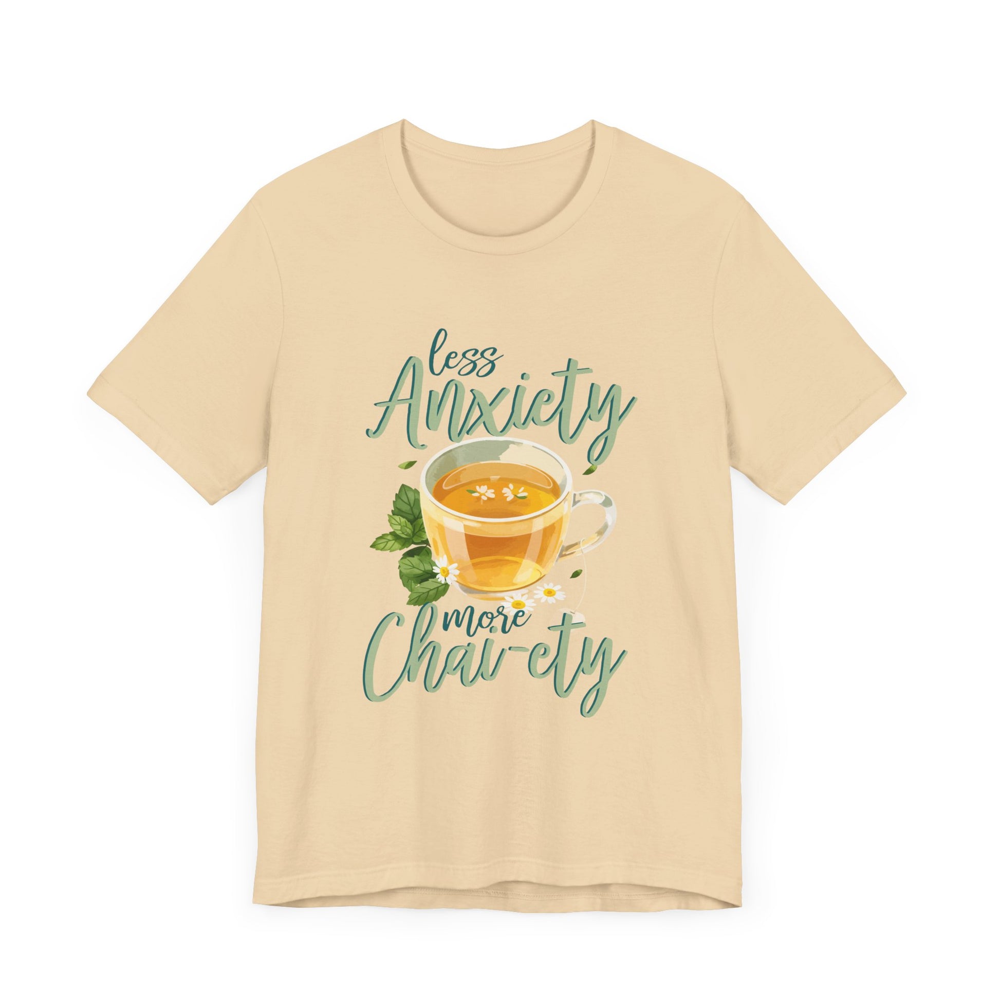 Sip your worries away in style with this "Less Anxiety, More Chai-ety" t-shirt! Featuring a large, inviting tea cup in the center, this design perfectly blends humor and comfort for tea lovers everywhere. It’s a cozy reminder to swap stress for soothing sips and take life one cup at a time. Made from soft, comfortable fabric, this tee is ideal for casual outings, tea breaks, or as a thoughtful gift for anyone who finds calm in a cup of chai.