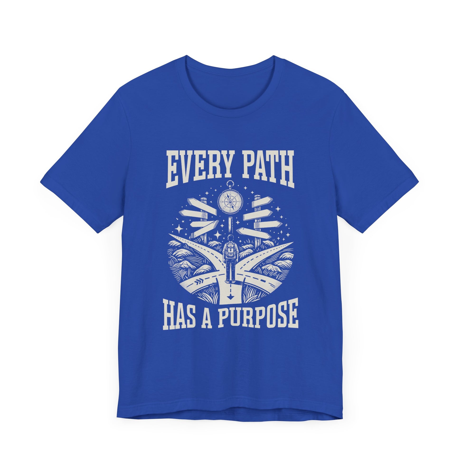 Inspire purposeful journeys with this "Every path has a purpose" t-shirt, featuring a graphic of a boy with a backpack walking at a crossroads where four roads intersect and branch out in different directions. A watch in the background symbolizes time and the significance of each decision along the journey. This design captures the spirit of exploration, choice, and meaning in every step, making it perfect for adventurers, students, and anyone embracing life’s possibilities. Crafted from soft, comfortable fabric, it’s ideal for everyday wear and thoughtful gifting.