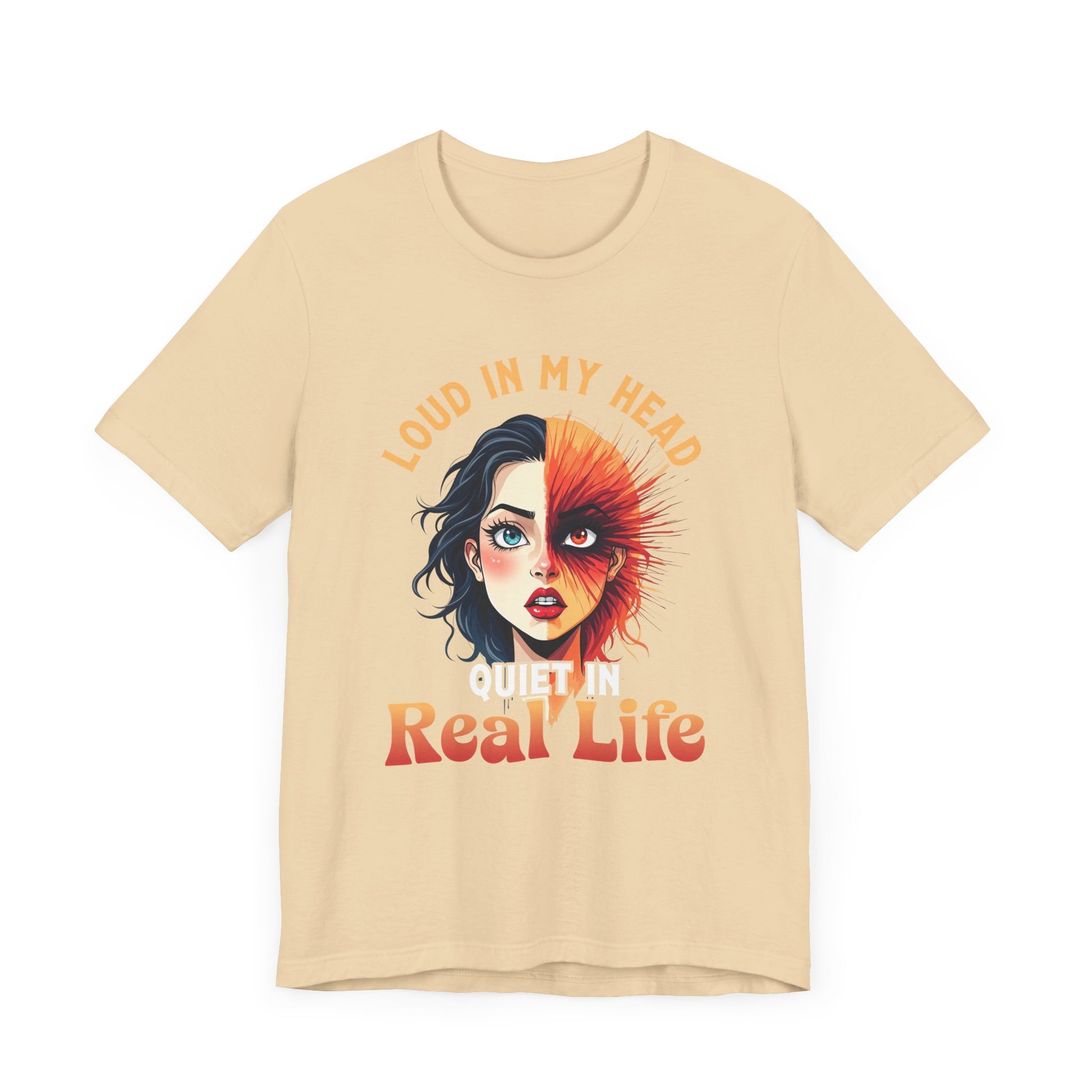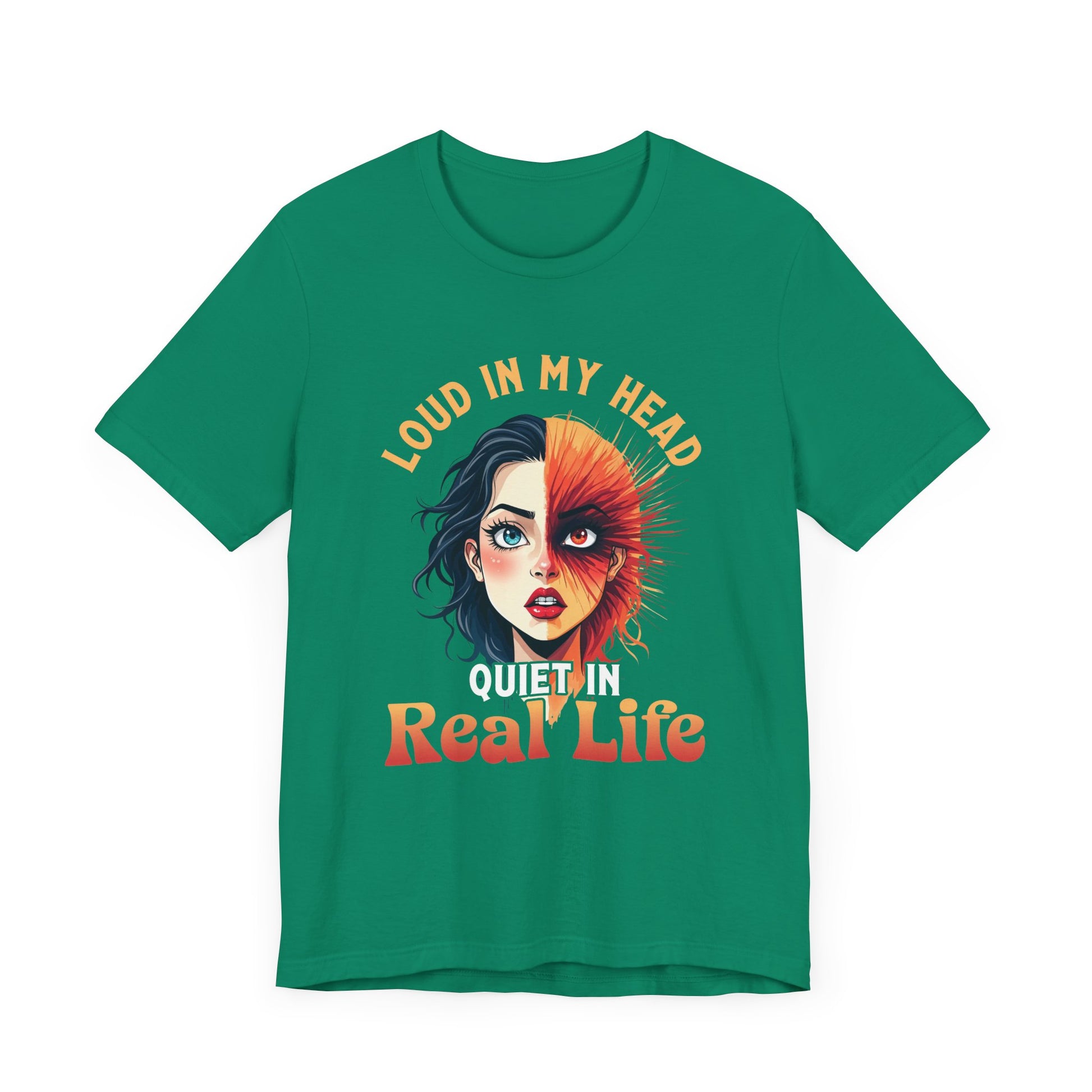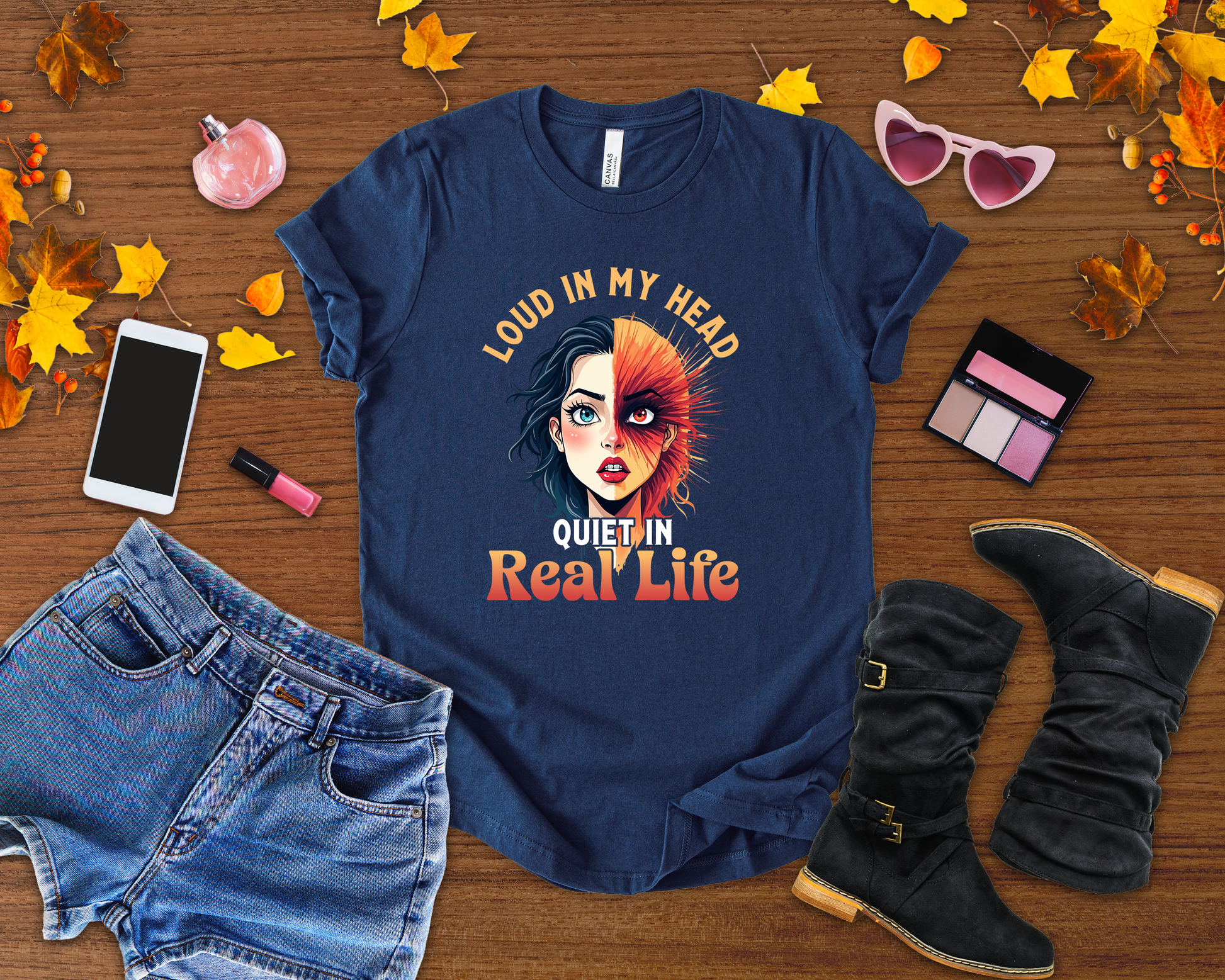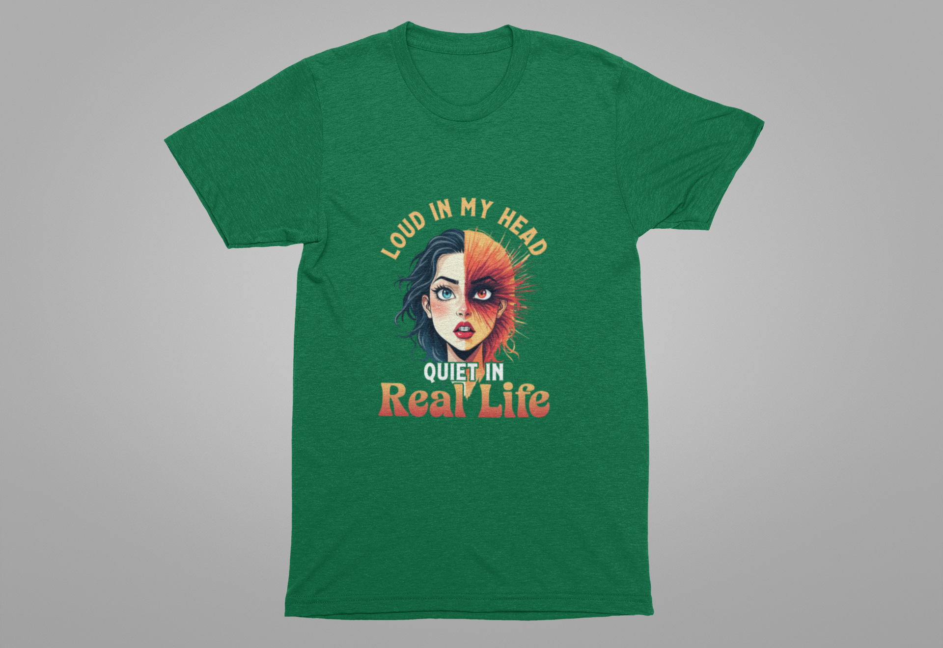 Express the contrast between inner chaos and outward calm with this thought-provoking "Loud in My Head, Quiet in Real Life" t-shirt. The graphic features a puzzled girl’s face split into two halves—one side appearing normal, while the other takes on a mutant-like form, symbolizing the complex emotions and thoughts often hidden beneath a quiet exterior. Perfect for those who relate to the struggle of managing inner noise while maintaining composure. Made from soft, high-quality fabric, this tee combines striking art with meaningful messaging for everyday wear.