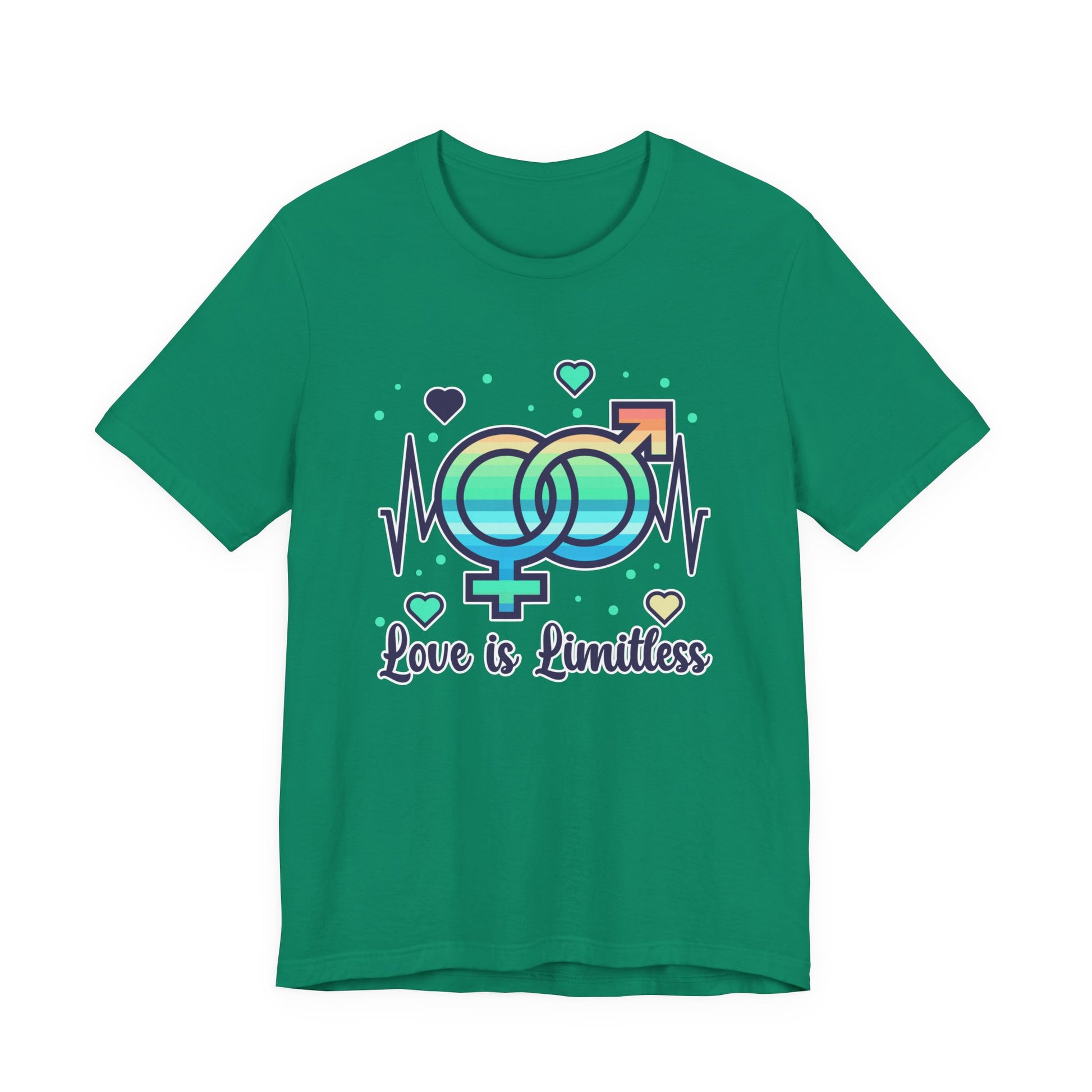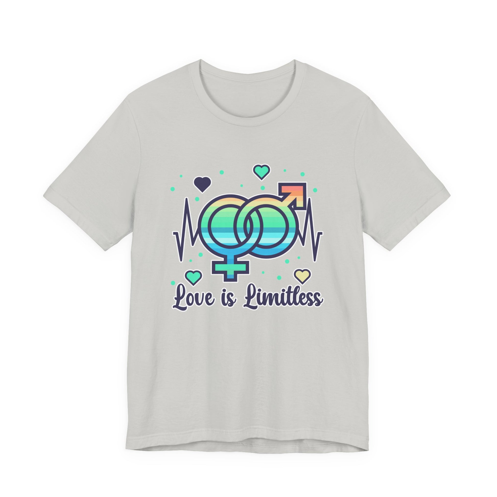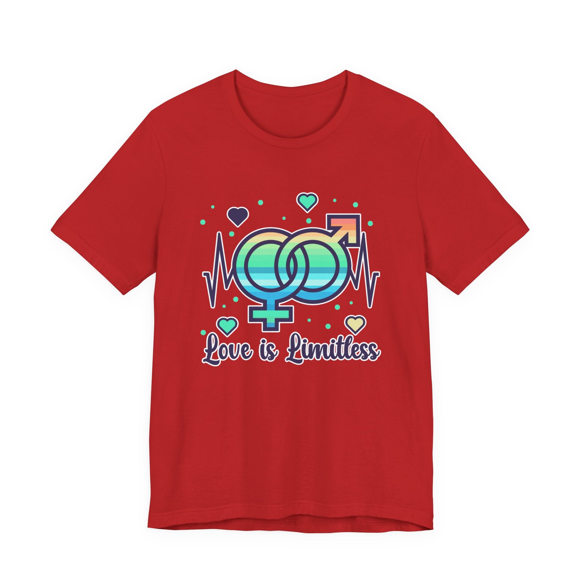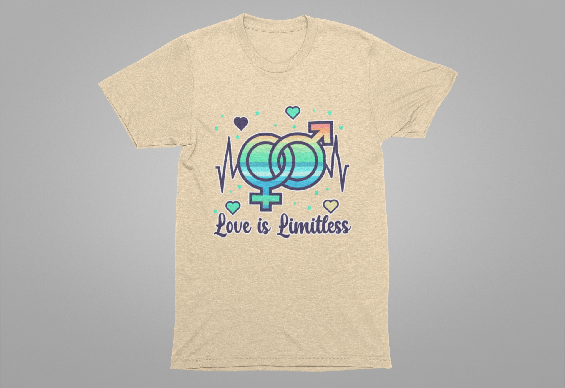Express the boundless power of love with this "Love Is Limitless" t-shirt, featuring a large medical symbol of male and female interconnected at the center, surrounded by heart emotions. This vibrant design visually declares that love has no gender and transcends all boundaries, celebrating inclusivity and acceptance. Crafted from soft, comfortable fabric, this tee is perfect for anyone who believes in equality, LGBTQ+ pride, and the universal nature of love. Wear it proudly to spread the message that love truly knows no limits.