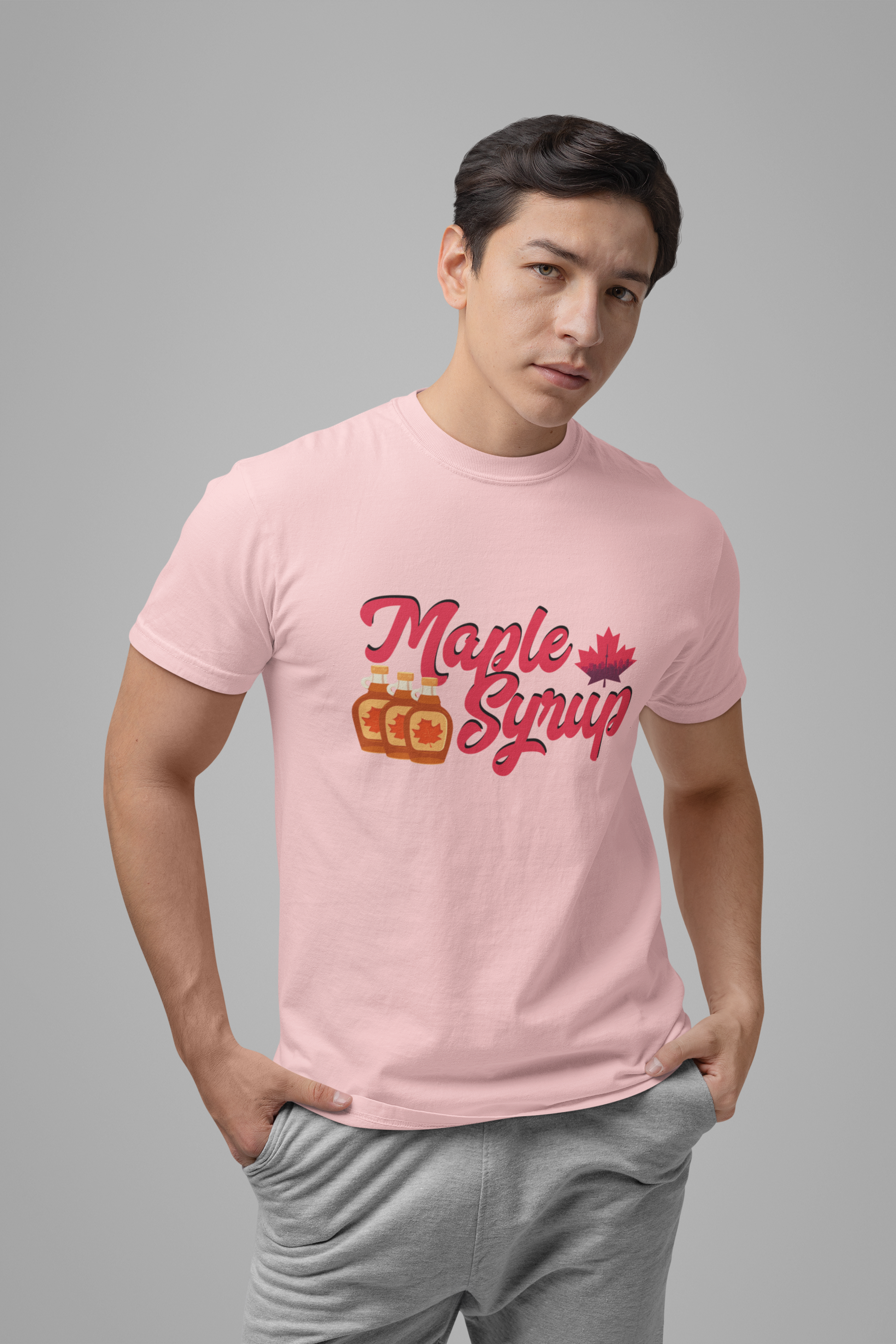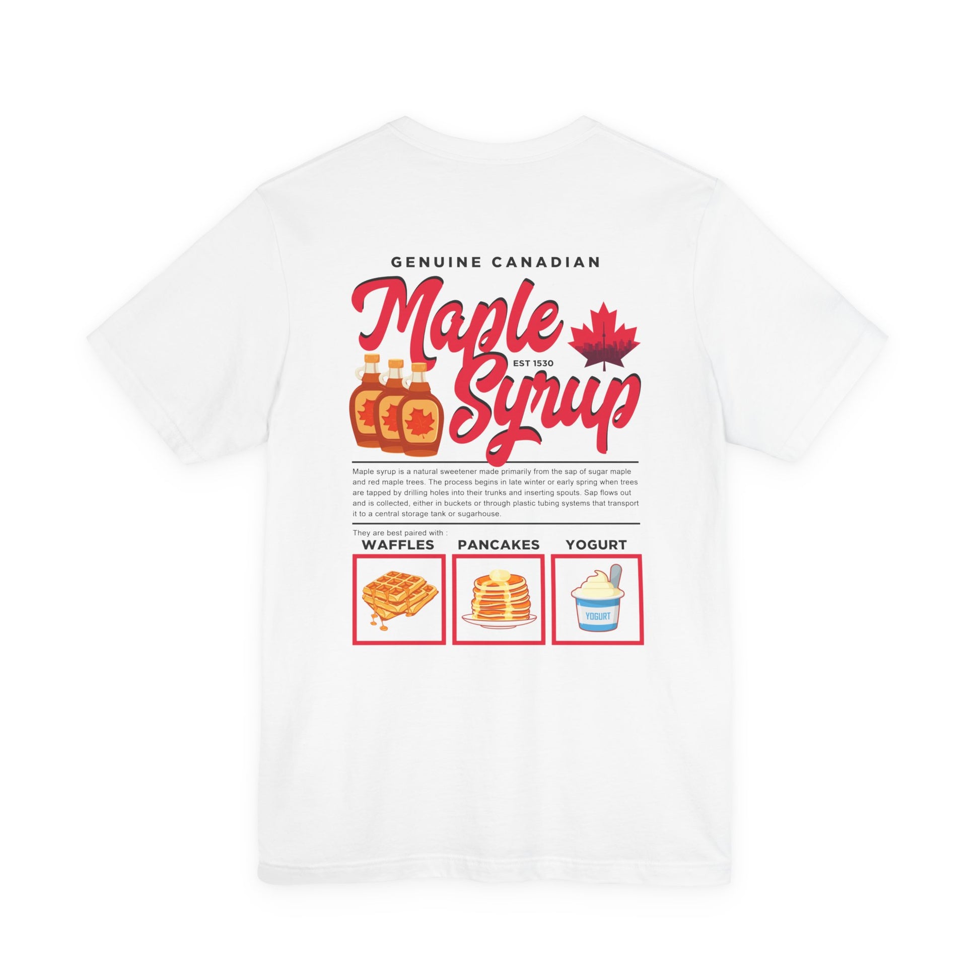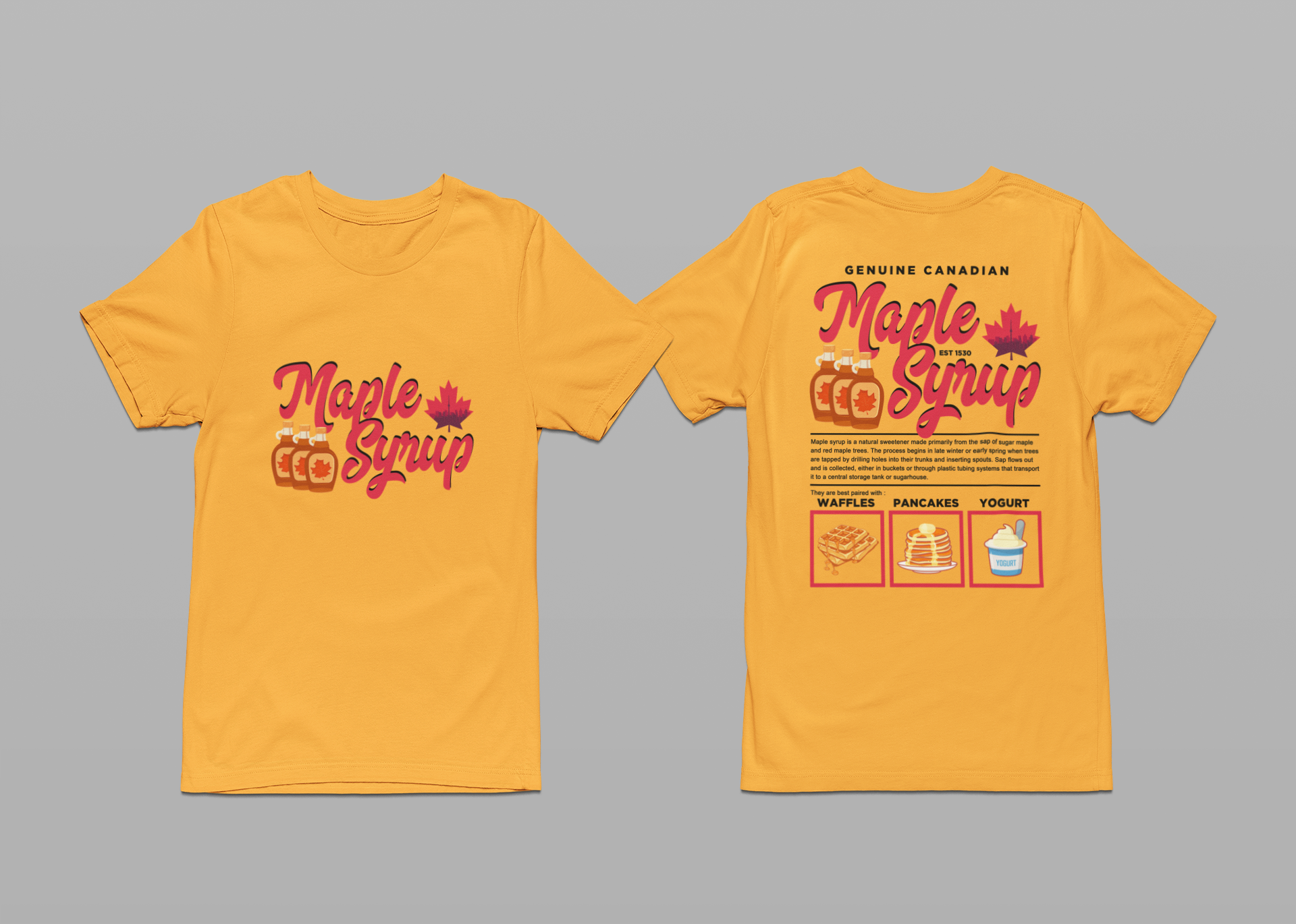 This sweet and cozy tshirt features a classic maple syrup bottle at the center, surrounded by simple graphics of waffles, pancakes, and a bowl of yogurt to show where this “liquid gold” is poured the most. Larger text “Maple Syrup” with a maple leaf beside it crowns the design, while a short content line describes maple syrup as a naturally sweet, slow-poured topping made from maple tree sap, perfect for breakfast lovers and proud maple fans.