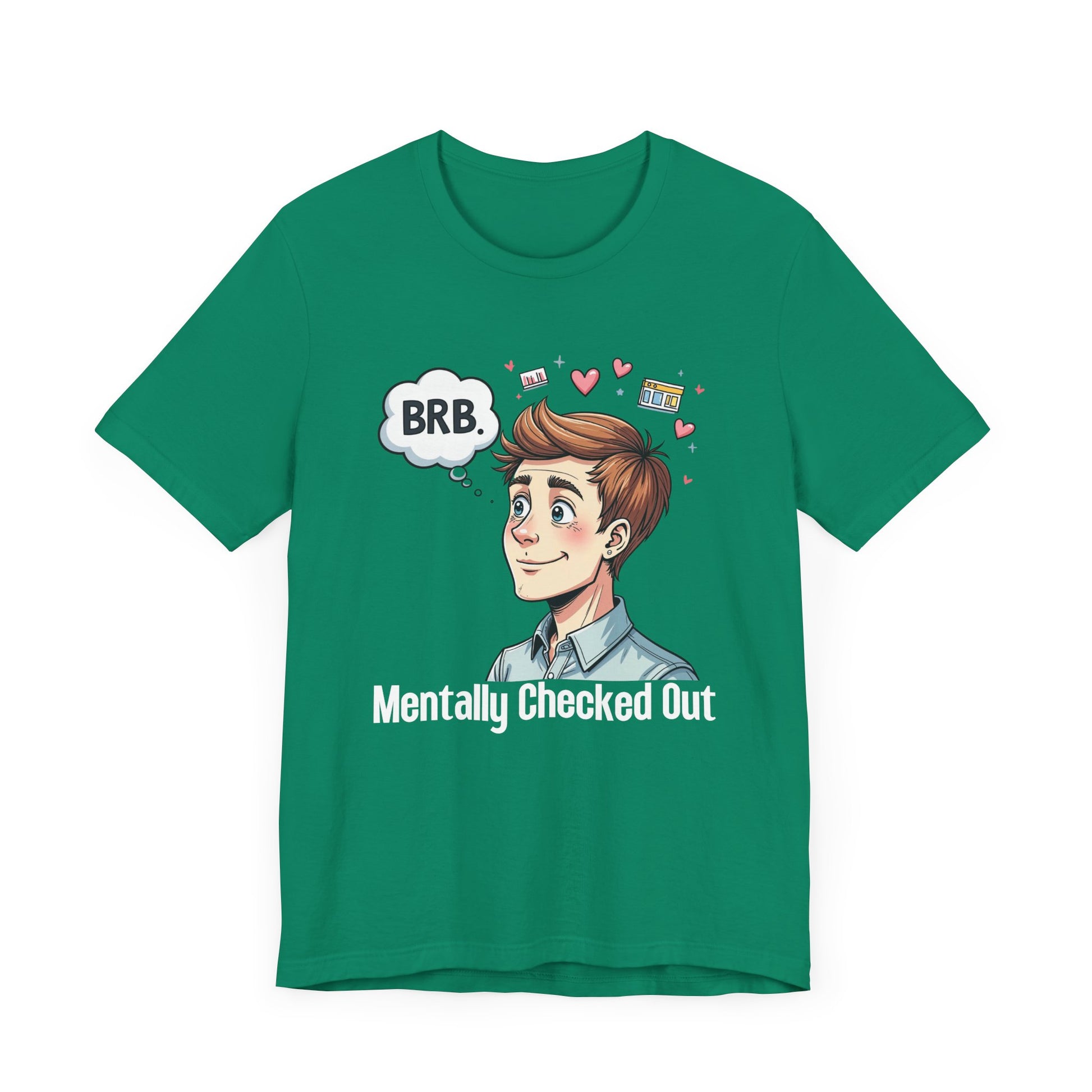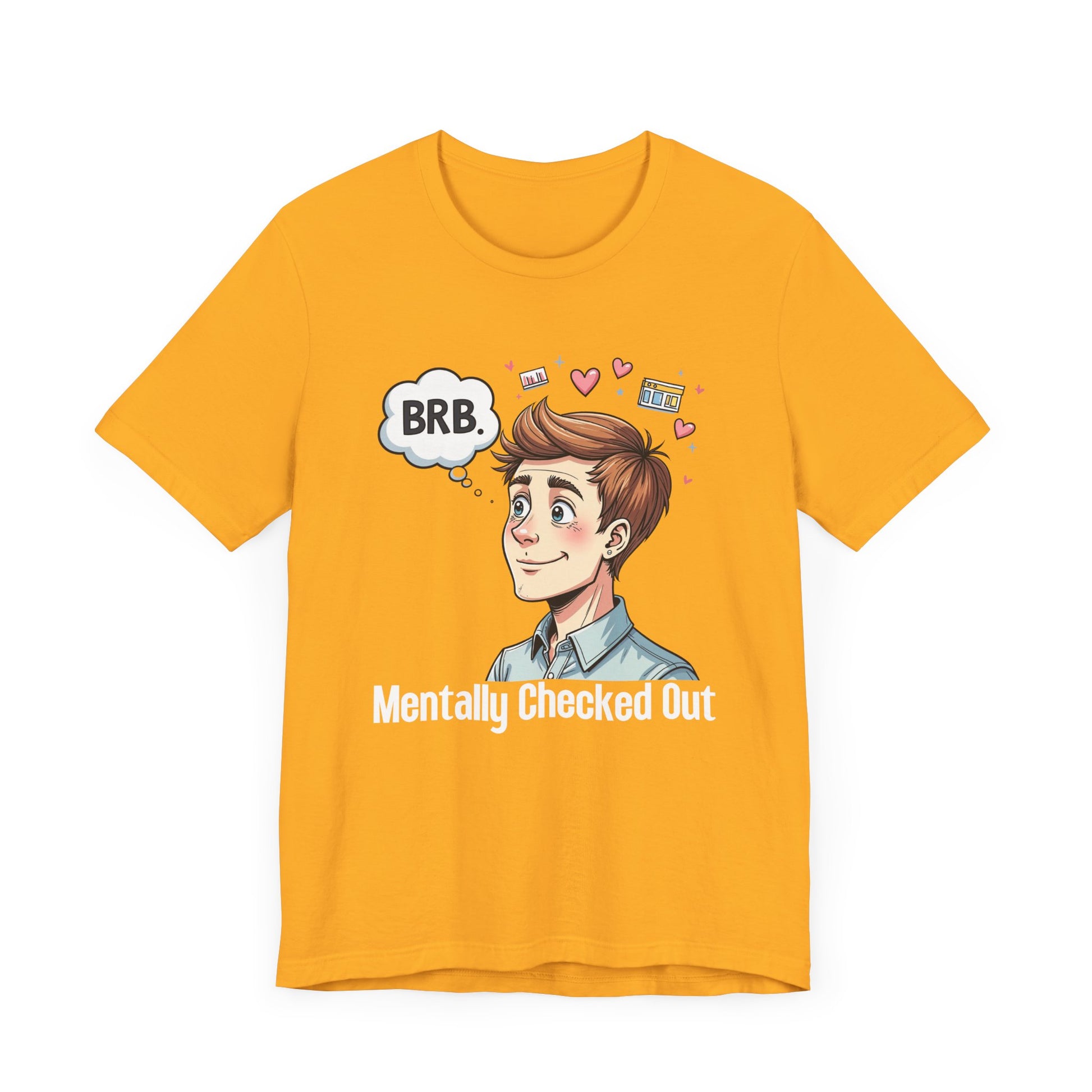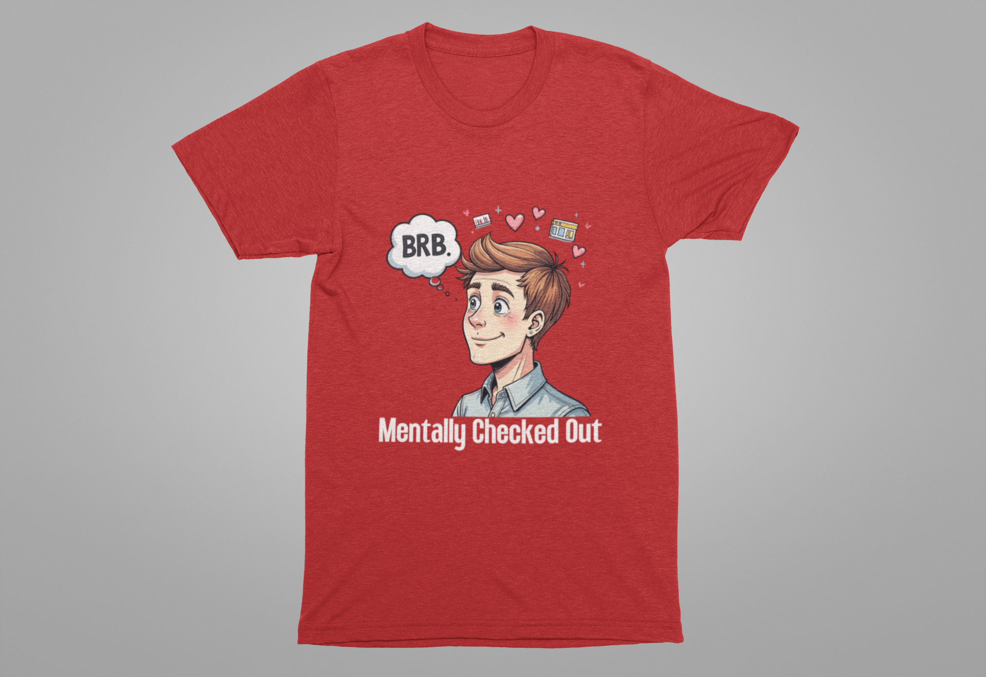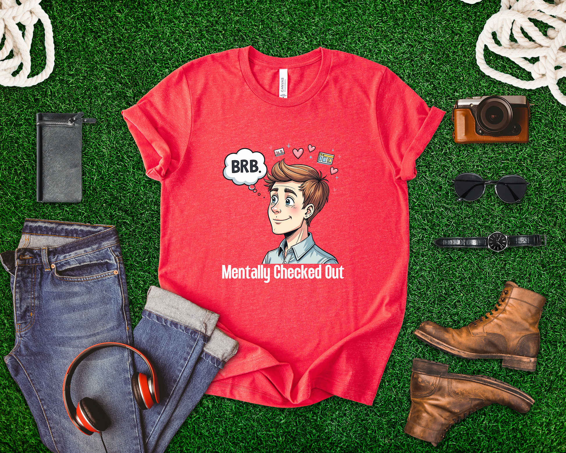 Express the feeling of mental exhaustion and the need for a break with this relatable t-shirt featuring the text "BRB" emerging from a man's head as if he is thinking, paired with "Mentally checked out" written at the bottom. The graphic shows a lost-looking man surrounded by small heart-shaped emotions floating around his head, capturing the vulnerability and complexity of mental health. This design is perfect for raising awareness, starting conversations, or simply sharing a moment of honest self-expression. Made from soft, high-quality fabric for comfortable everyday wear.
