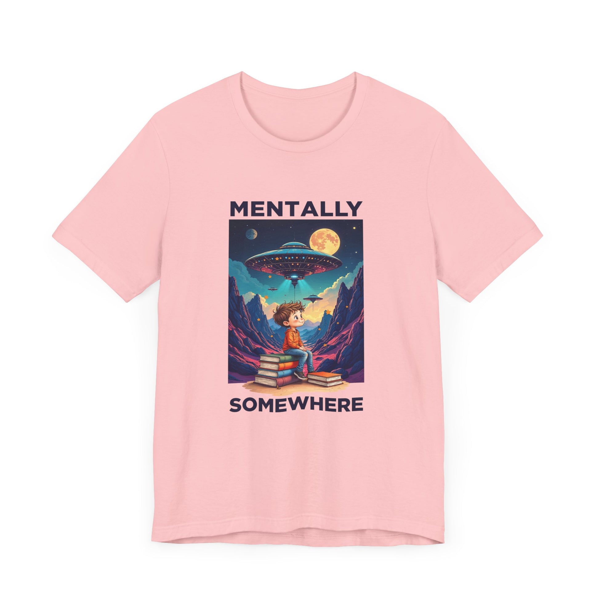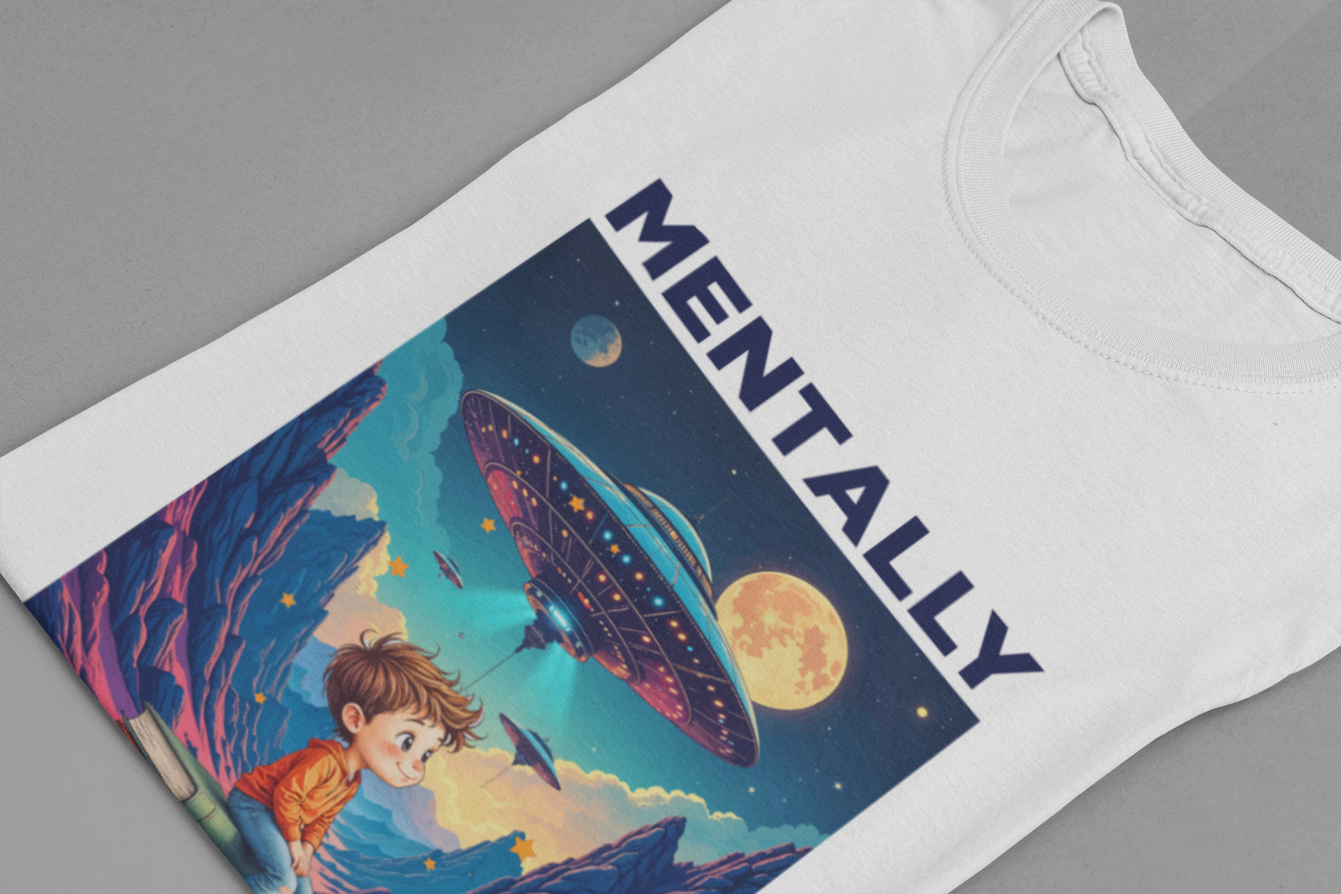 Escape the ordinary with this "Mentally Somewhere Else" t-shirt, featuring a thoughtful boy sitting on a bundle of books surrounded by majestic mountains under a full moon sky. In the distance, a large spaceship, smaller ships, and a visible planet create a dreamy, otherworldly horizon that perfectly captures the feeling of being physically present but mentally lost in imagination or faraway thoughts. This design resonates with anyone who often finds their mind wandering beyond the here and now—whether in daydreams, curiosity, or introspection. Made from soft, comfortable fabric, this tee is ideal for dreamers, thinkers, and explorers of the mind.