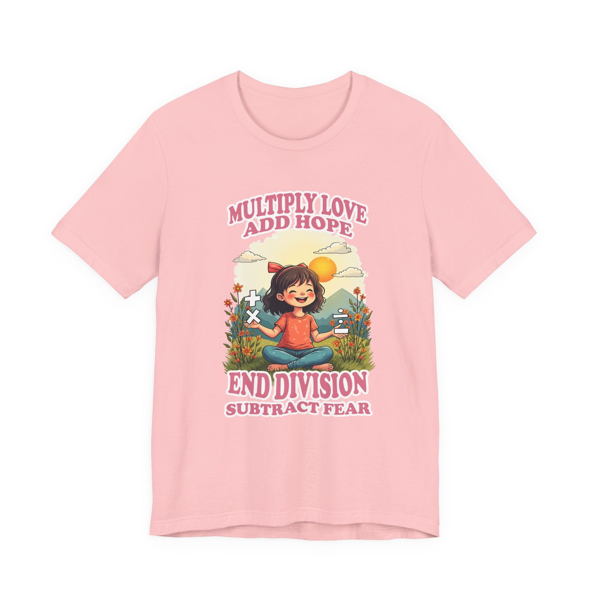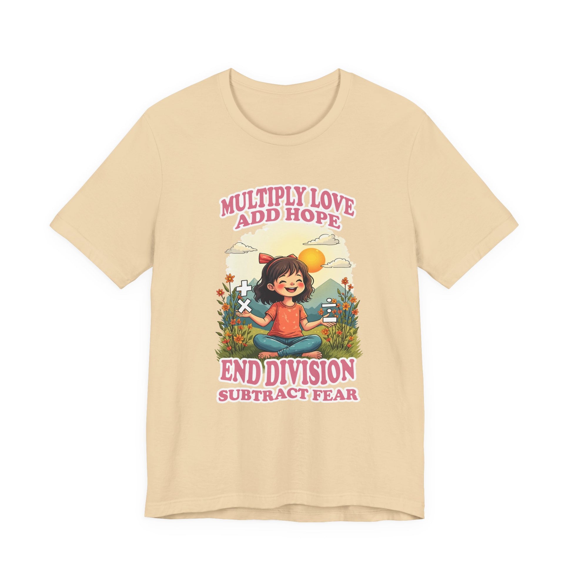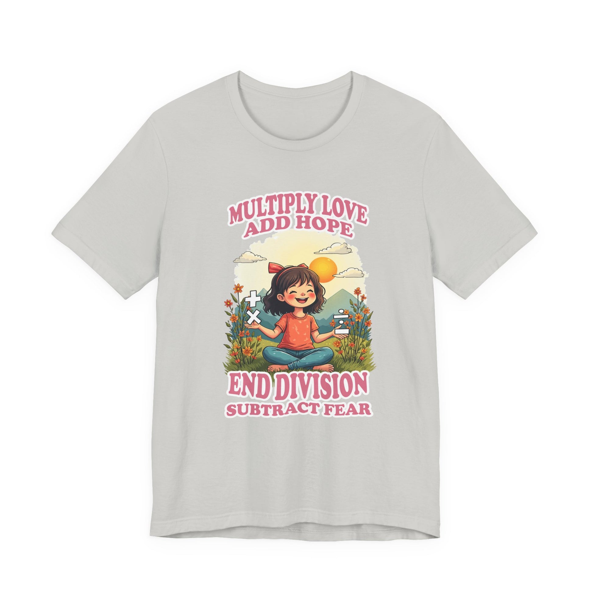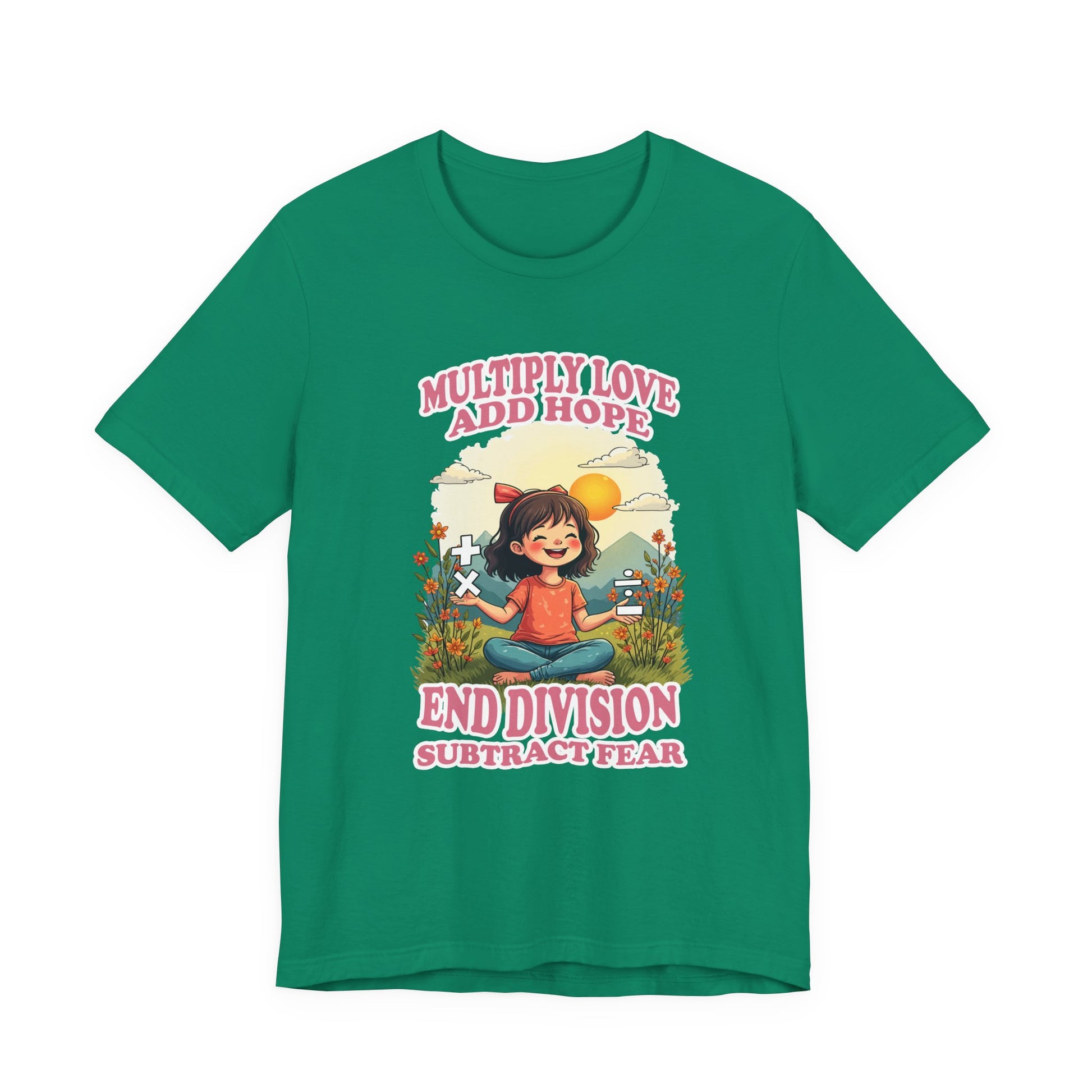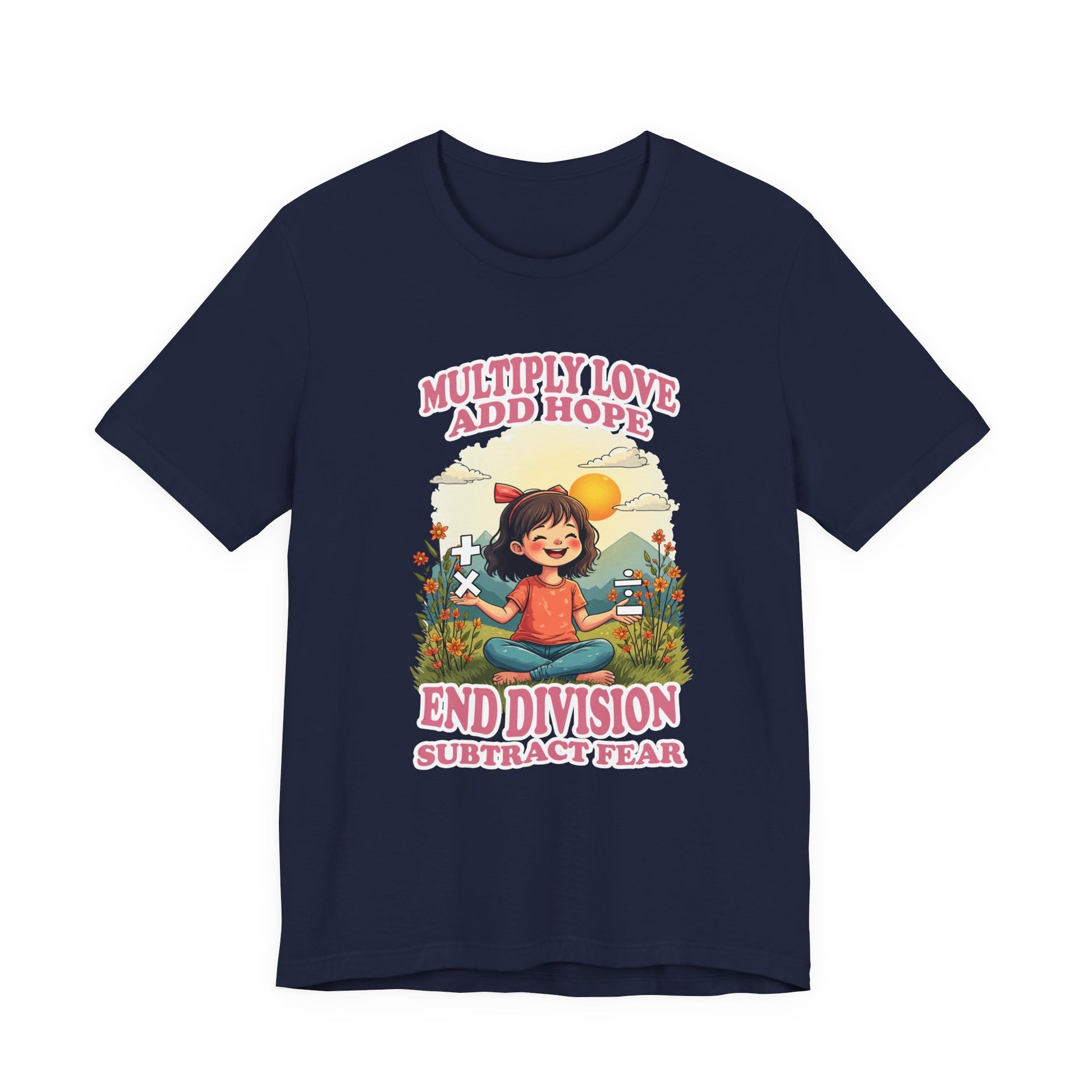 Spread positivity and empowerment with this uplifting tshirt featuring the message: "Multiply love and hope, End Division and Subtract fear." The graphic shows a joyful little girl sitting on a green field with flowers, her hands open wide—one hand holds the symbols for Multiply and Add, while the other holds Division and Subtraction. Behind her, mountains and sunshine create a hopeful, vibrant backdrop. This design uses colorful math symbols and a heartwarming scene to inspire kindness, unity, and courage, making it perfect for kids, educators, and anyone who believes in the power of positive thinking and math-inspired motivation.