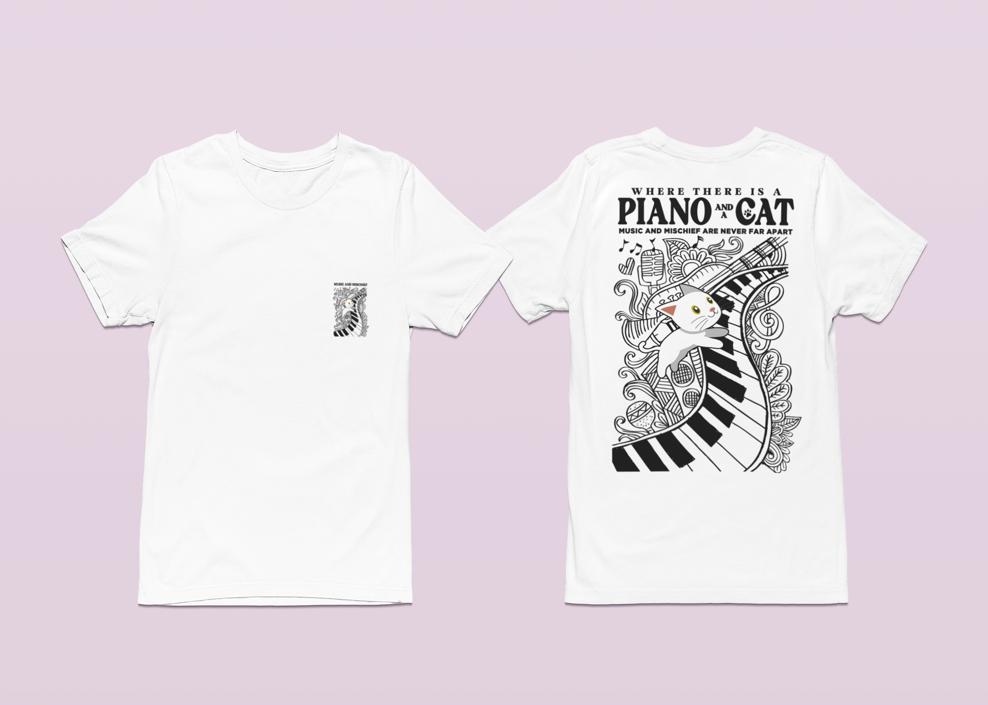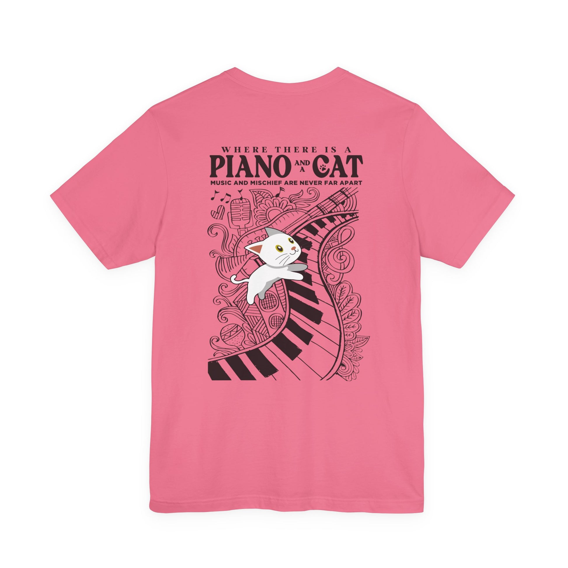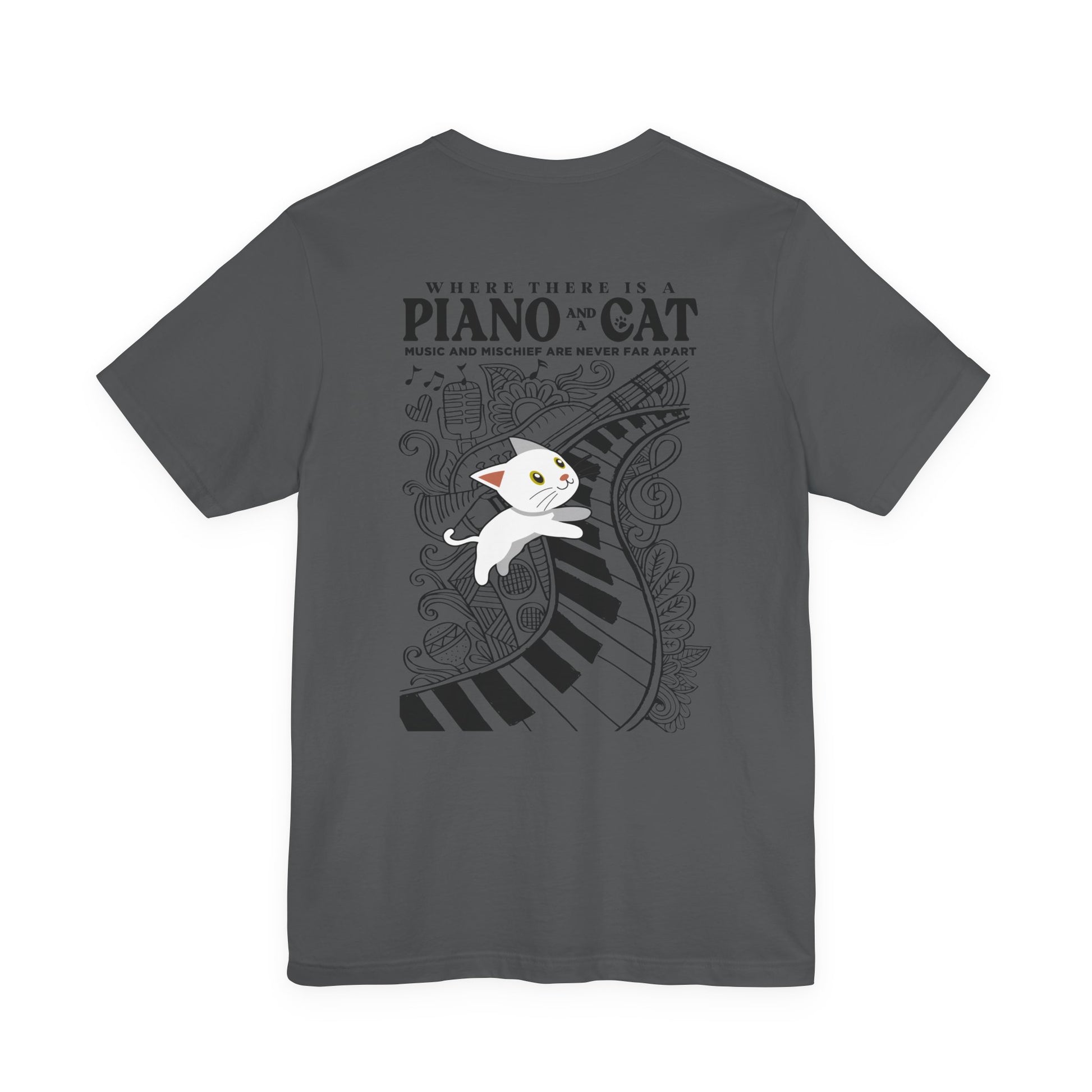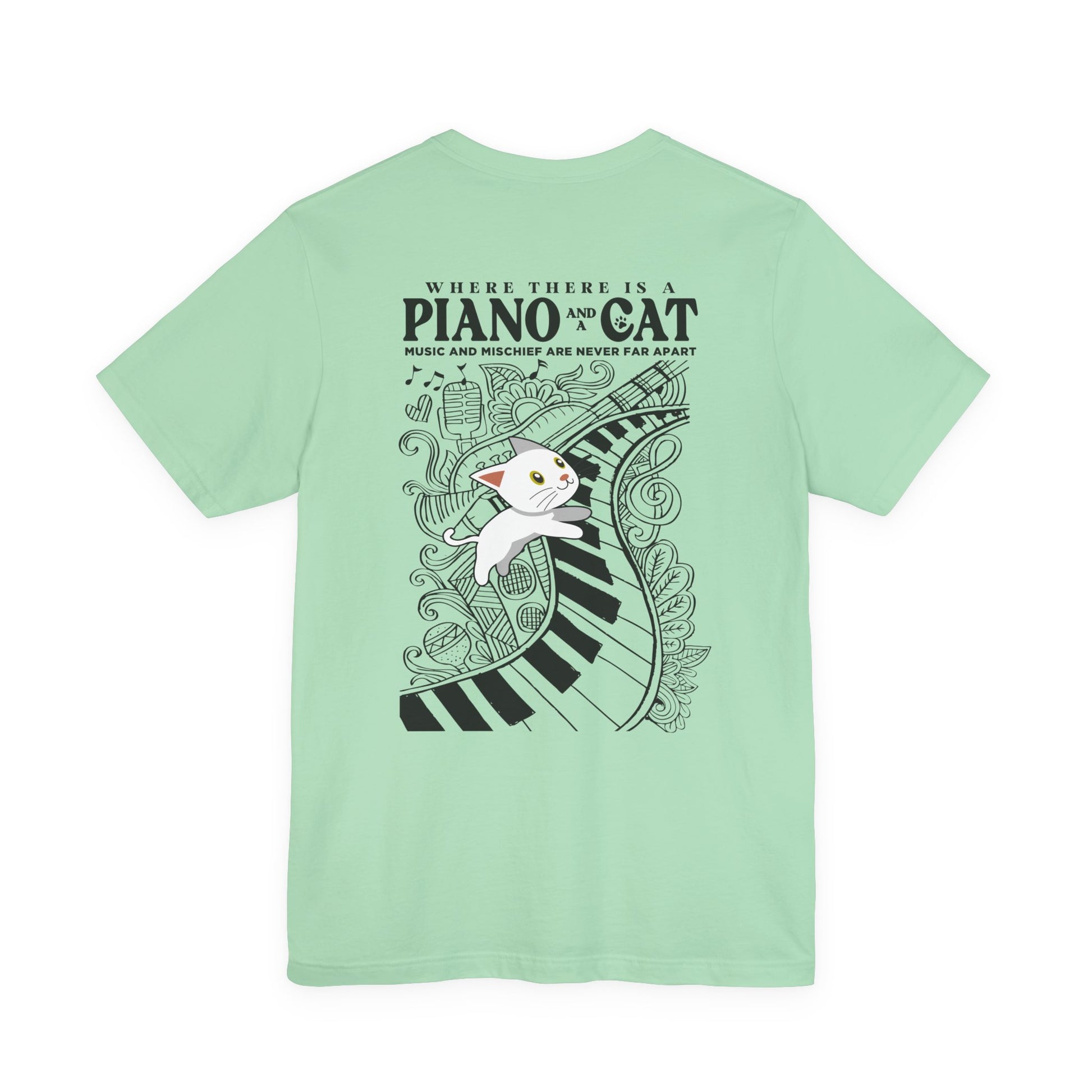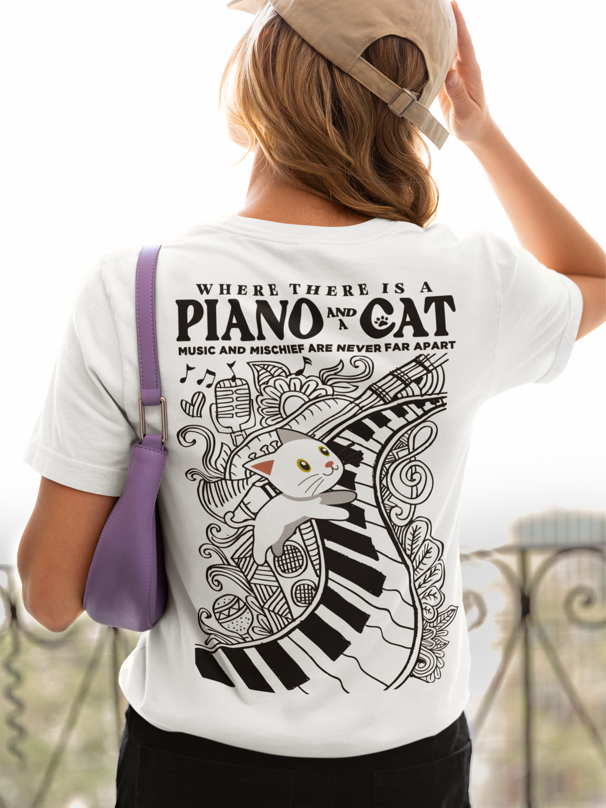 Music and Mischief T-Shirt – Piano and Playful Cat Graphic