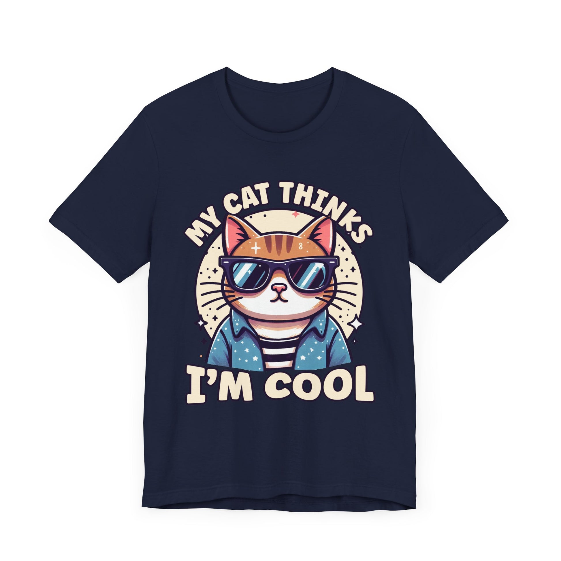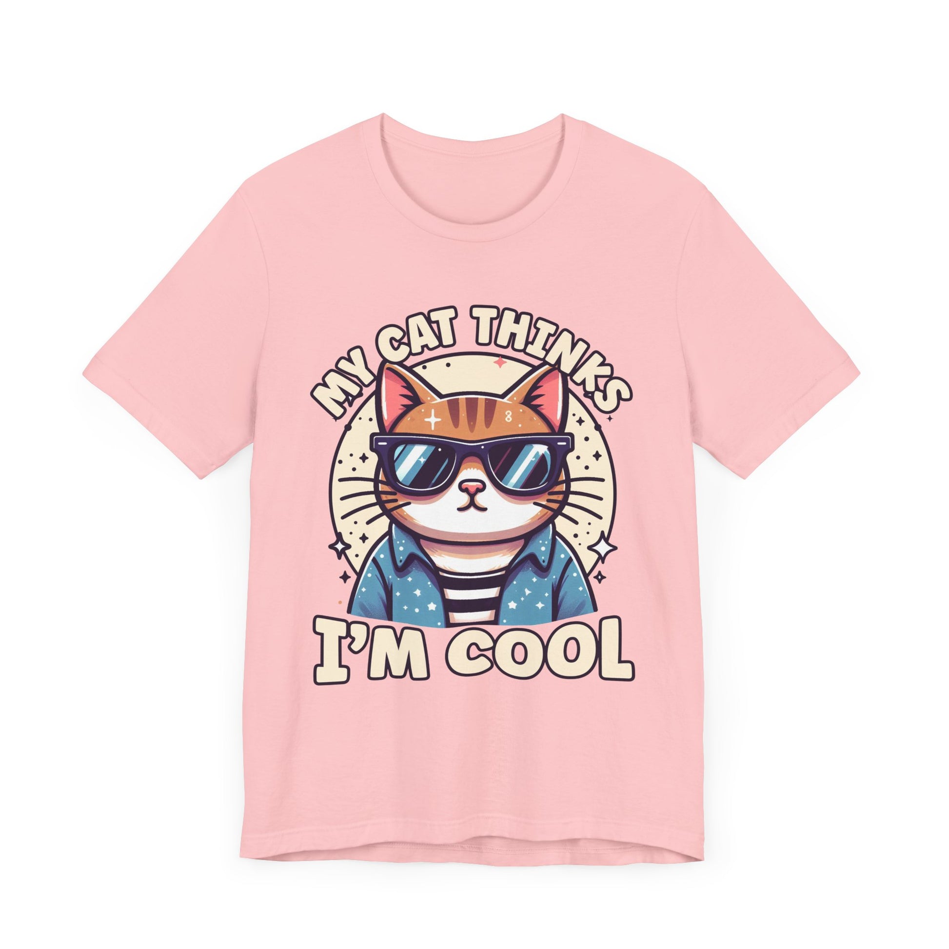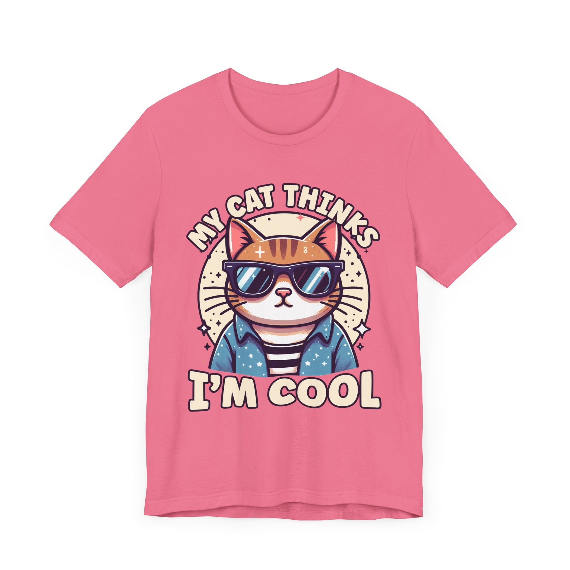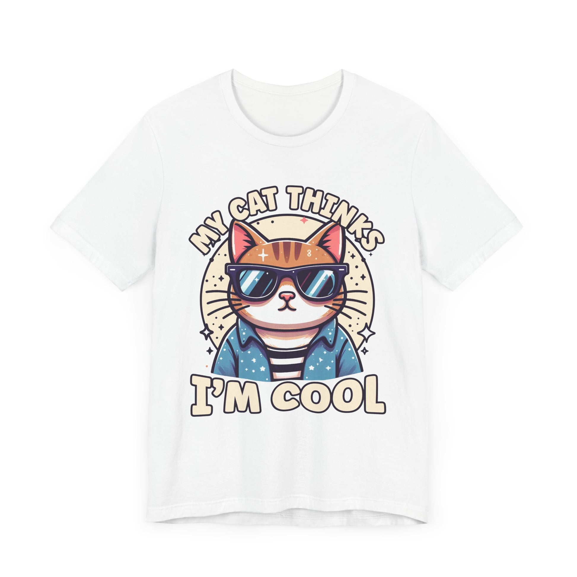 Show off your cat’s impeccable taste with this "My Cat Thinks I'm Cool" t-shirt featuring a serious-looking cat wearing stylish sunglasses right at the center. The design blends humor and feline attitude, perfectly capturing the cool, confident vibe cats are known for. This trendy tee is ideal for cat lovers who appreciate a bit of sass and style in their wardrobe. Made from soft, comfortable fabric, it’s great for casual wear or as a fun gift for any cat enthusiast.