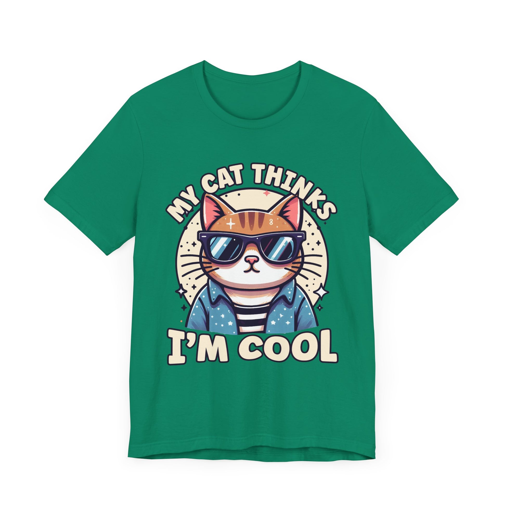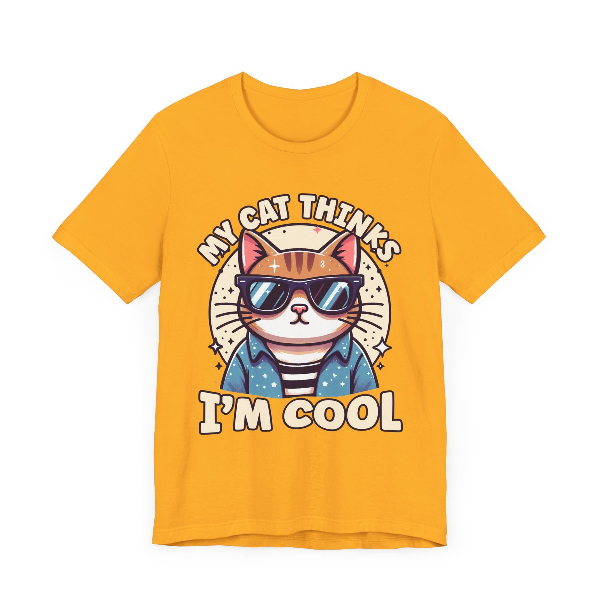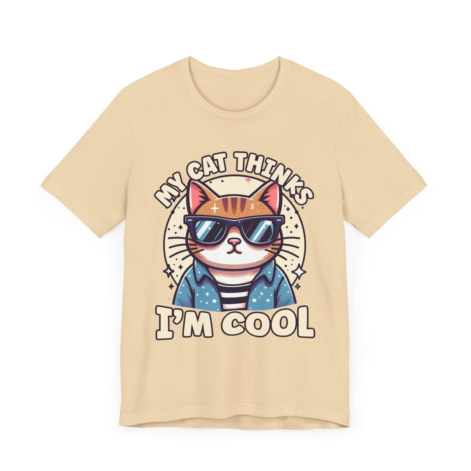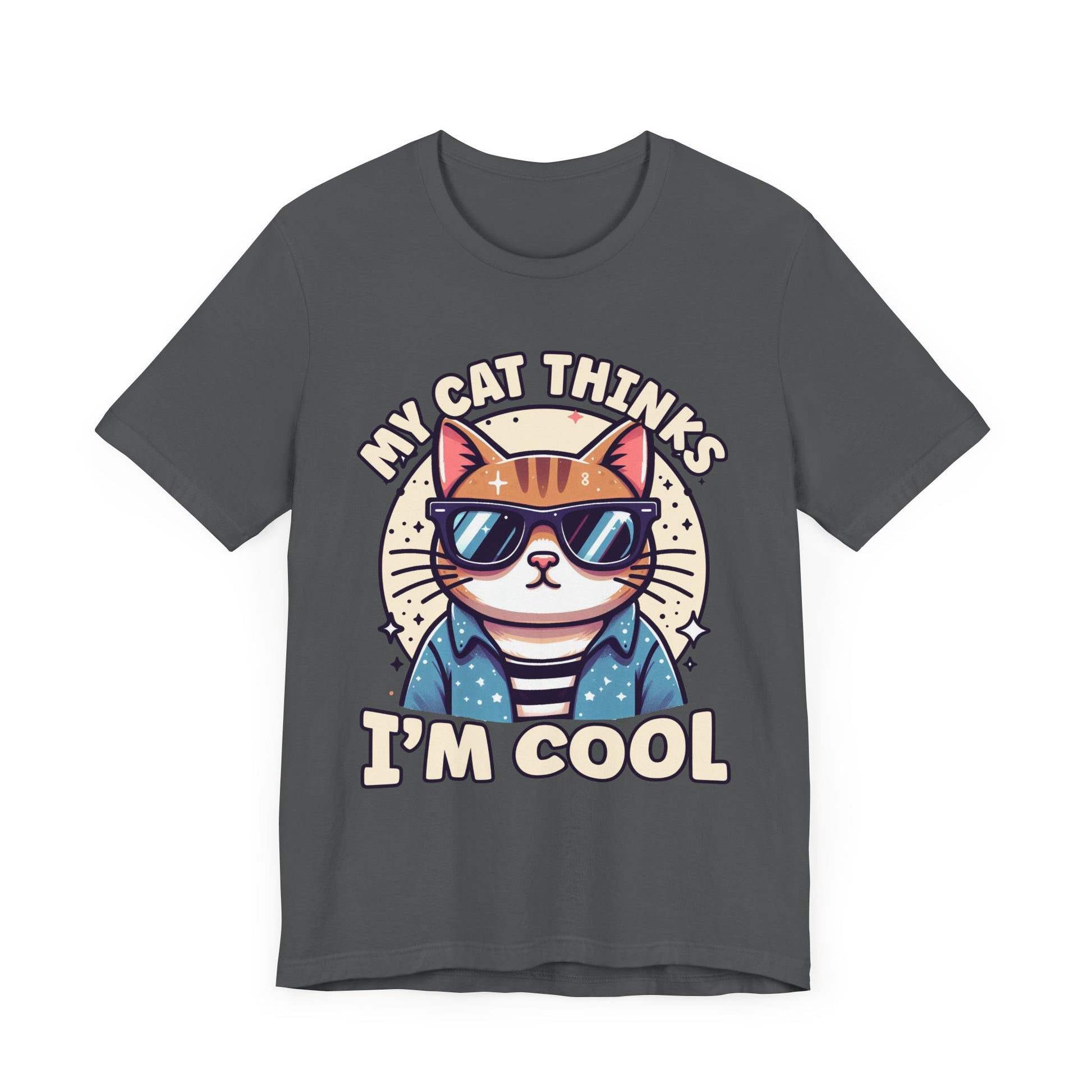 Show off your cat’s impeccable taste with this "My Cat Thinks I'm Cool" t-shirt featuring a serious-looking cat wearing stylish sunglasses right at the center. The design blends humor and feline attitude, perfectly capturing the cool, confident vibe cats are known for. This trendy tee is ideal for cat lovers who appreciate a bit of sass and style in their wardrobe. Made from soft, comfortable fabric, it’s great for casual wear or as a fun gift for any cat enthusiast.