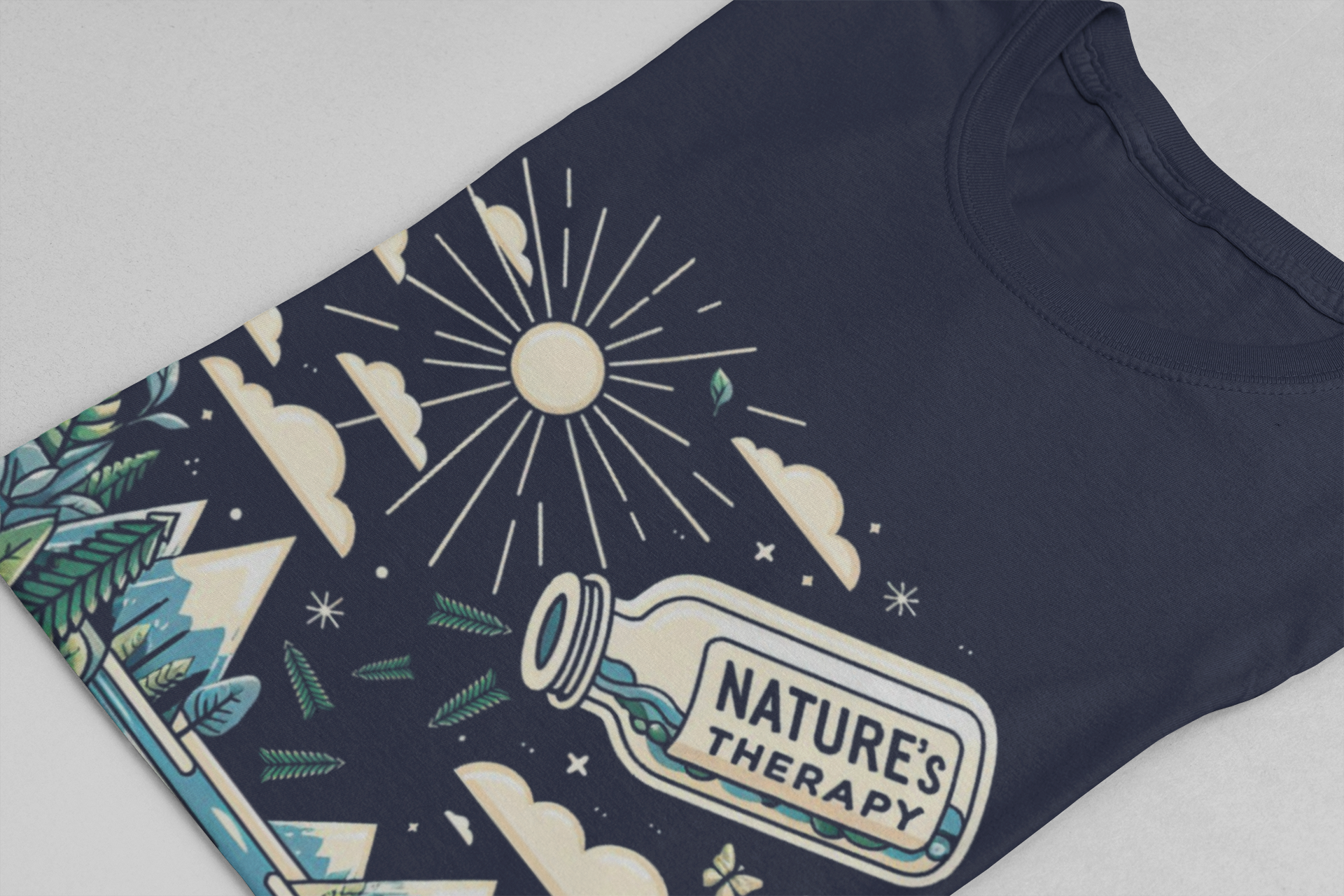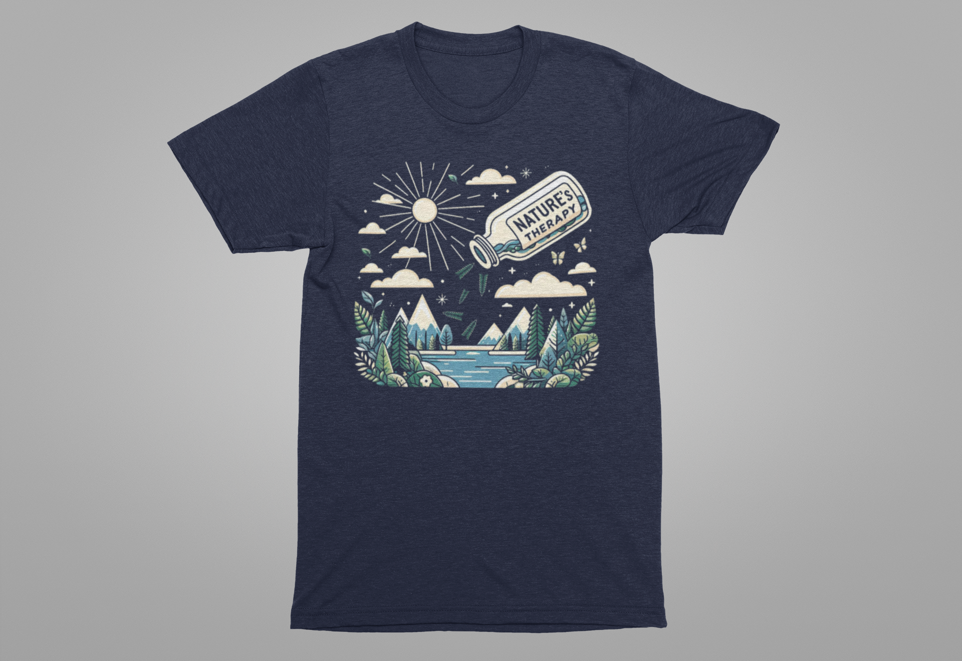 Immerse yourself in the healing power of nature with this "Nature’s Therapy" t-shirt. The graphic features a bottle pouring its contents into a serene lake, surrounded by lush green vegetation and illuminated by a bright sun overhead. This design symbolizes the restorative effect of nature—like a bottled remedy for the soul—inviting you to embrace tranquility and natural beauty. Perfect for outdoor lovers, wellness enthusiasts, or anyone who finds peace in nature’s embrace. Made from soft, comfortable fabric, it’s ideal for casual wear, nature walks, or as a thoughtful gift.