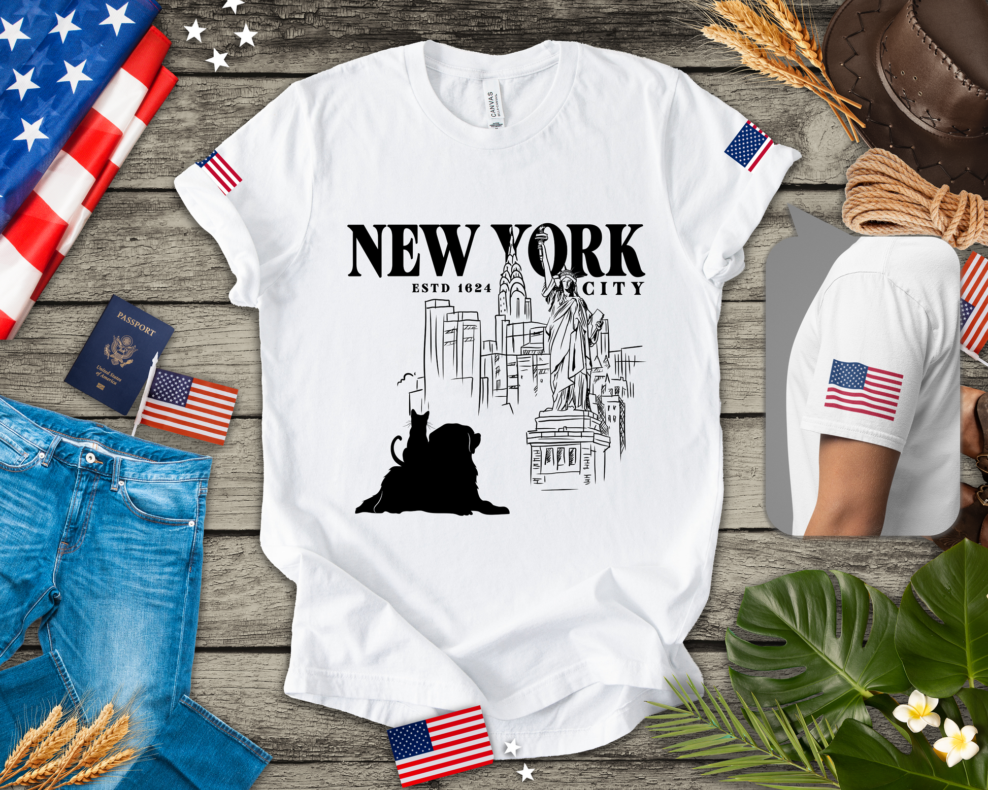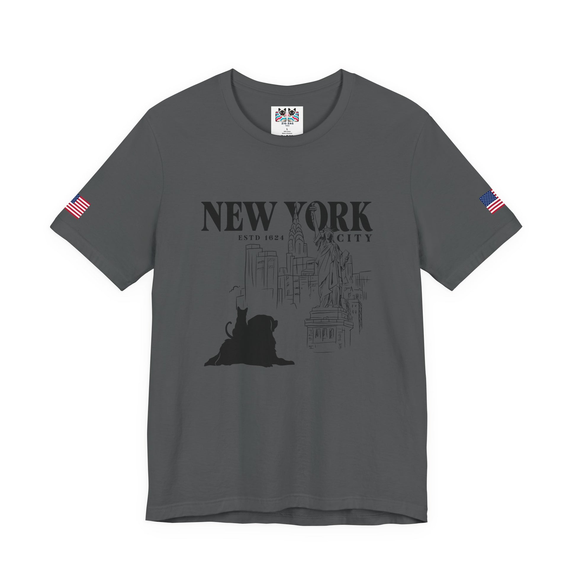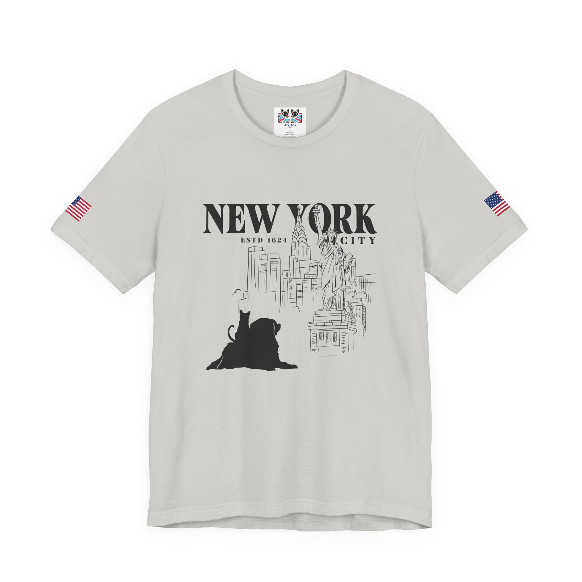 This artistic New York City t-shirt features a charming hand-drawn sketch aesthetic with "NEW YORK ESTD 1624 CITY" text, the Statue of Liberty, Chrysler Building, Brooklyn Bridge, and other NYC landmarks - all accompanied by an adorable black cat and dog silhouette sitting in the foreground. The sketch-style line art gives this design a unique, artistic quality perfect for cat lovers, NYC enthusiasts, artists, and those who appreciate hand-drawn illustrations. The cat adds a playful, whimsical element to the classic NYC imagery. This white t-shirt with American flag sleeve patches is ideal for creative individuals, art students, urban sketchers, or anyone who loves combining their passion for cats with New York City culture and history.