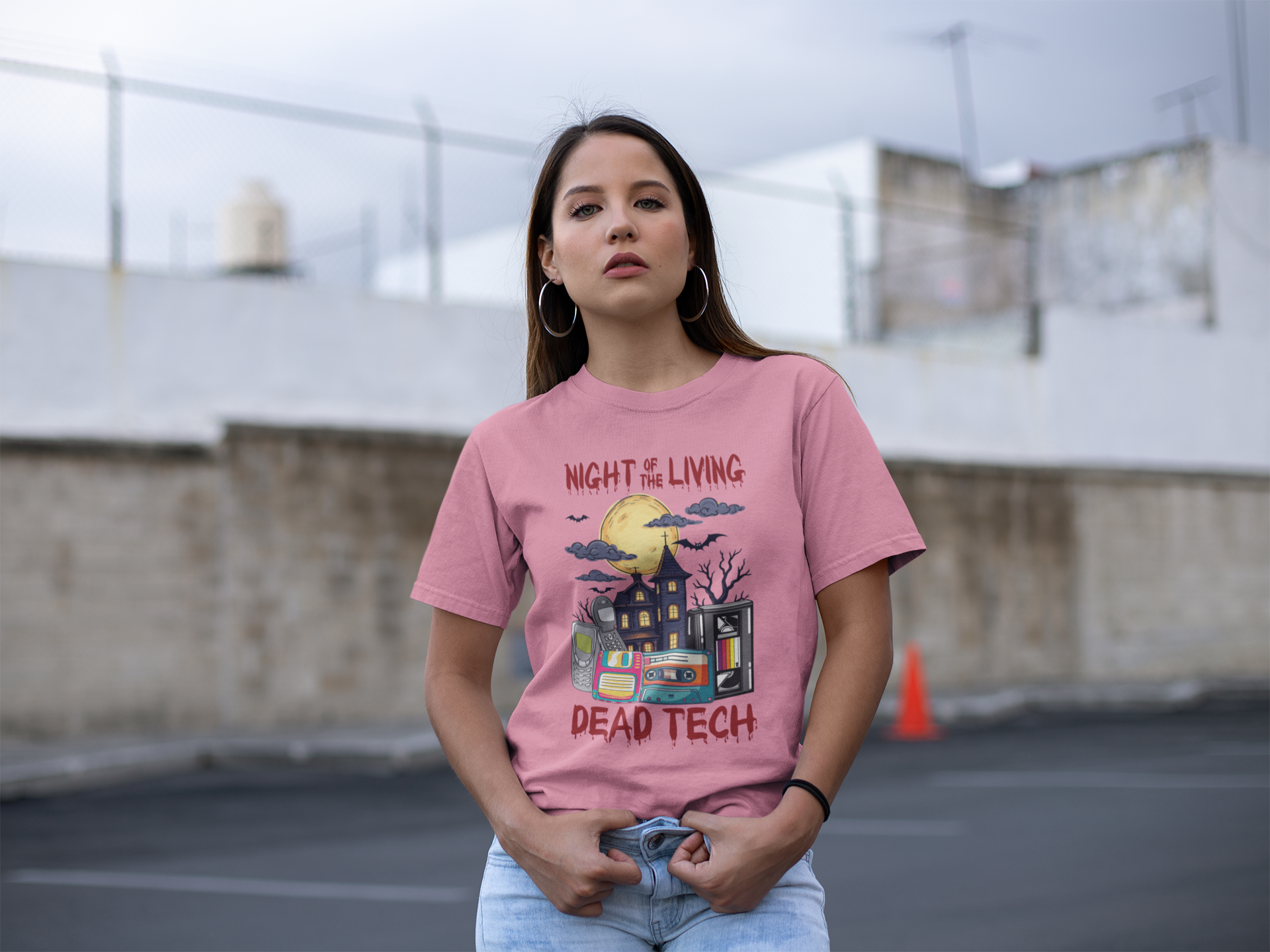 This eerie tshirt features a haunted building framed by a large full moon, dark swirling clouds, and bats flying in the night sky. In the foreground, old outdated gadgets like bulky mobile phones, floppy disks, tape recorders, and video recorders create a nostalgic tech graveyard. The ominous red bleeding text "Night of the Living, Dead Tech" completes the horror-inspired design, perfect for fans of classic horror and vintage technology nostalgia.