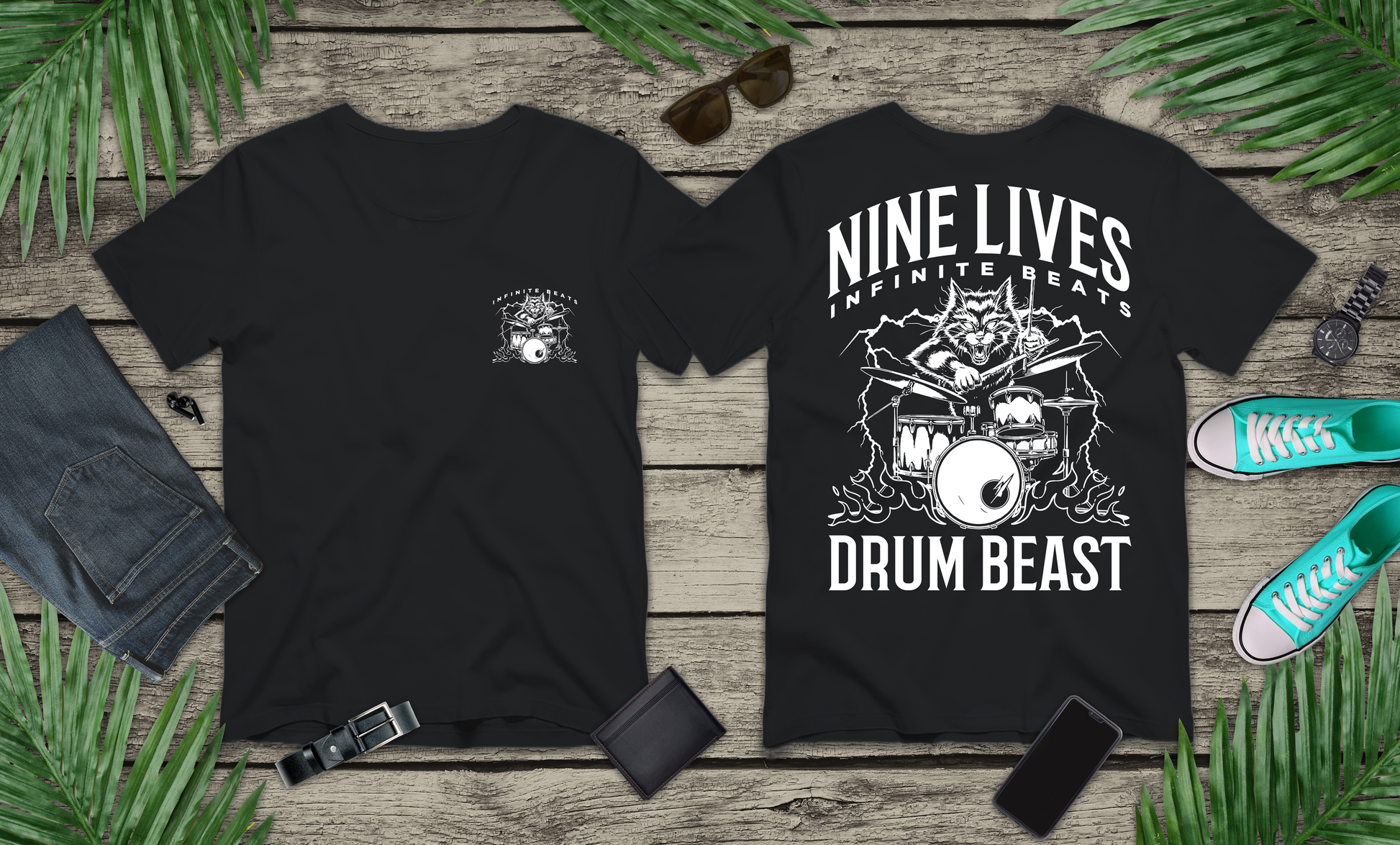 Nine Lives Infinite Beats DRUM BEAST T-Shirt – Furious Car Drum Machine Graphic