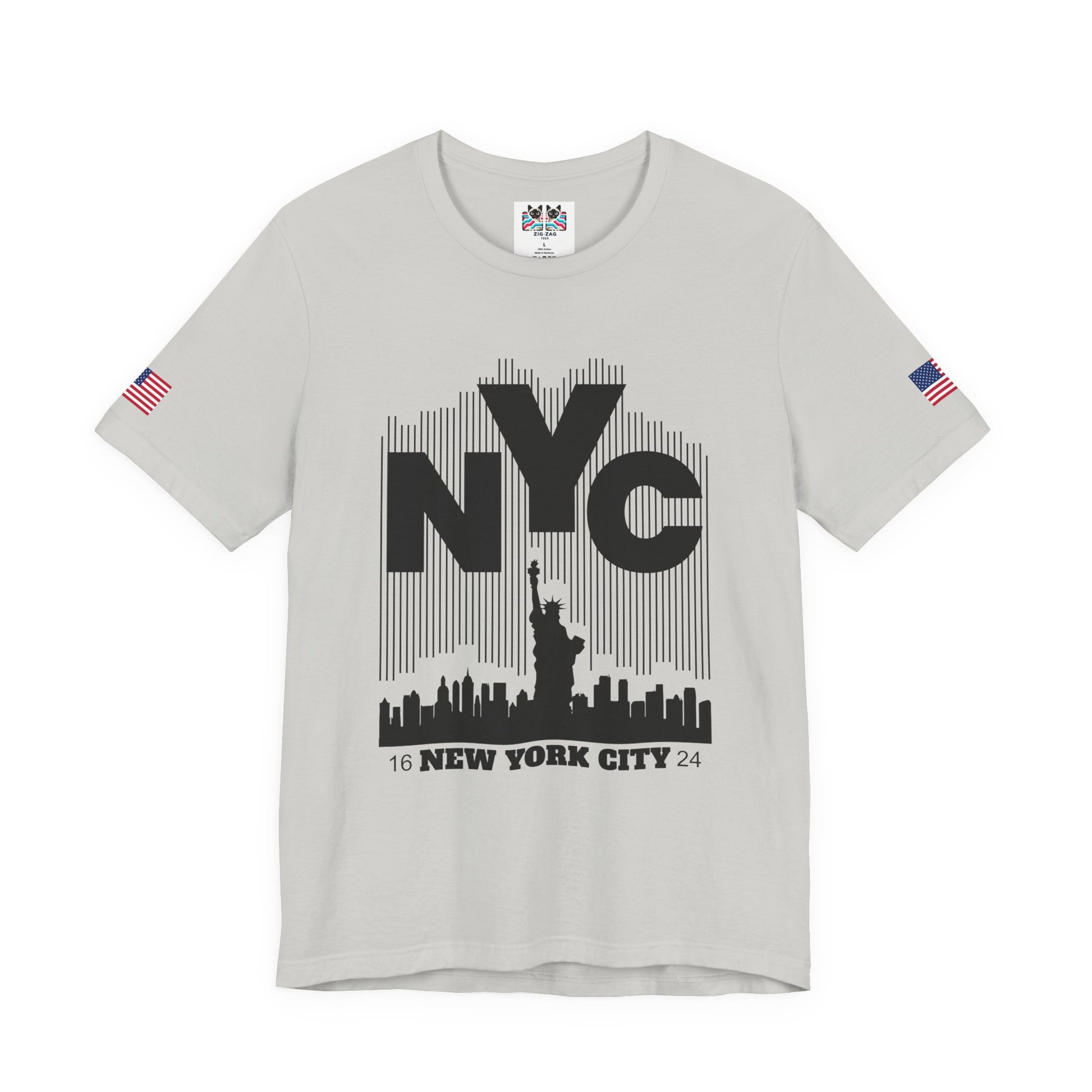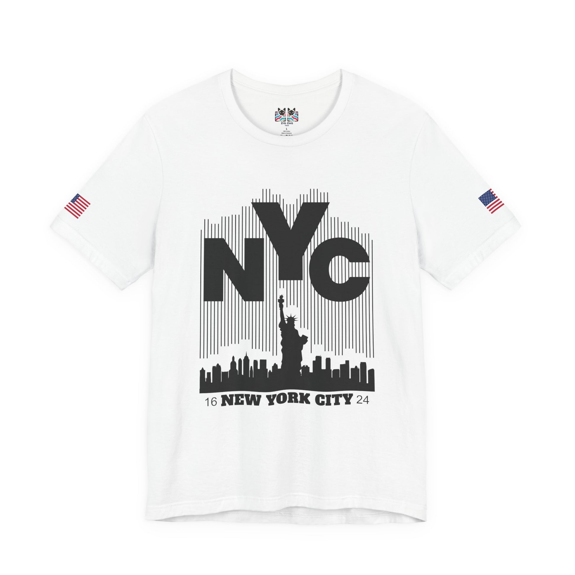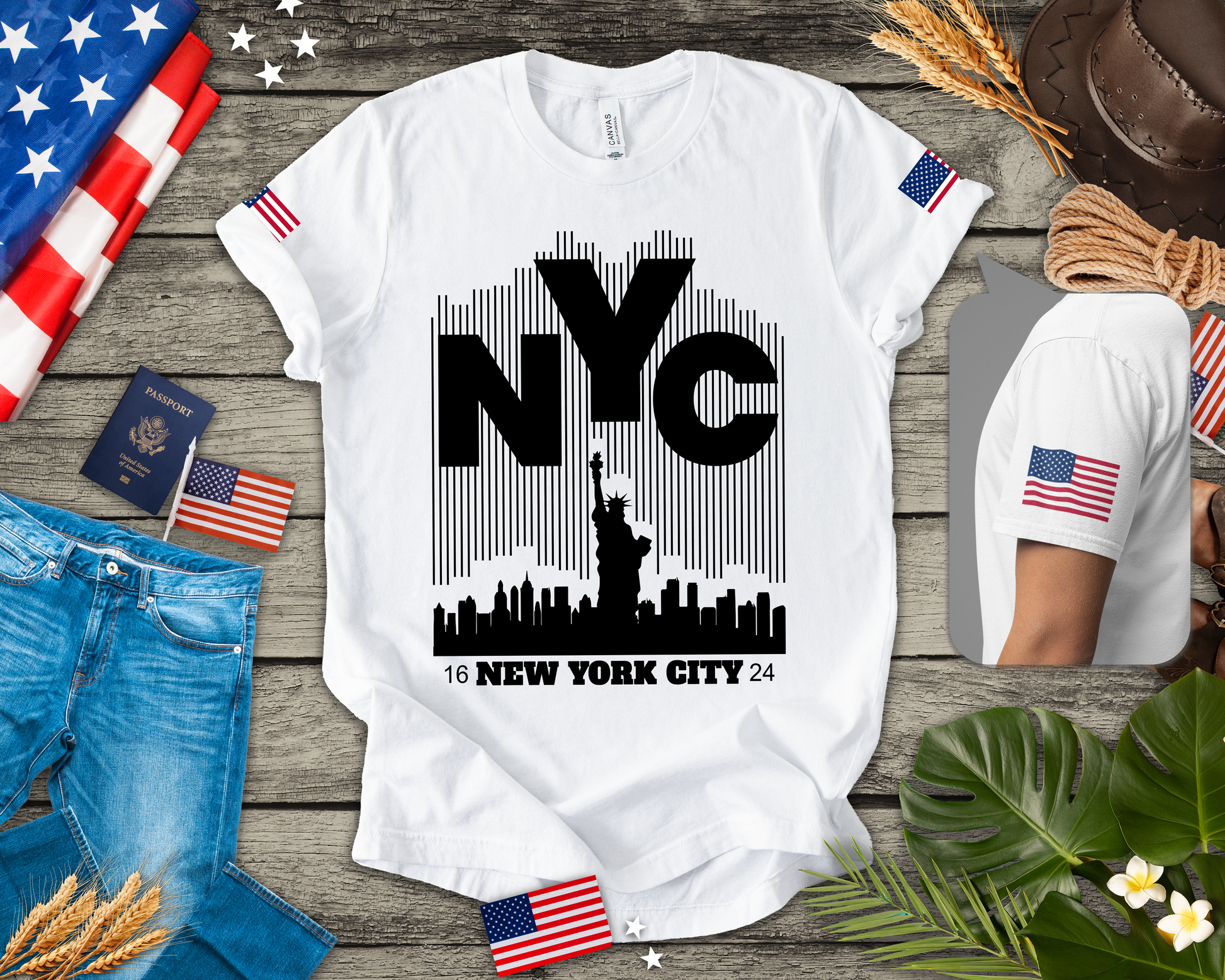 Make a contemporary statement with this unique NYC barcode-inspired t-shirt! The modern design features "NYC" in bold letters with vertical line patterns creating a barcode/stripe effect, along with the Statue of Liberty and Manhattan skyline silhouette below. The text "16 NEW YORK CITY 24" references the founding year 1624 in a creative split format. The black and white minimalist aesthetic with clean lines appeals to modern design enthusiasts, tech-savvy New Yorkers, graphic designers, or anyone who appreciates contemporary urban art. This white t-shirt with American flag sleeve patches represents NYC in a fresh, innovative way - perfect for the modern metropolis that's always evolving. Great for art students, design professionals, trendy urbanites, or those who want NYC style that's different from traditional tourist designs. The barcode element adds an edgy, urban contemporary vibe.